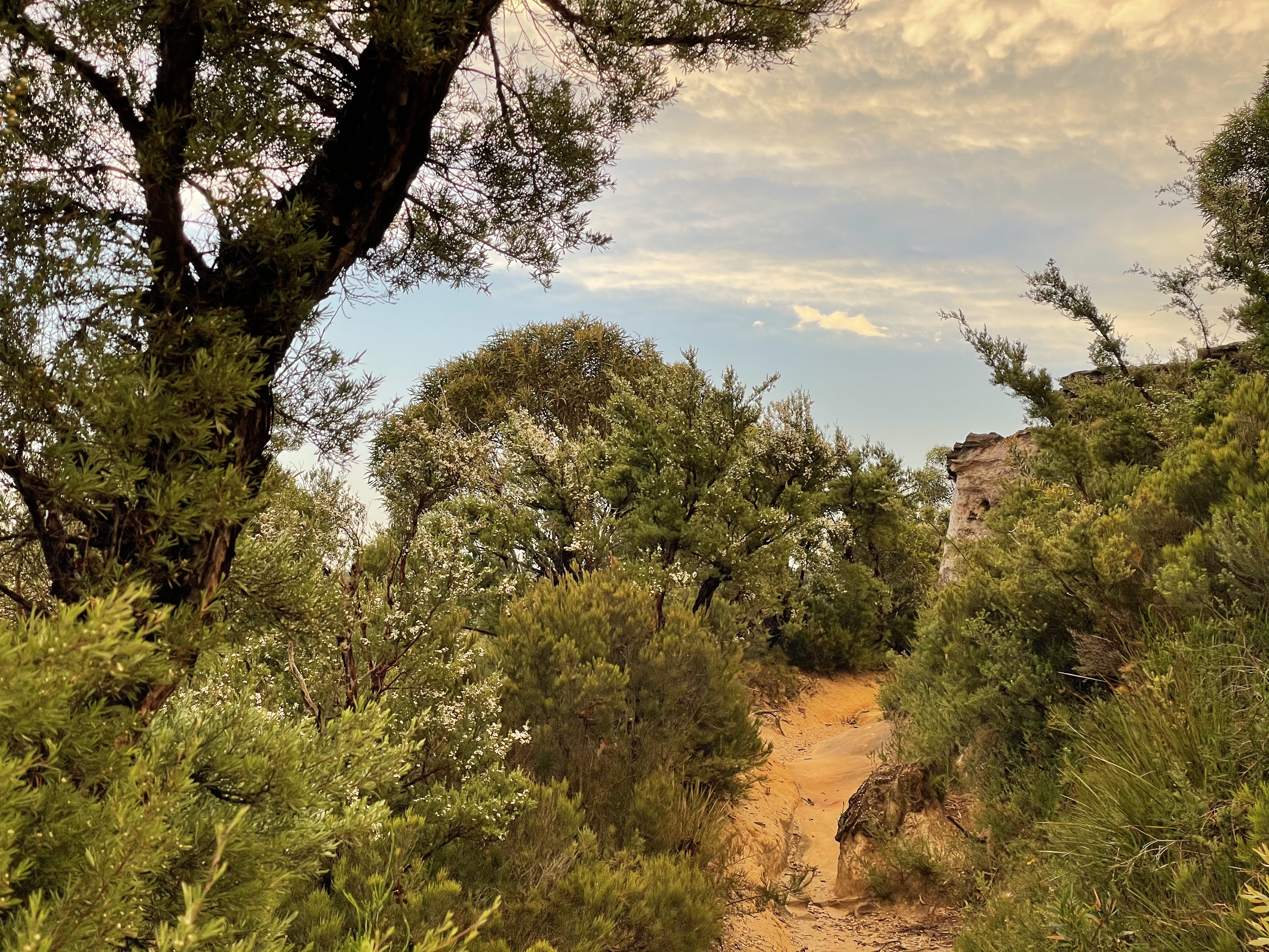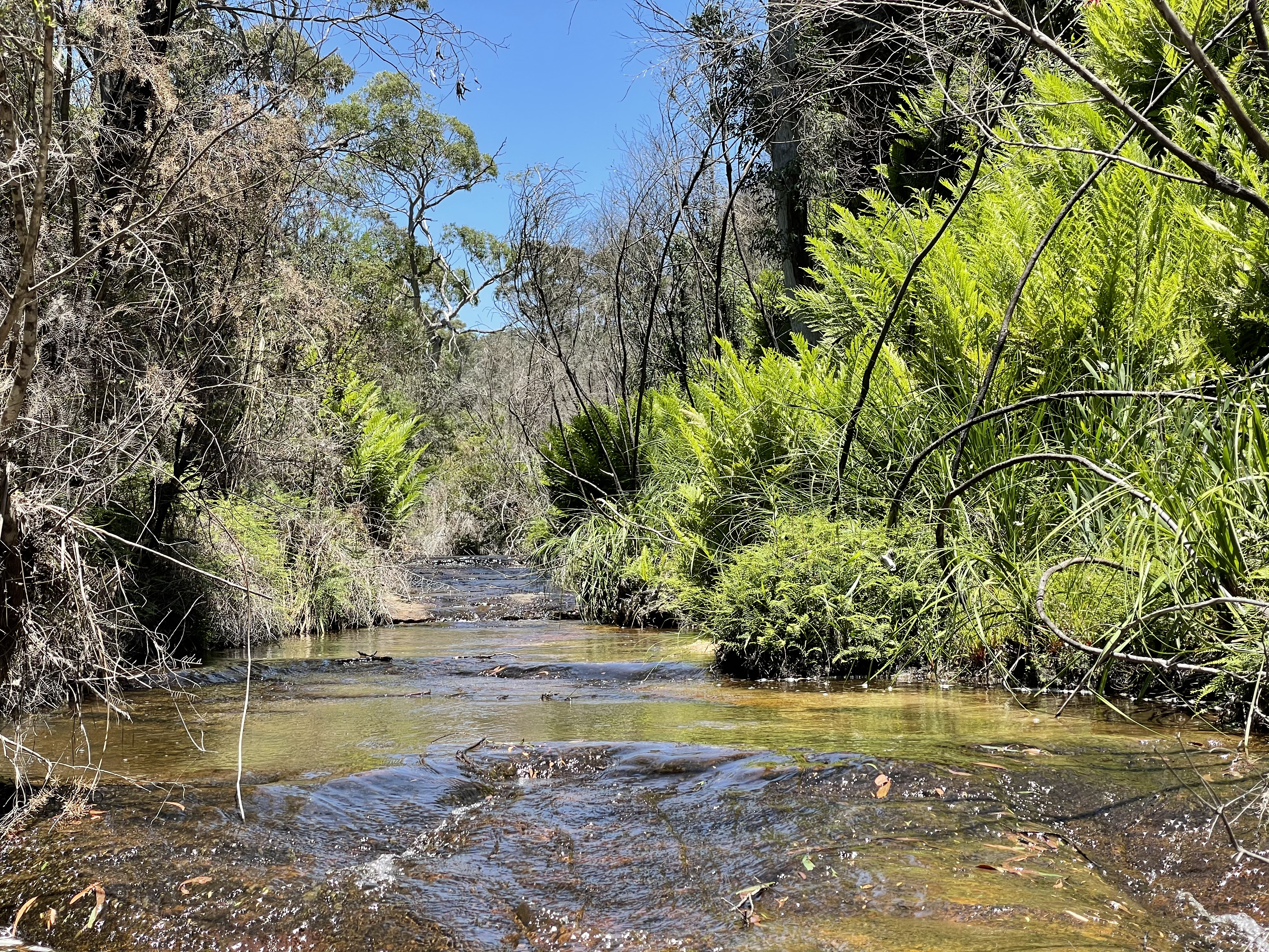 The overgrown path lead down, down, down neatly chiseled sandstone stairs. Twisting and turning down through the remains of banksias and stunted mallee scrub, fallen trees and past a giant anthill. Down, down, down until we reached Govett’s Leap Brook. Although it was much lower than usual, this time last year it was completely dry. Today this little oasis seemed all the more precious amongst the recovering forest.