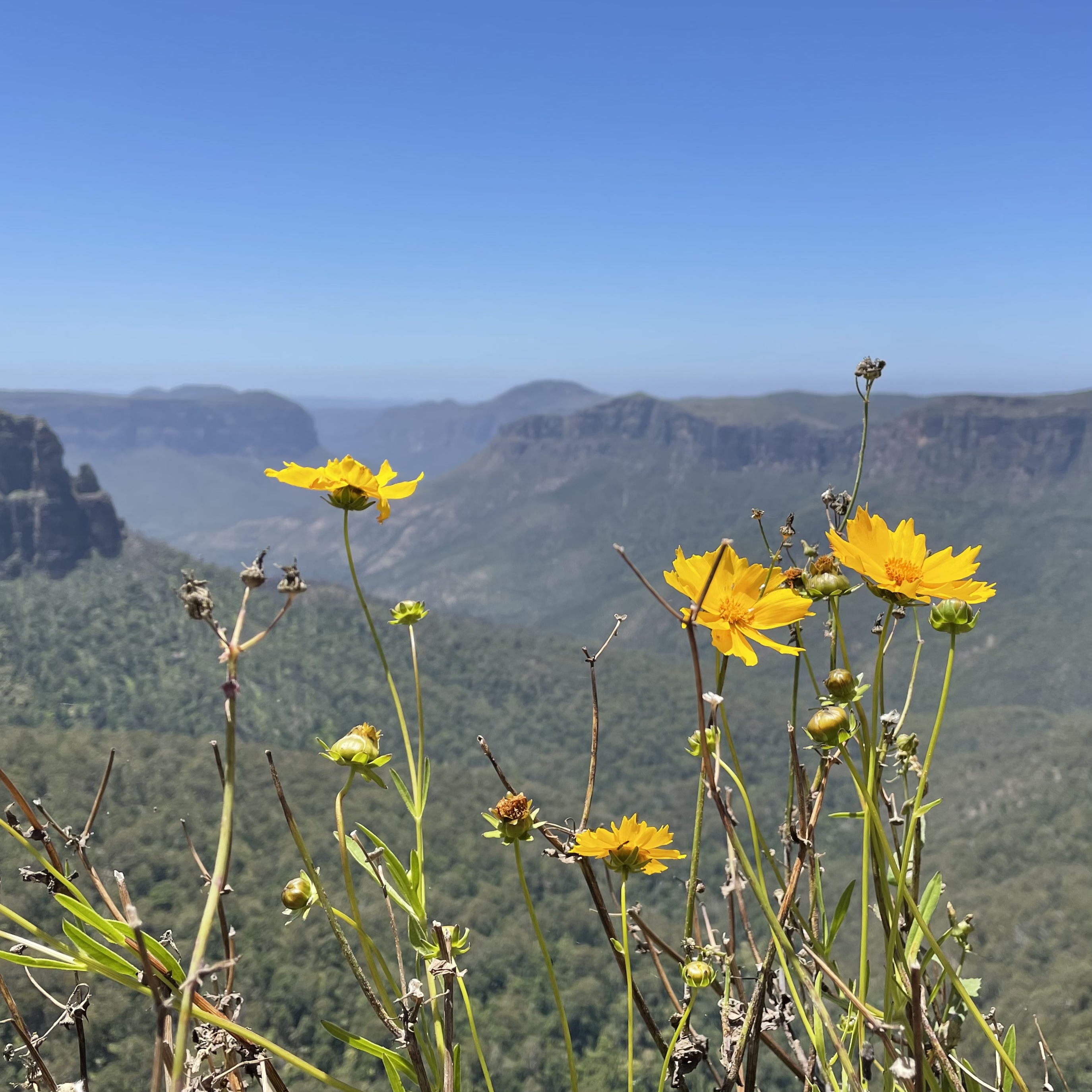 The heat of the mid-day sun combined with the eucalyptus haze bleached the landscape into its familiar pastel blues. Gazing across the vast gorge of basalt cliffs and layers of blue ridge lines, denuded by bushfire, we took in the changes to this scared and ancient land. Looking beyond the burnout forest, a carpet of green is coming through. And on the first official day of summer a few late wild flowers lingered in the sun.
