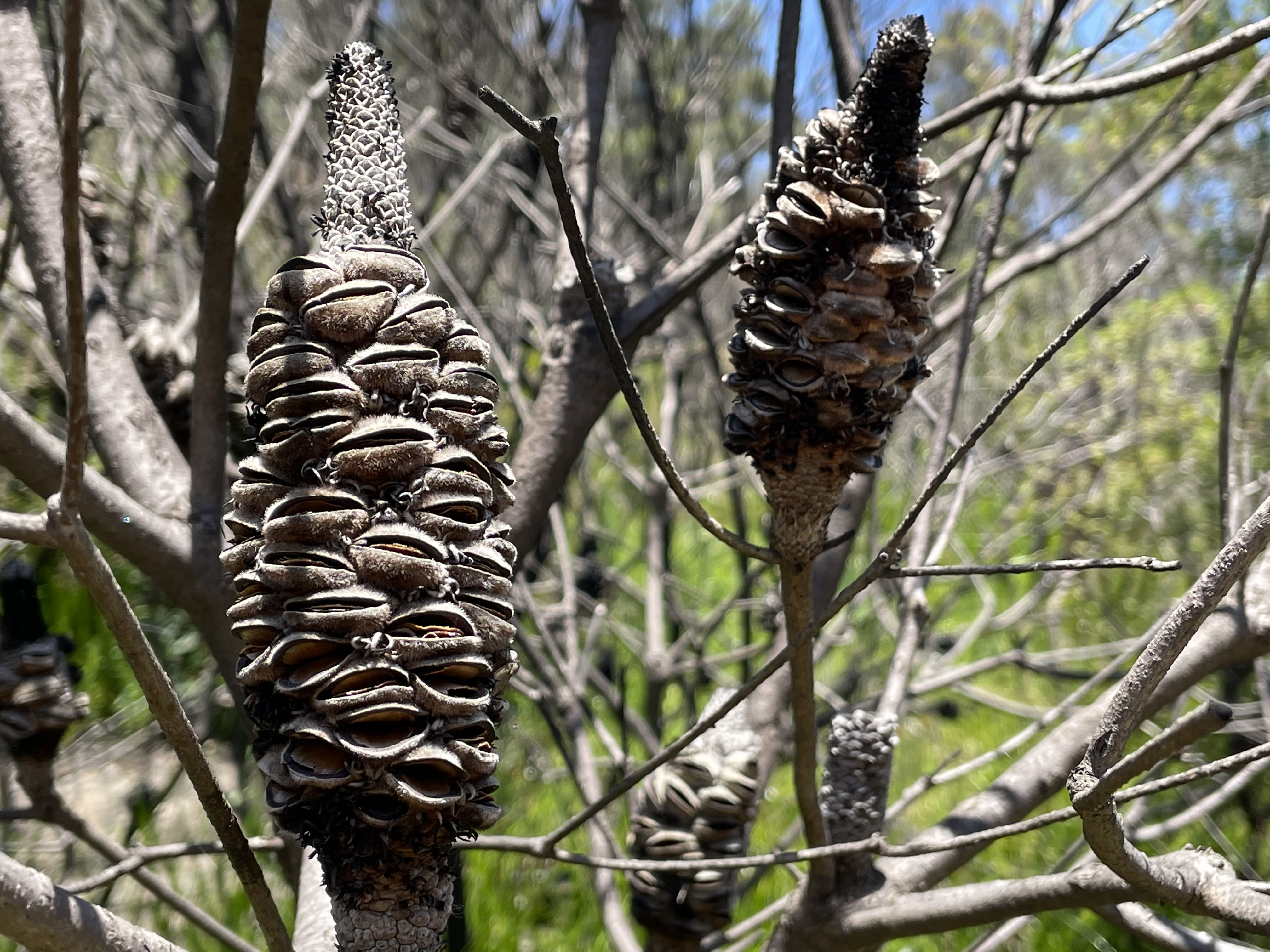 “The Banksia pods have opened” noticed Dave stepping around burnt branches. Their woody seed pods open during or after a bushfire to release their seeds into a post-fire environment. We can’t help feeling down about the devastation around us, yet this native forest seems designed for fire. And it’s heartening to witness it’s recovery.