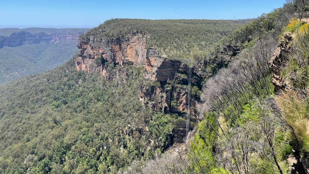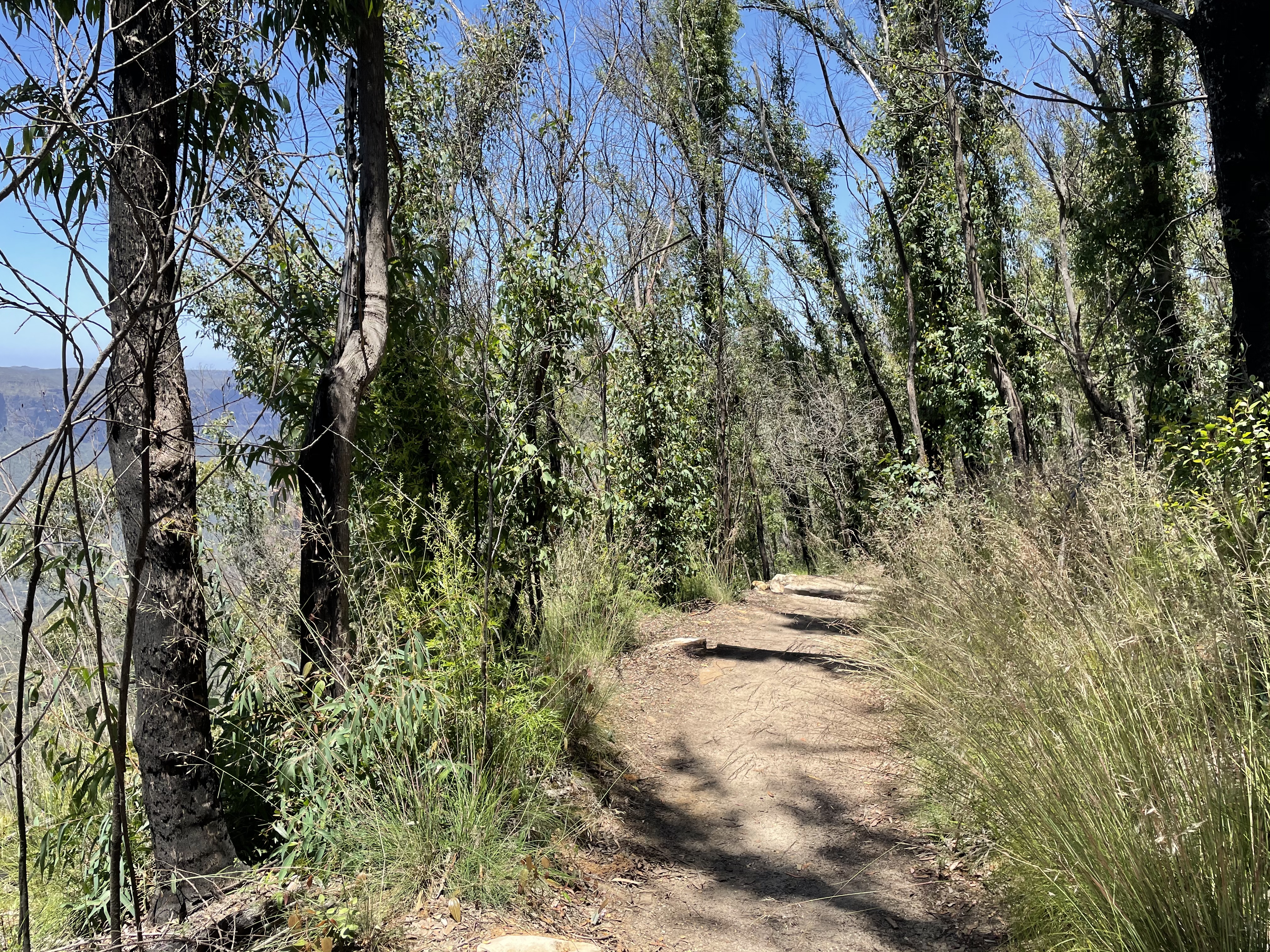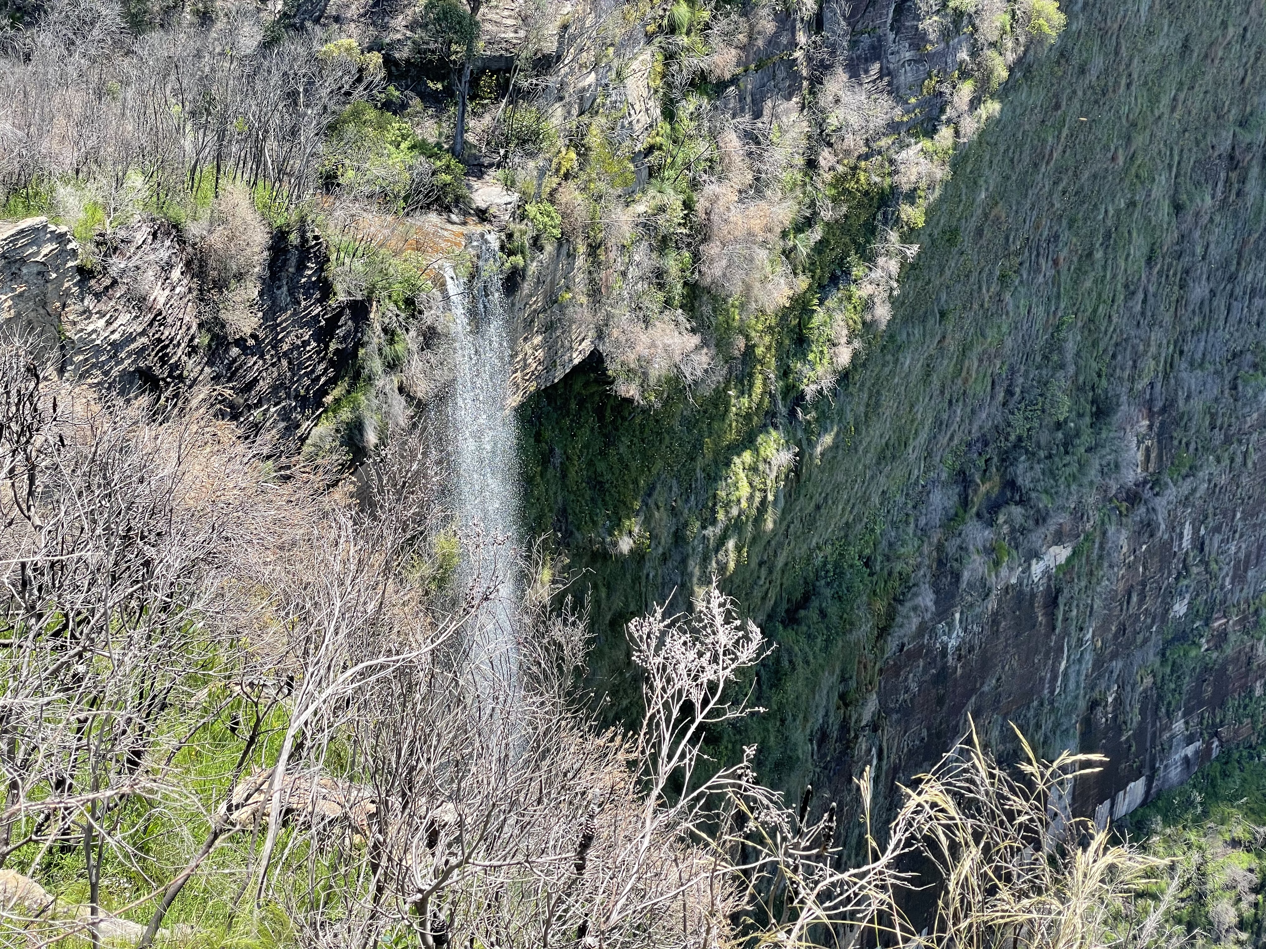 Crossing the stepping stones the path climbed and turned a corner opening out to the Barrow Lookout. Looking back towards Govett’s Leap is a dramatic view of the waterfall and hanging gardens clinging to the cliff face. We can’t go any further from here, the path being closed for bushfire recovery works.