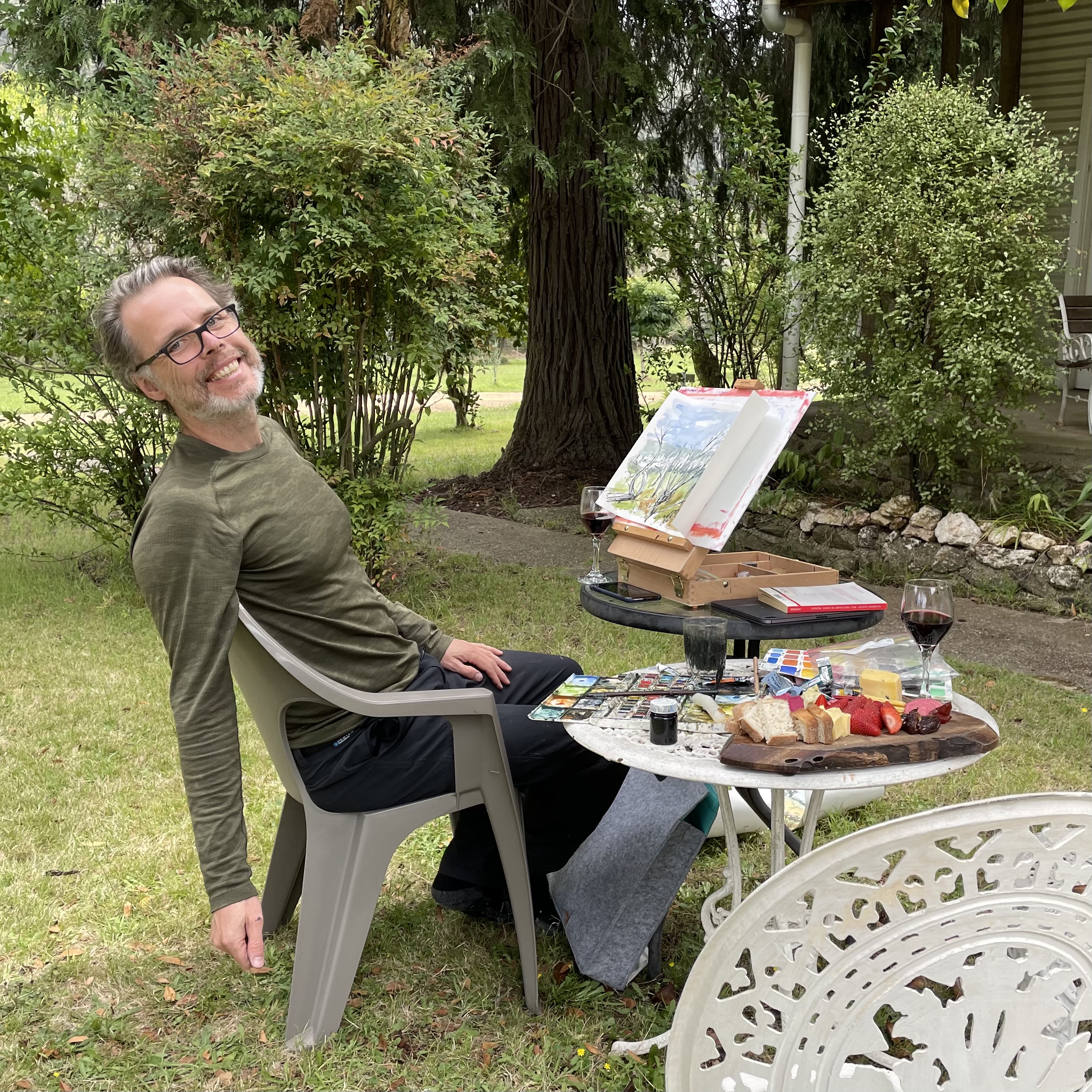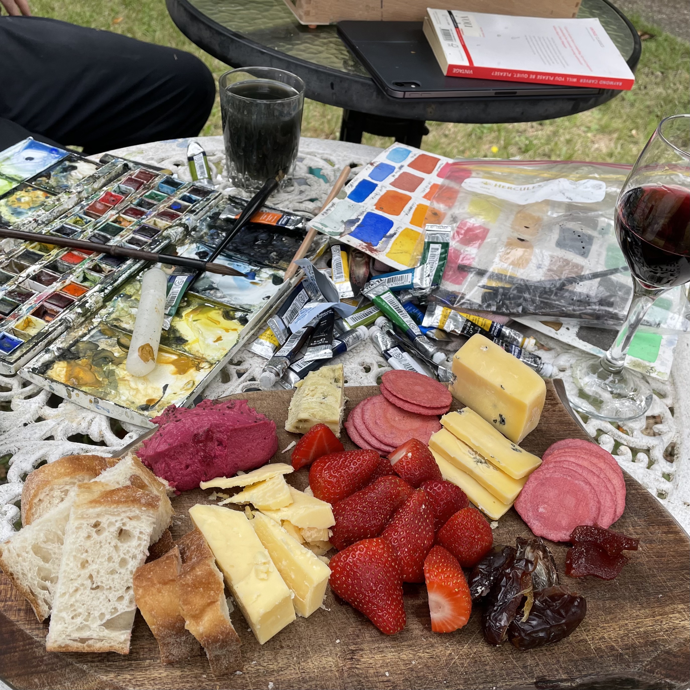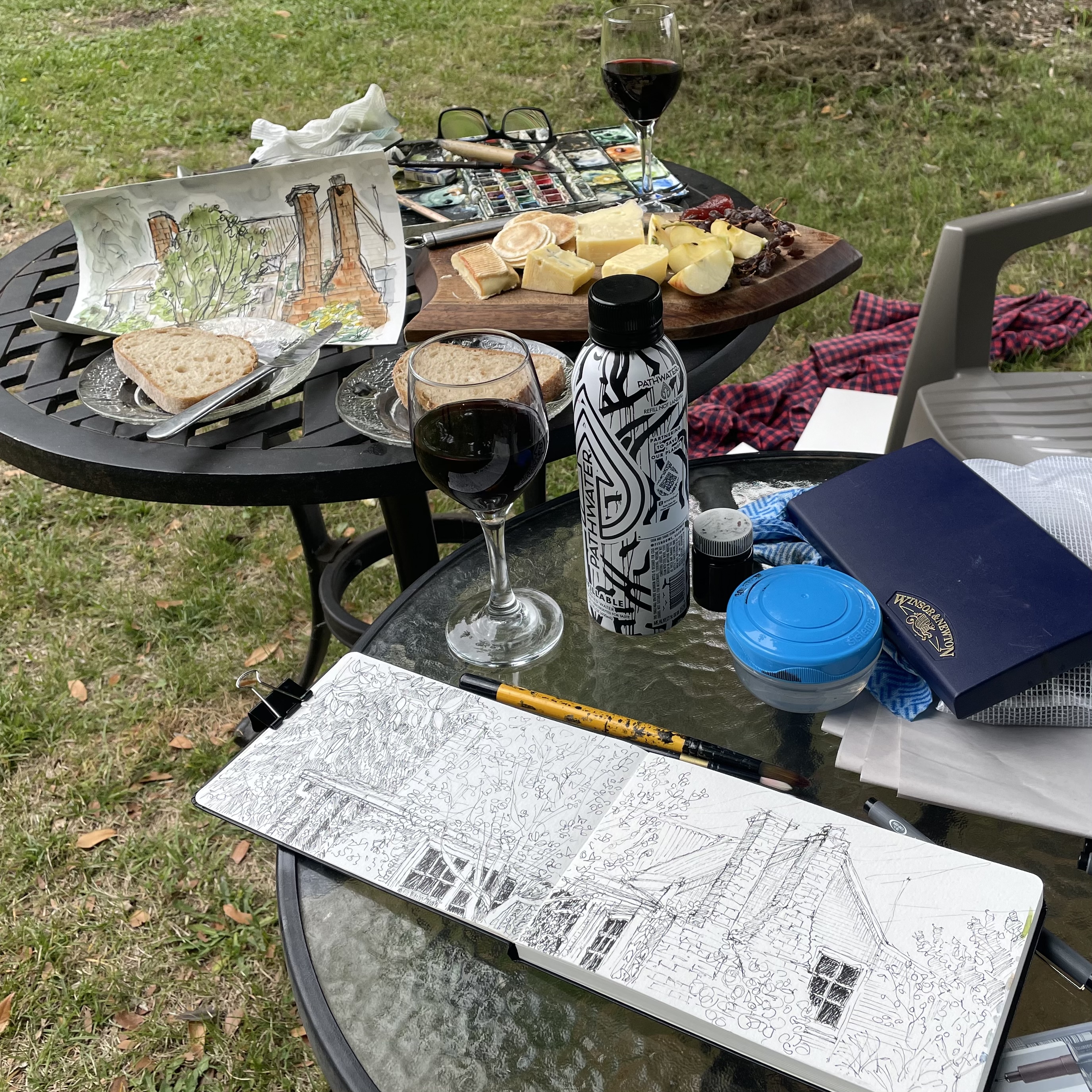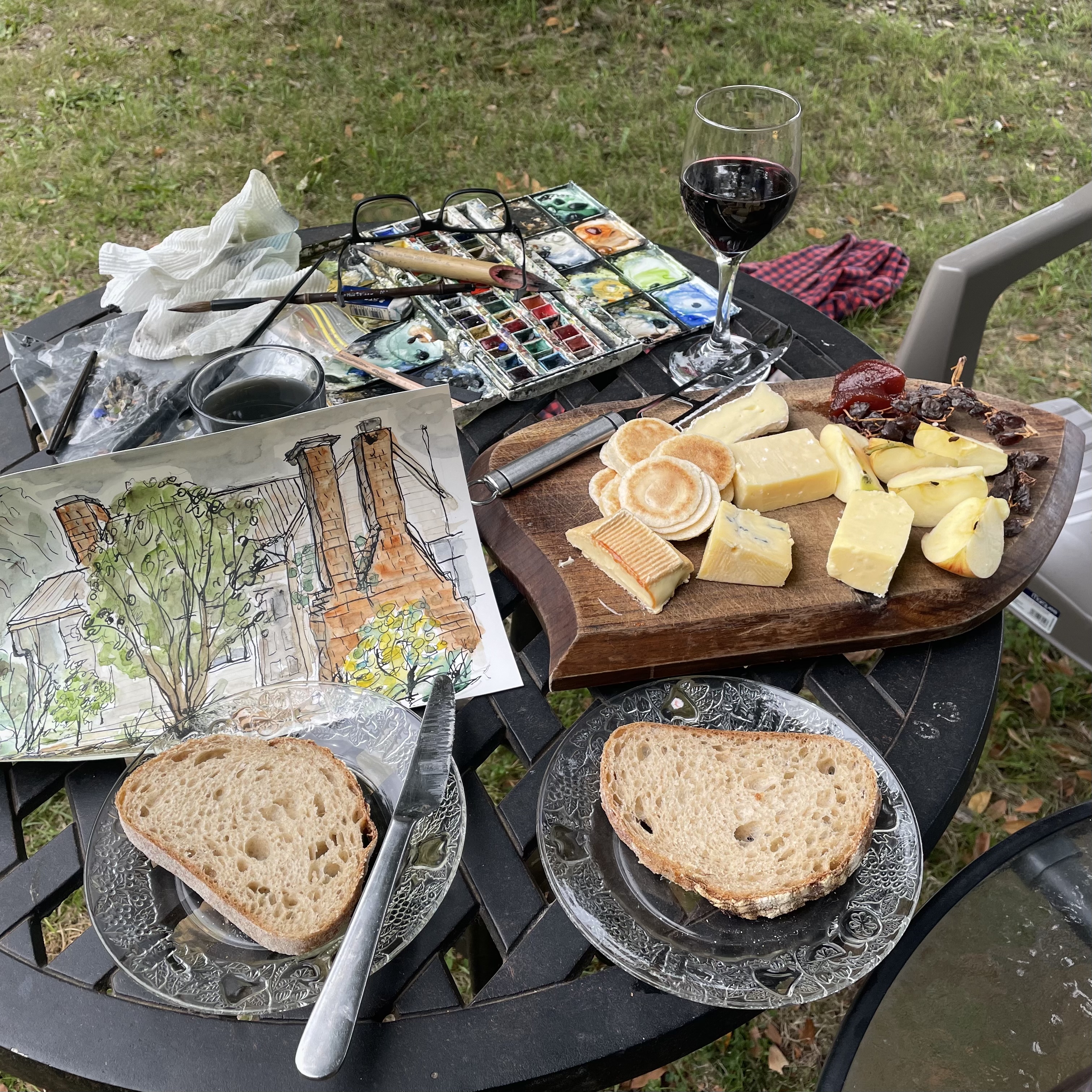 One afternoon, Dave came out with a plater of cheeses, dried fruits, dips, fresh bread and a couple glasses of wine to quaff while we sketched.