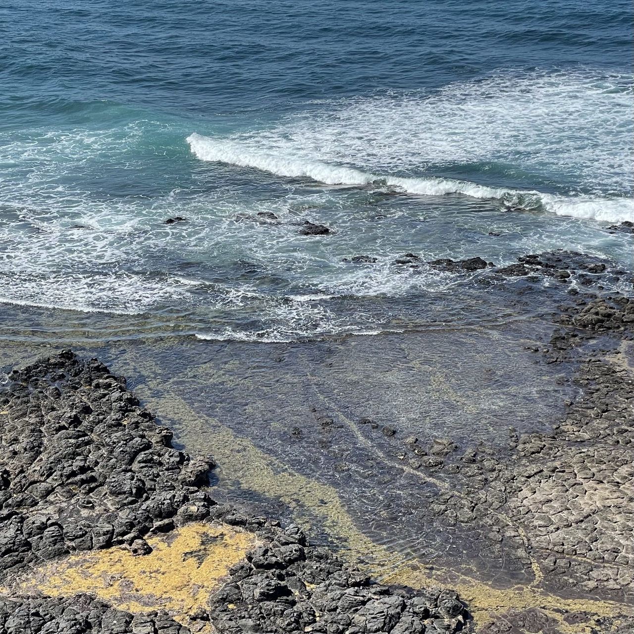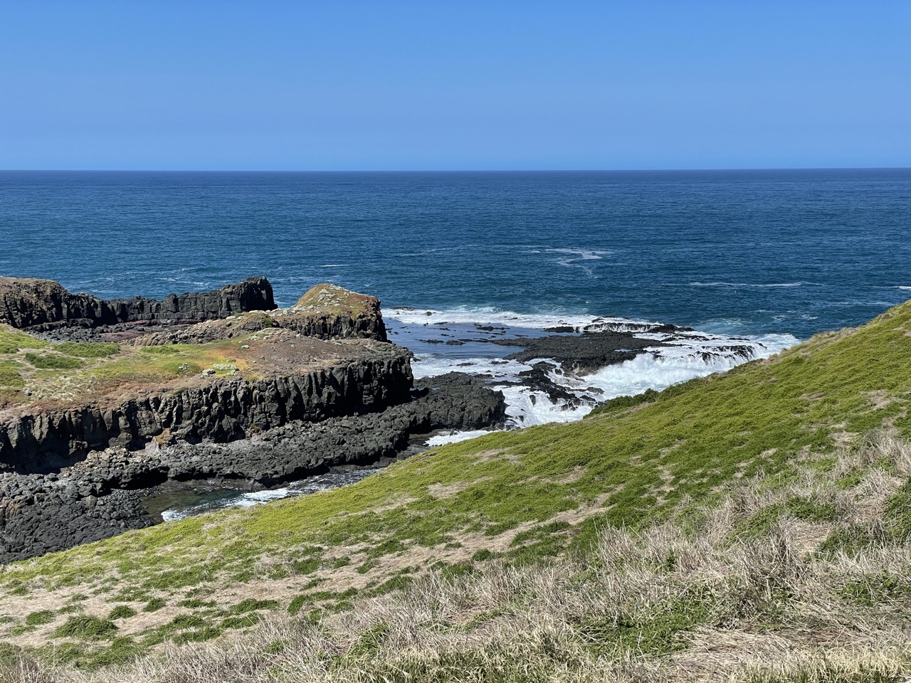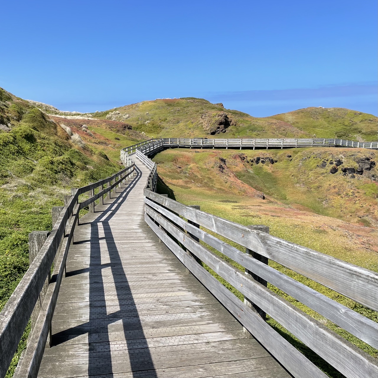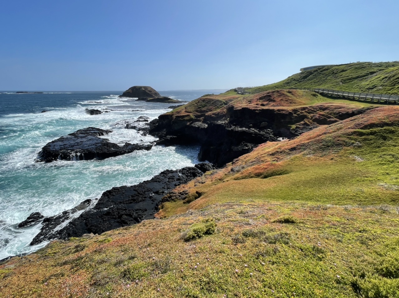 The boardwalk crossed through the dramatic headland covered in a patchwork of vivid colour. Lush greens, sienna, yellow ochre, dropping down to turquoise waves smashing into black rocks. It looked like a theme park, carefully curated.