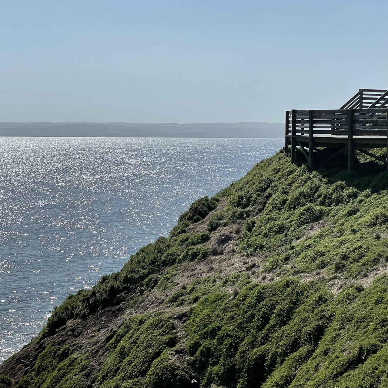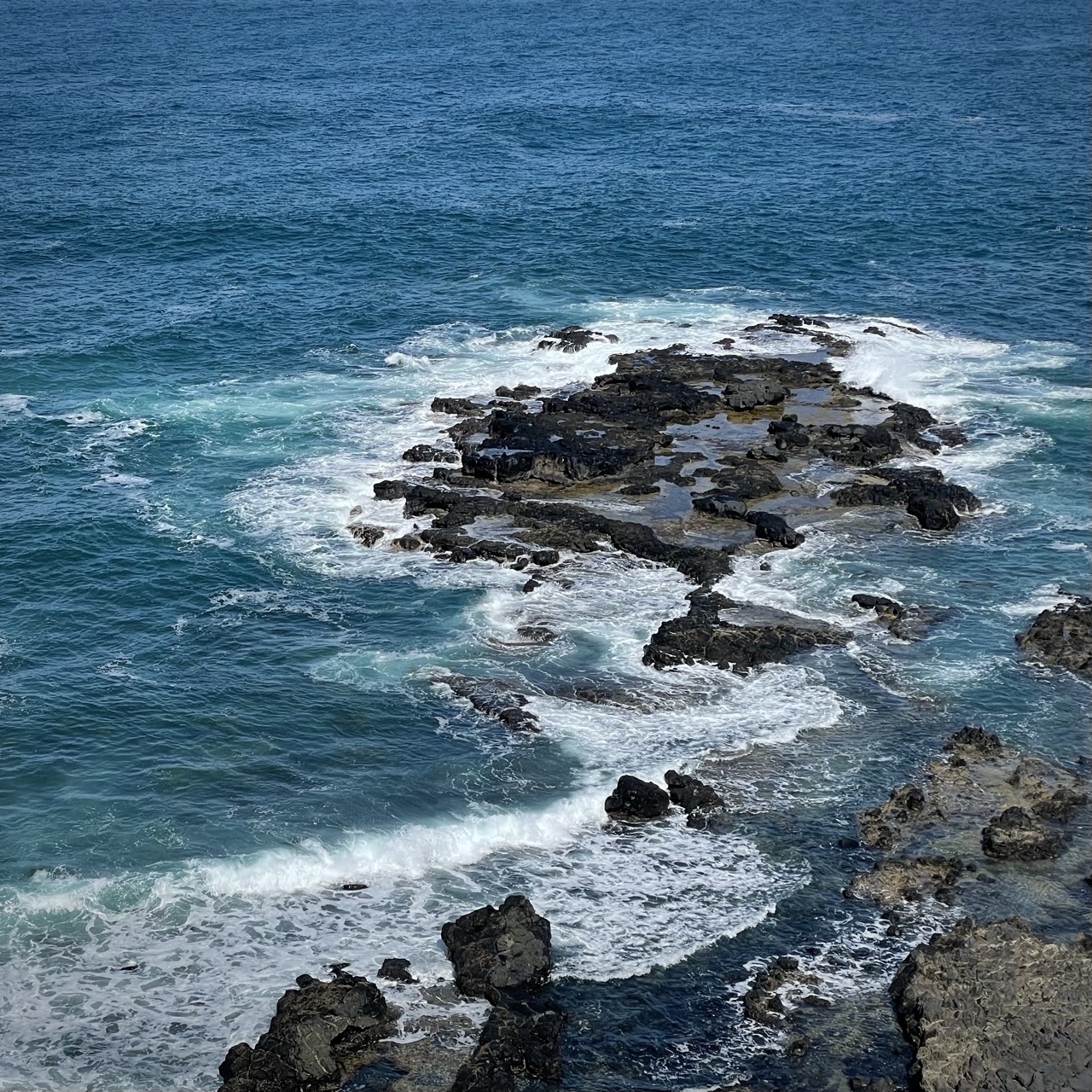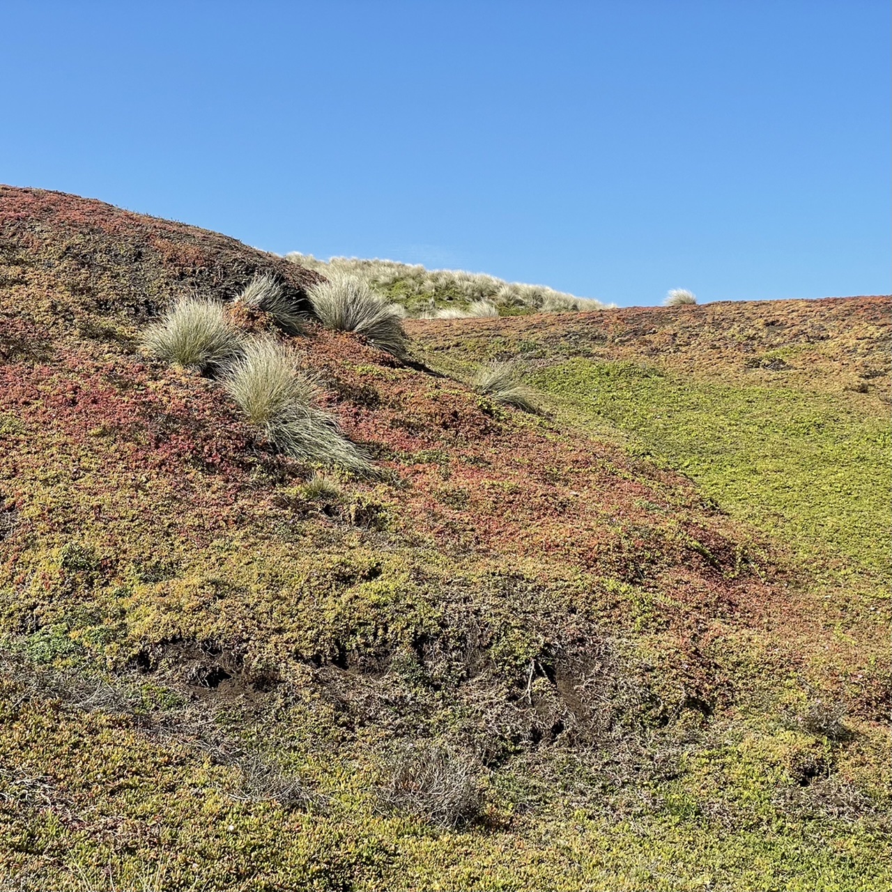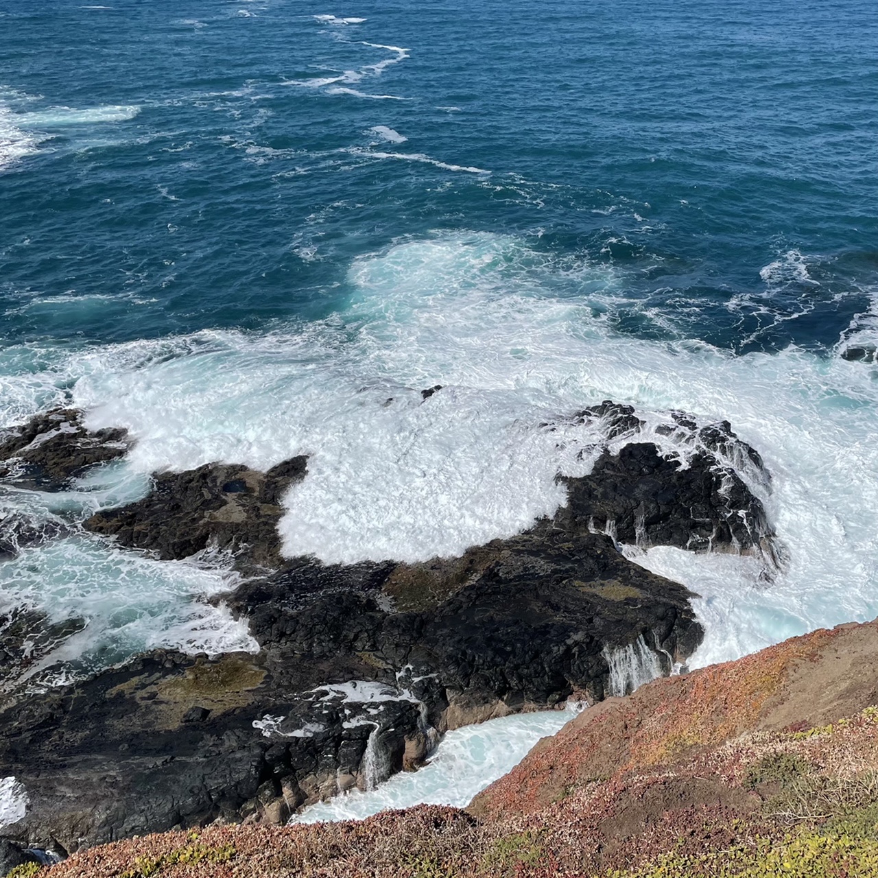 The boardwalk crossed through the dramatic headland covered in a patchwork of vivid colour. Lush greens, sienna, yellow ochre, dropping down to turquoise waves smashing into black rocks. It looked like a theme park, carefully curated.