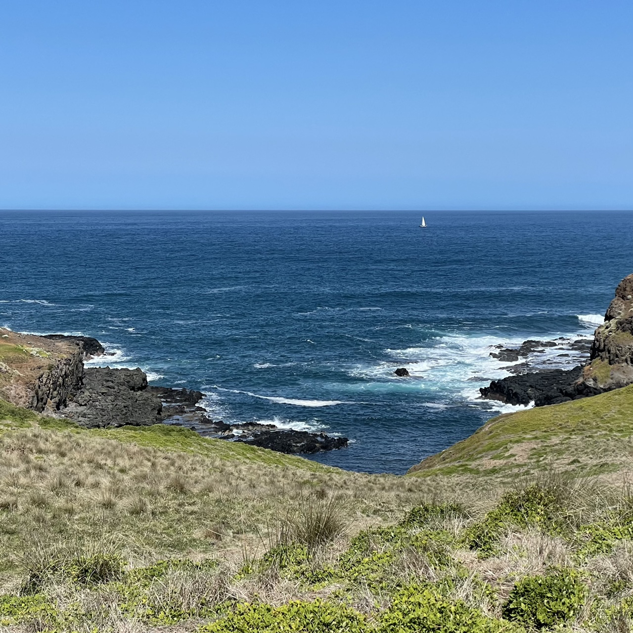We found an elevated board walk that hugged the cliff tops and wound around to Nobbies Point Lookout, and went to investigate.