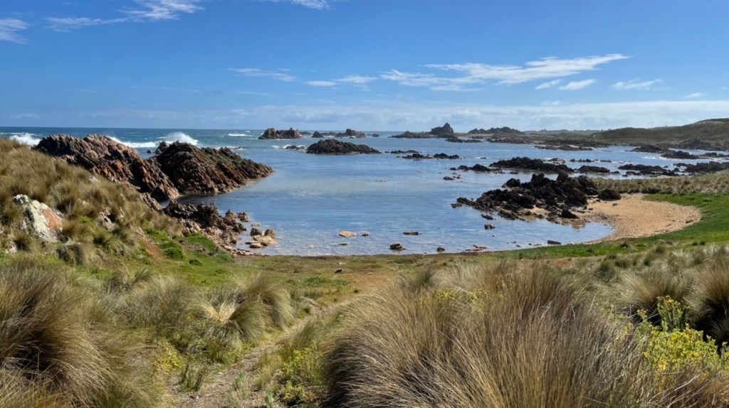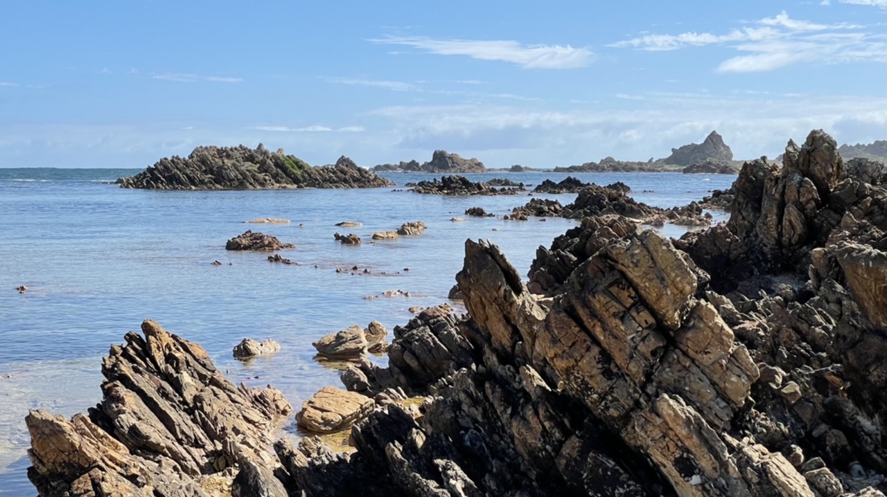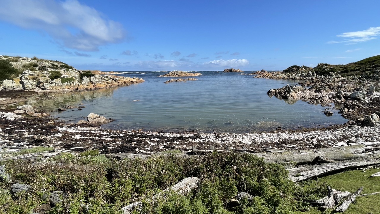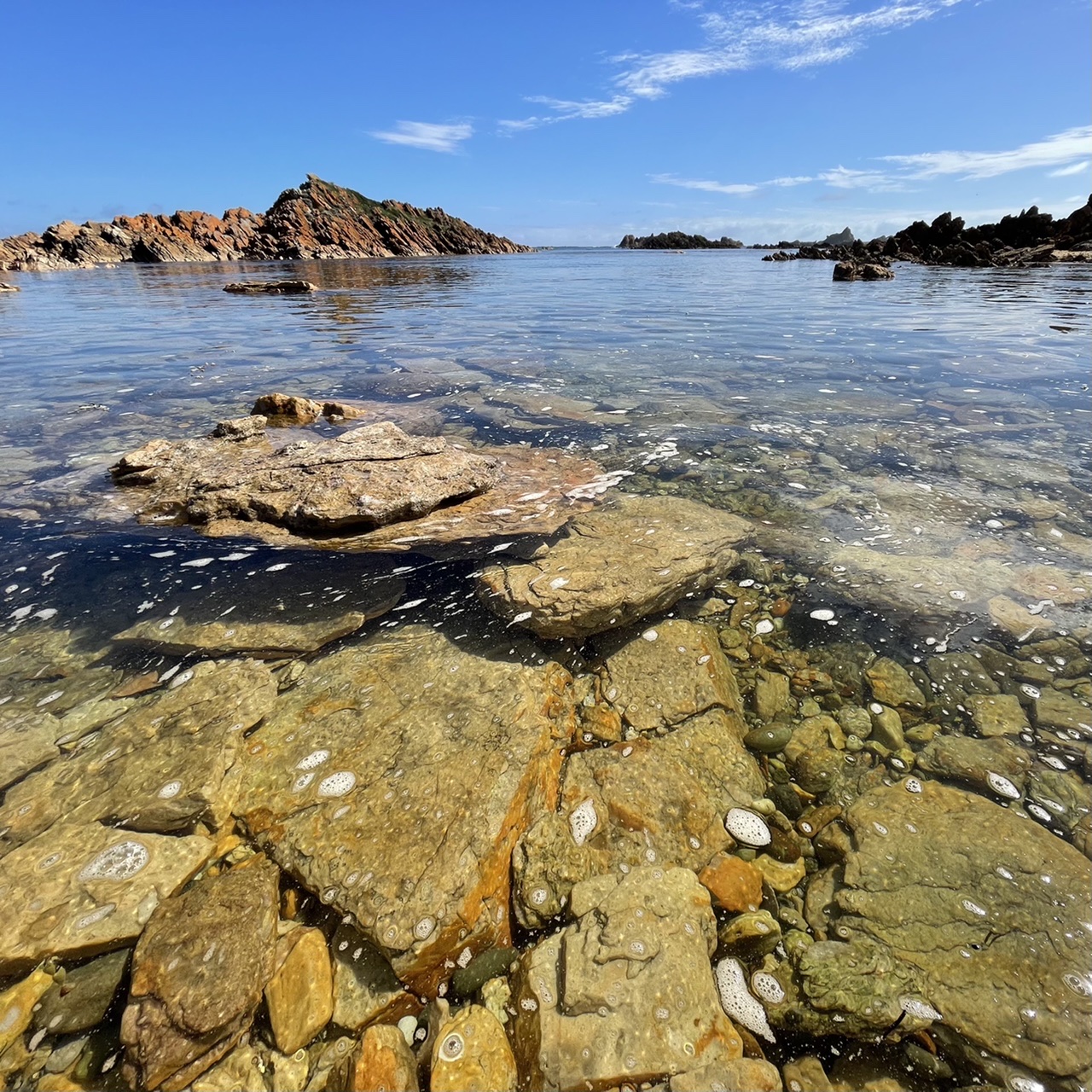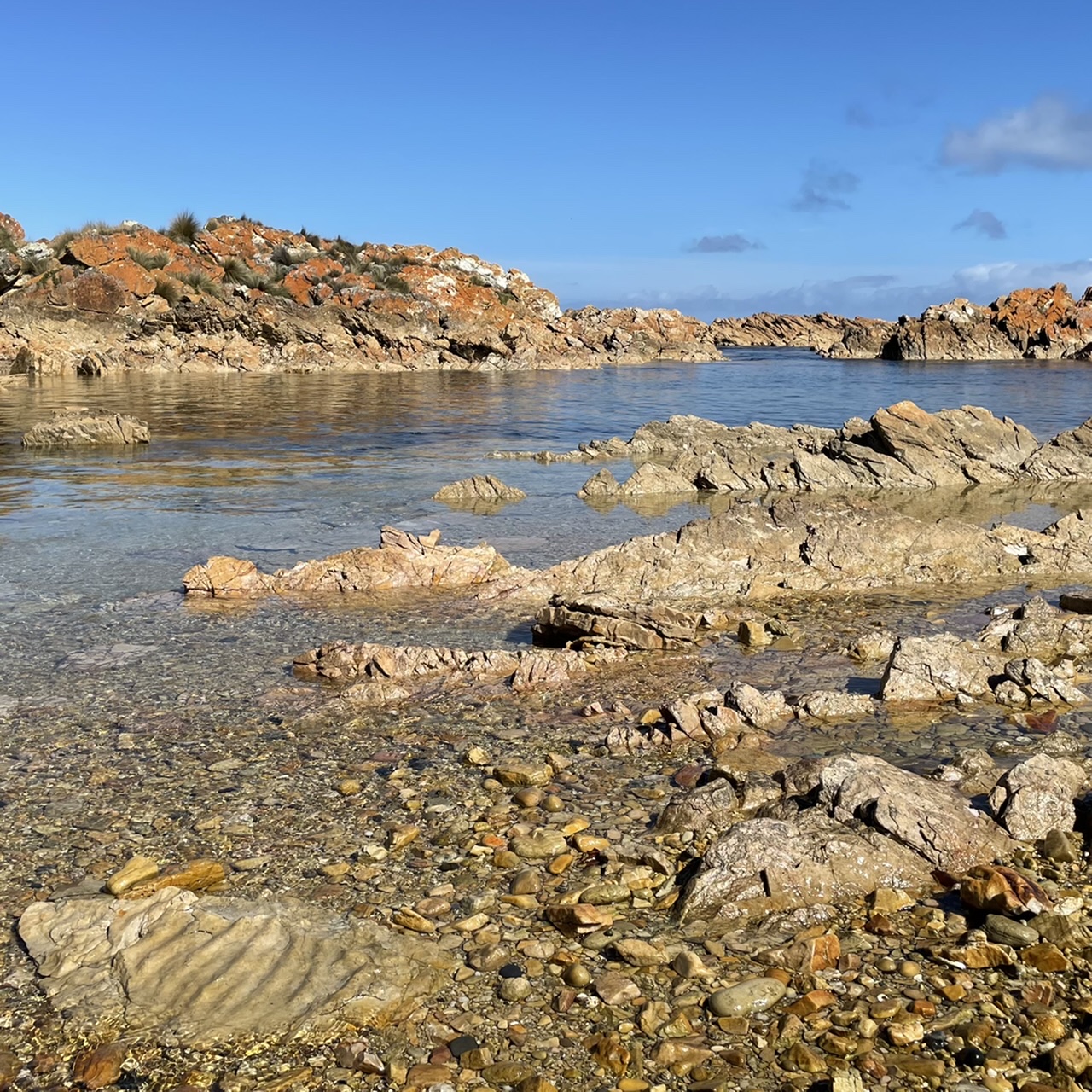 “Oh wow!” David stopped in his tracks, as he reached the crest of a hill. I caught up to him and joined him to look across a quiet inlet protected from the waves. Crystal clear water punctured with angular rocks cutting shapes up to the horizon.