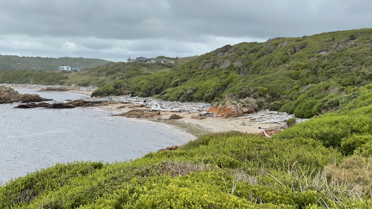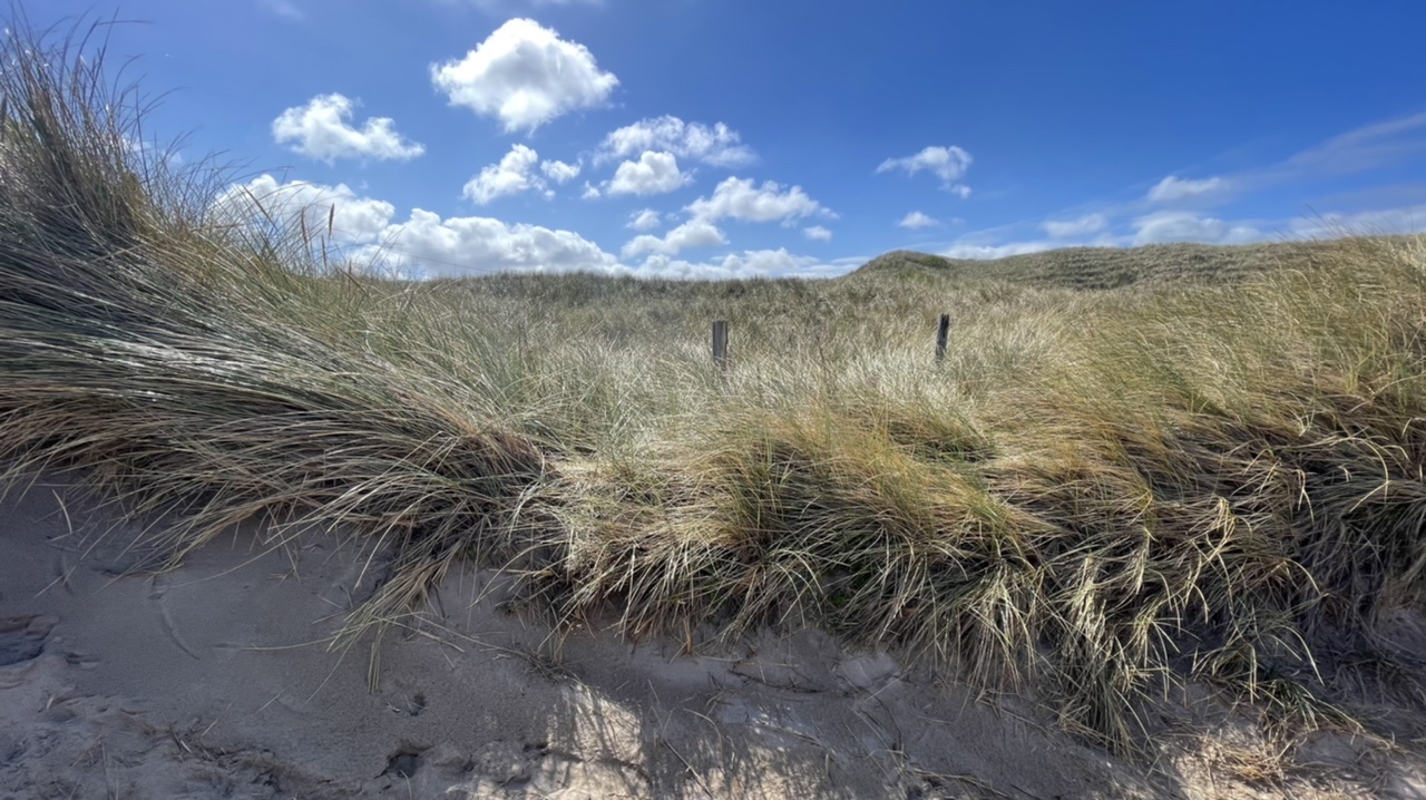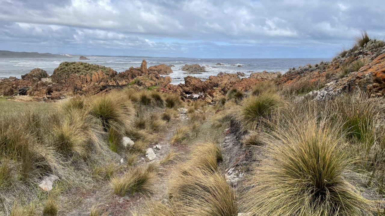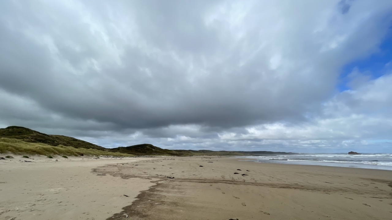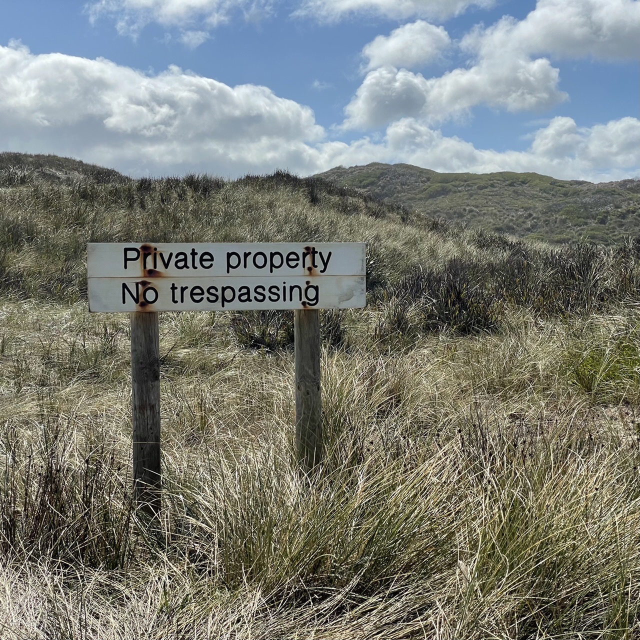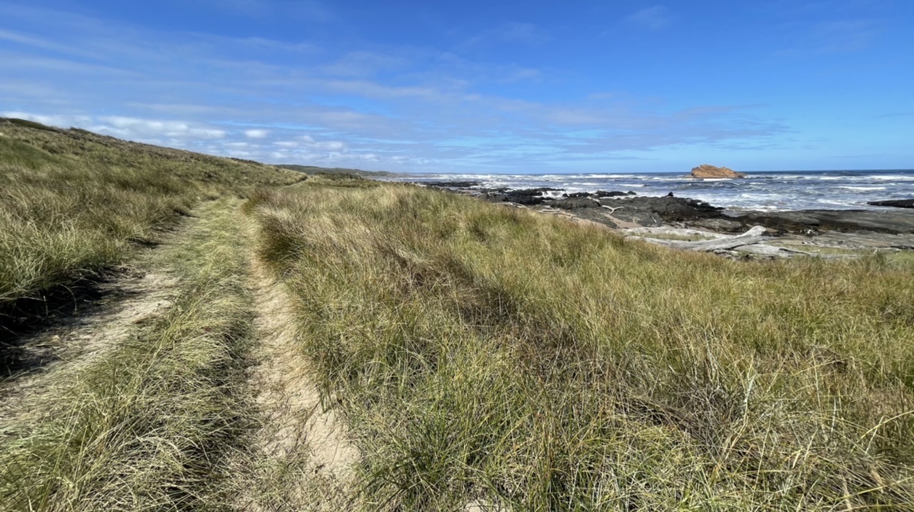 The path climbed over the dunes around the headland, and we passed through a few farm gates and private property.