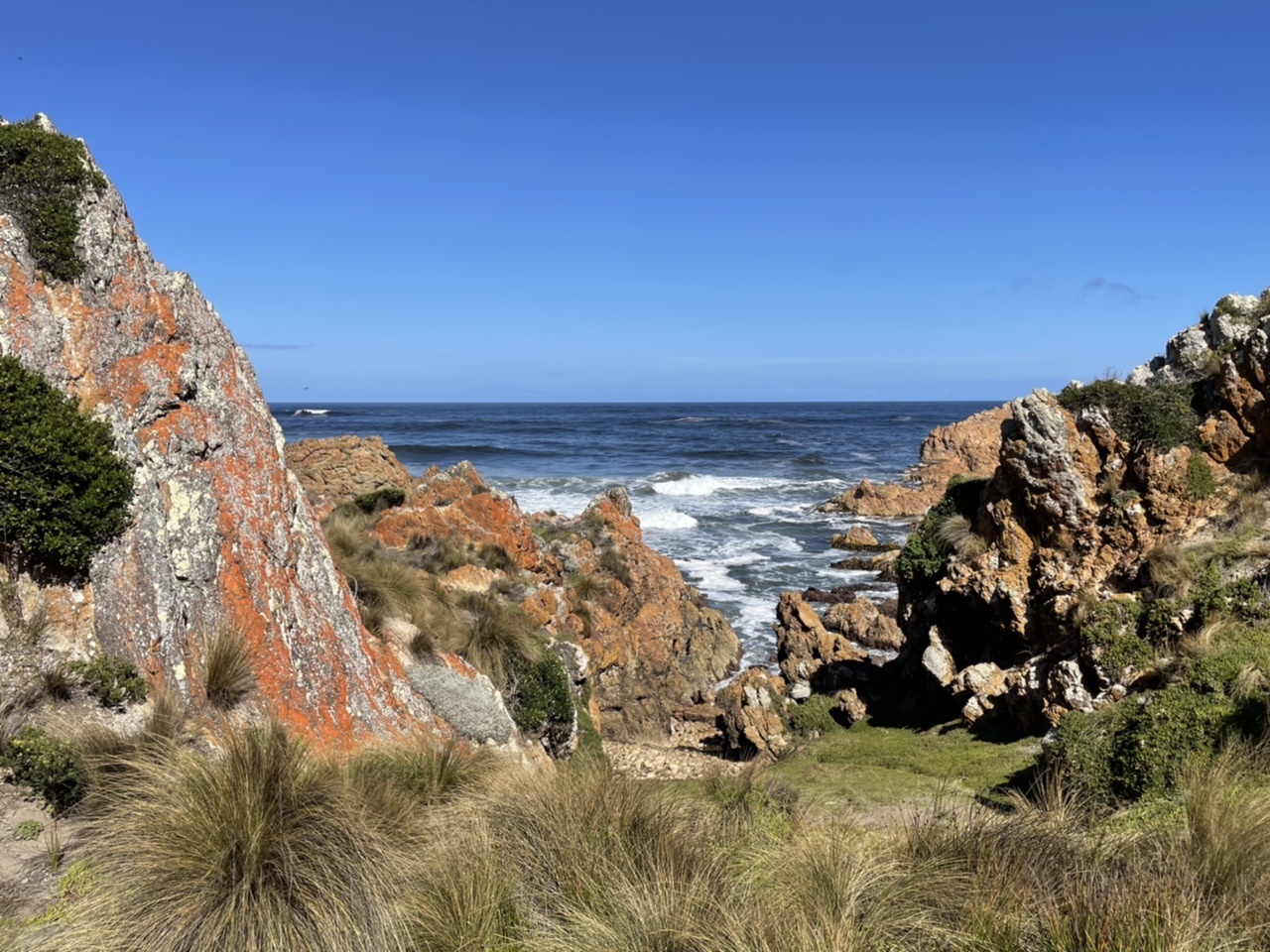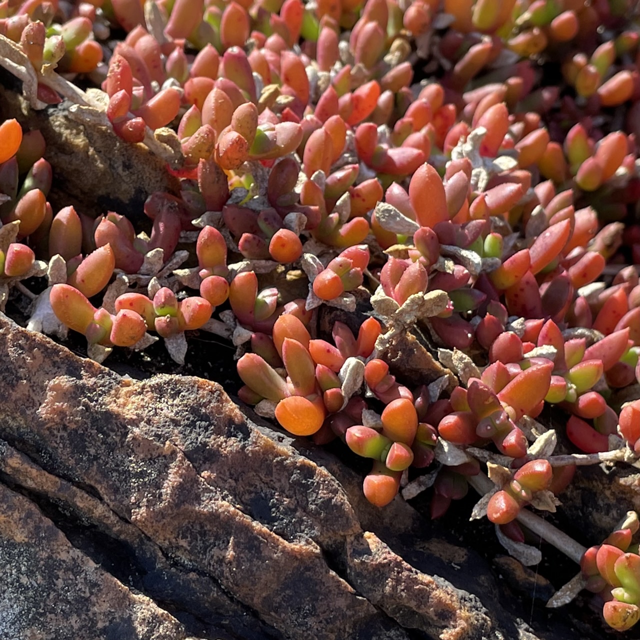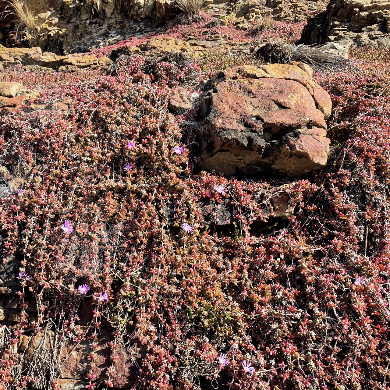 The track headed inland through natural succulent gardens of rich red, magenta and sap green. Delicate pink flowers open to the sun. I wondered how these little flowers could survive in the rough weather. Yet here they are draped over amber rocks.