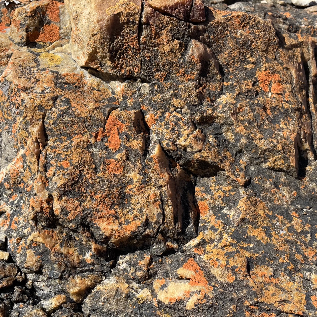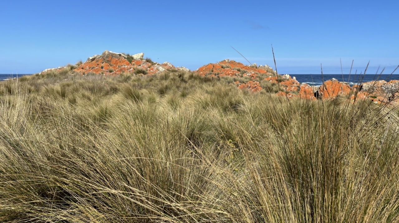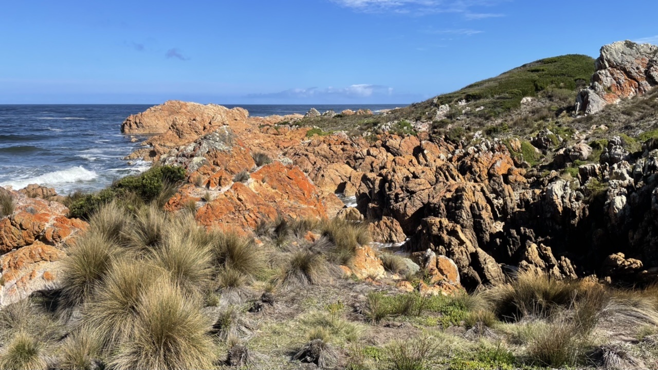 The track headed inland through natural succulent gardens of rich red, magenta and sap green. Delicate pink flowers open to the sun. I wondered how these little flowers could survive in the rough weather. Yet here they are draped over amber rocks.