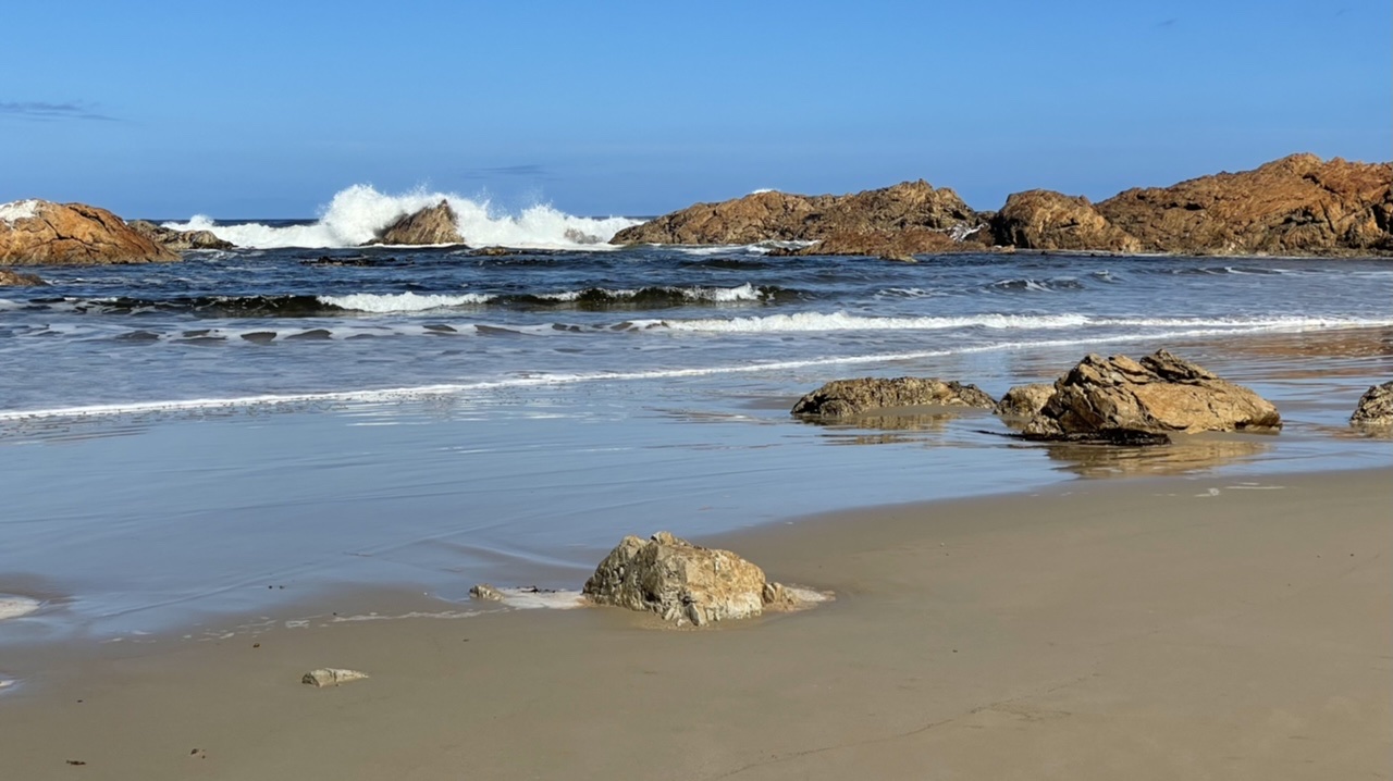 I climbed onto a jagged rock to get a better view. The waves seemed to loose their energy after crashing over the rock and rolled gently to the beach.