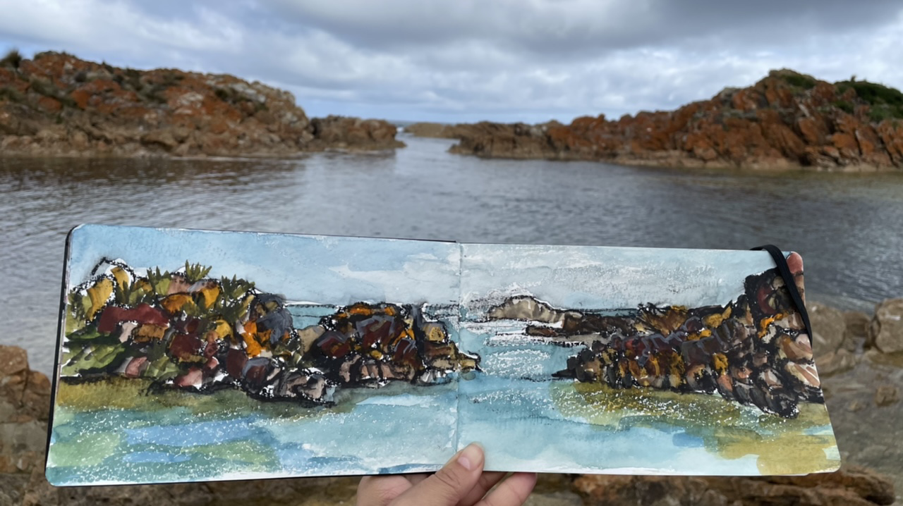 “Okay, we’ve got to be quick, the tide is coming in.”  Said David who had probably finished a painting while I was still getting comfortable on the rocks.