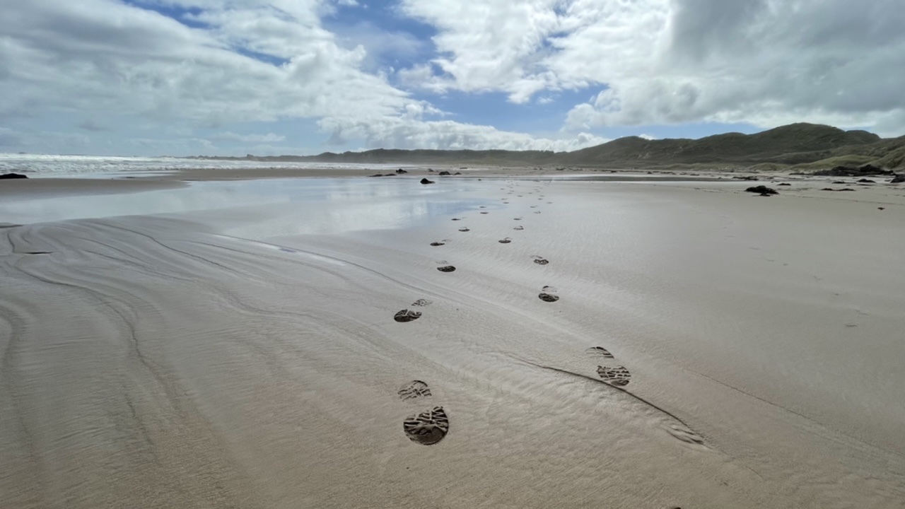 As we approached the end of the beach I turned back for one last look, and noticed our footprints in the sand. Alone together on this remote beach. We hugged and then walked hand in hand until we reached the headland.