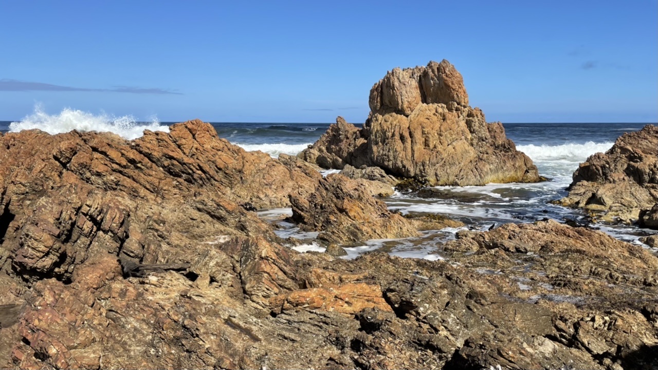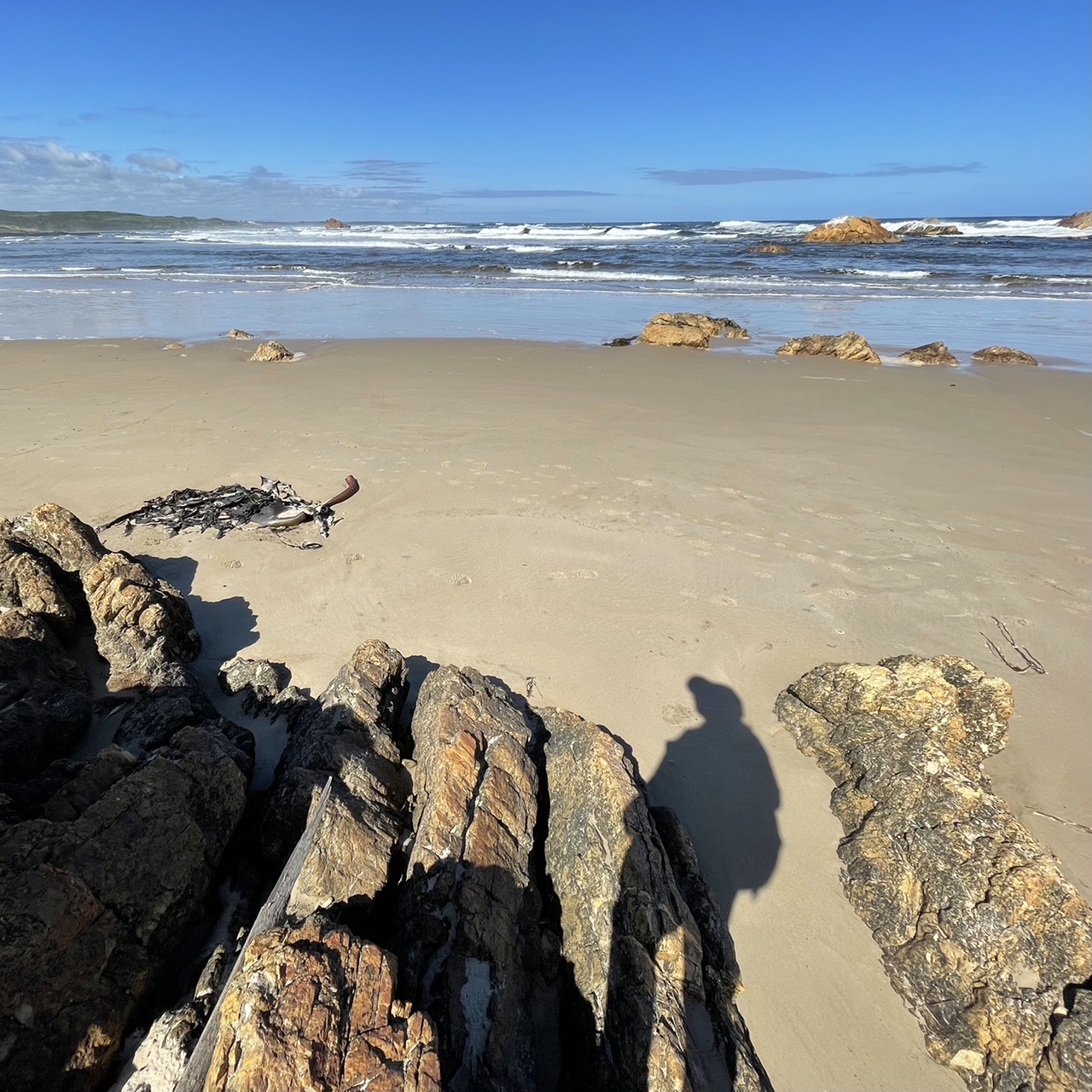 Up ahead, waves crashed over a line of gold rocks jutting out at the headland. I’d lost sight of David but followed his foot prints to find him standing on the rocks  watching the waves.