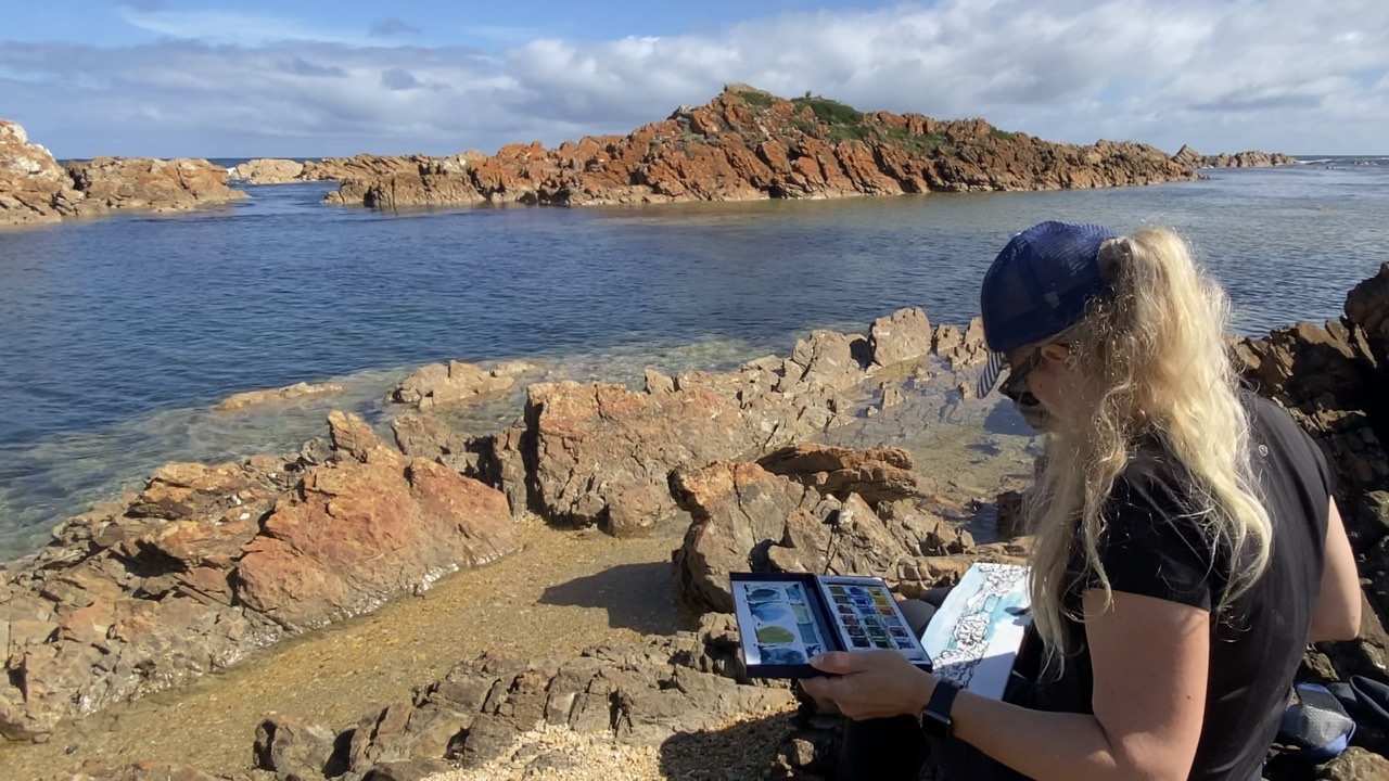 “Well this looks like the spot to paint” he said walking down to a horse shoe beach. I followed in his foot steps exactly to minimise squashing the compact succulent ground cover. Millions of small shells formed the shore line.