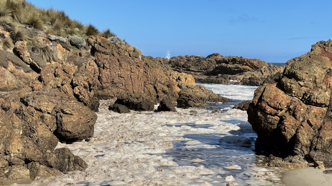We rock hopped through strange angular formations passing a narrow section where the sea foam was collecting in great clumps.