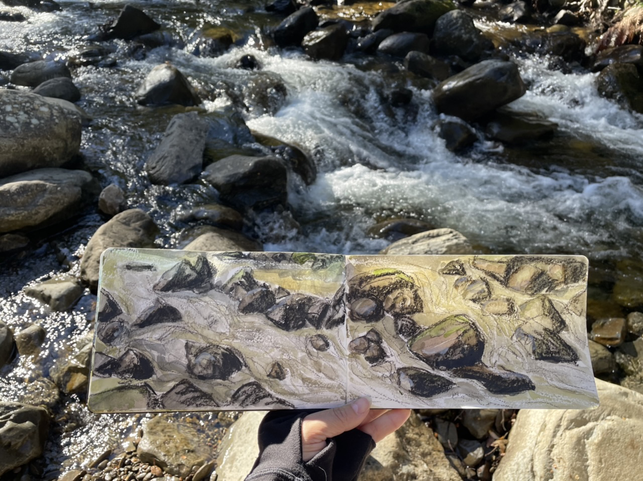 As we followed the fast flowing river cascading over sandstone terraces, we were looking for the perfect spot to stop and sketch. Our plan was to walk down to the main falls first, and come back to the best spot.