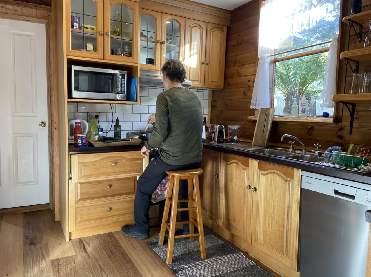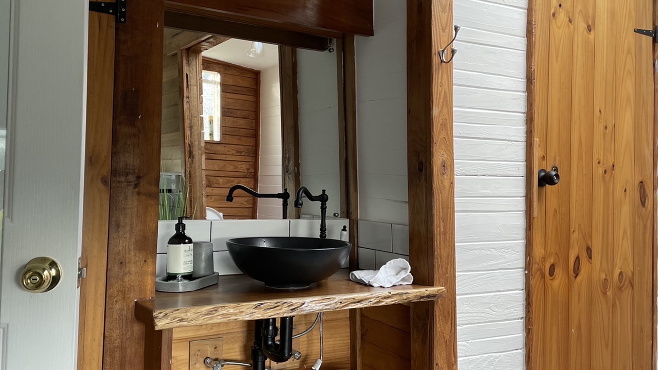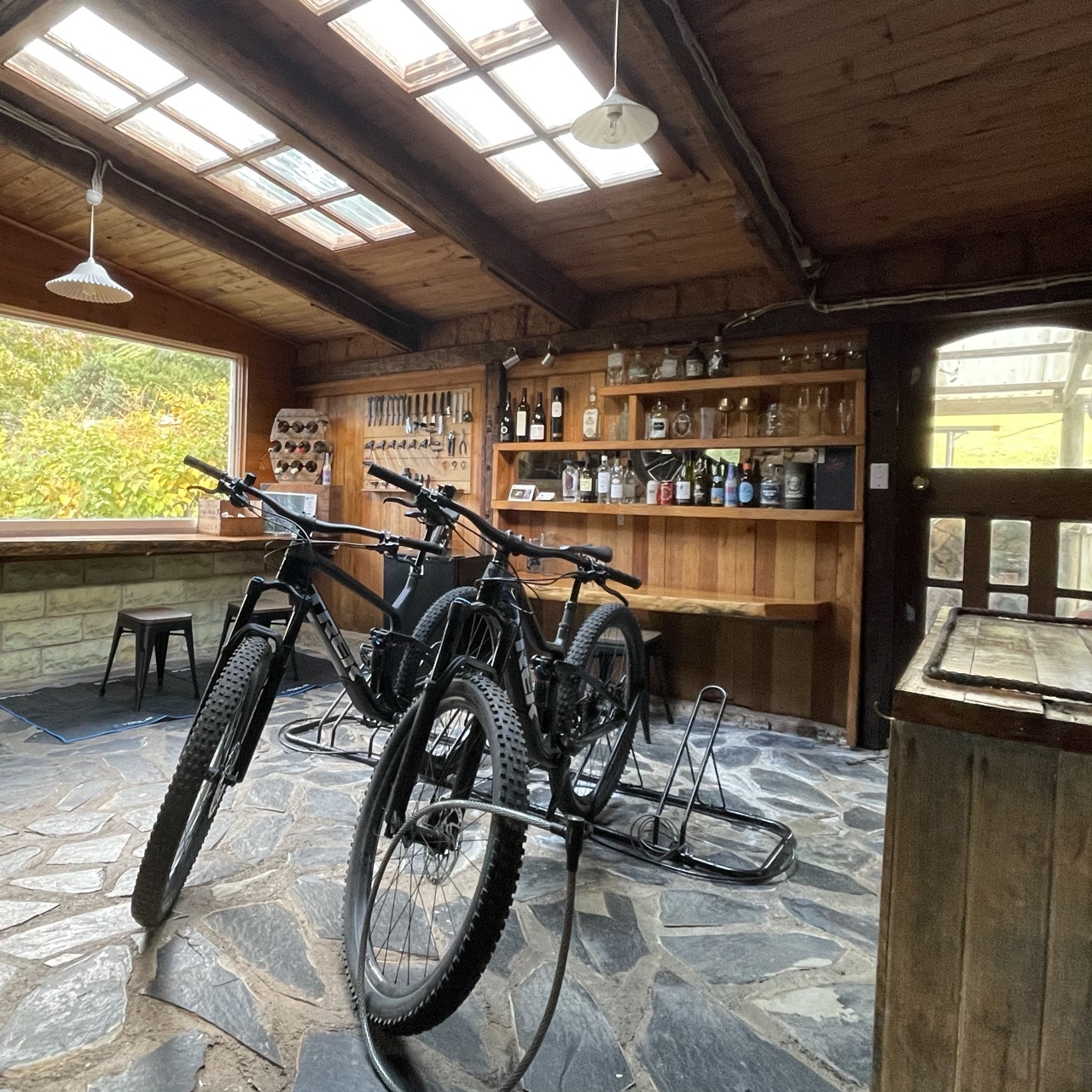 The house, called Roxanne’s (after one of the double diamond trails) is a renovated farm shack, with a quirky blend of new and old. Glass bottles built into the brick façade glow with the daylight, a wagon-wheel window provides a view into the bike room. It’s brilliantly set up for travelling with bikes, complete with tools and a wash station outside.