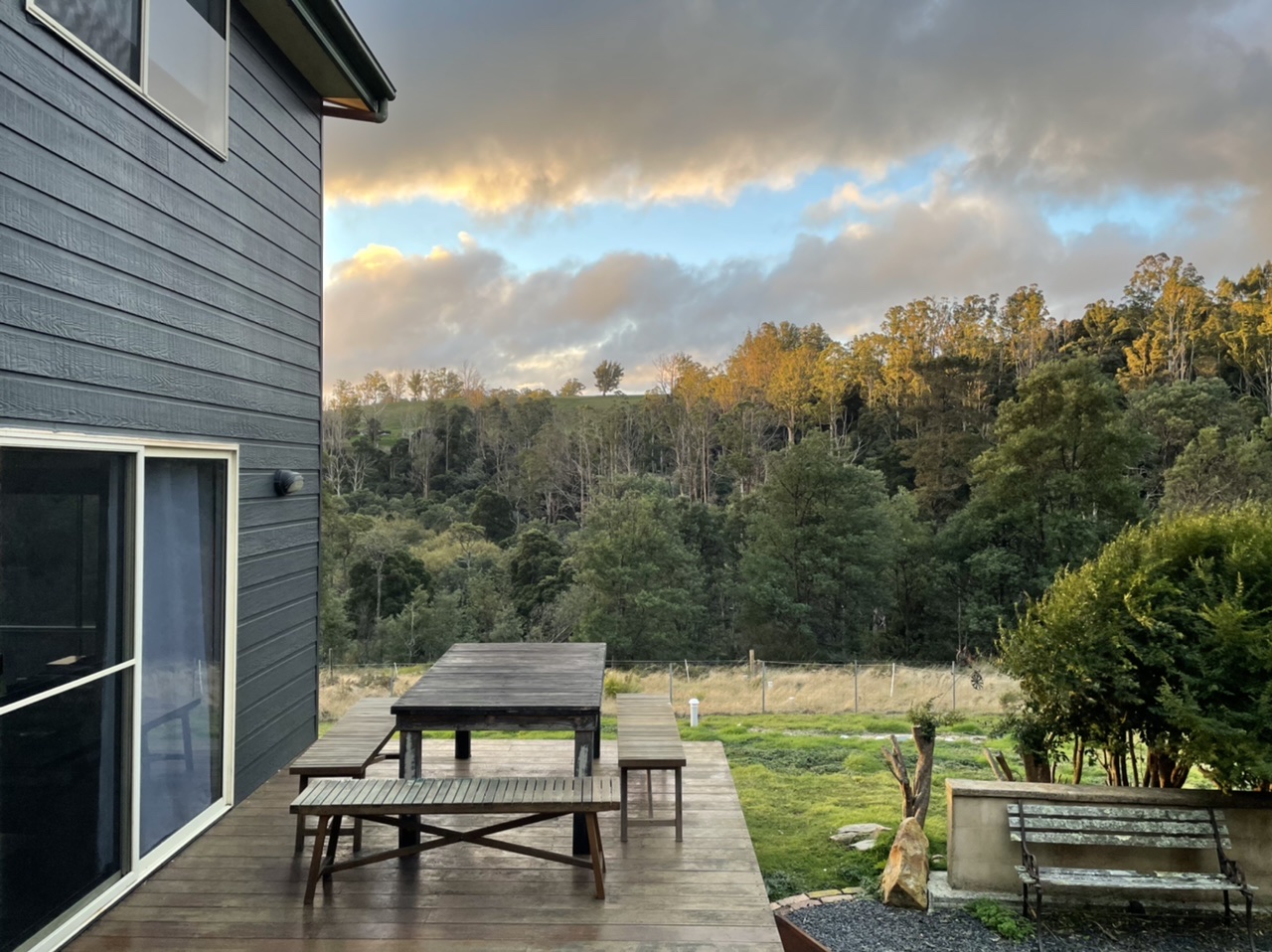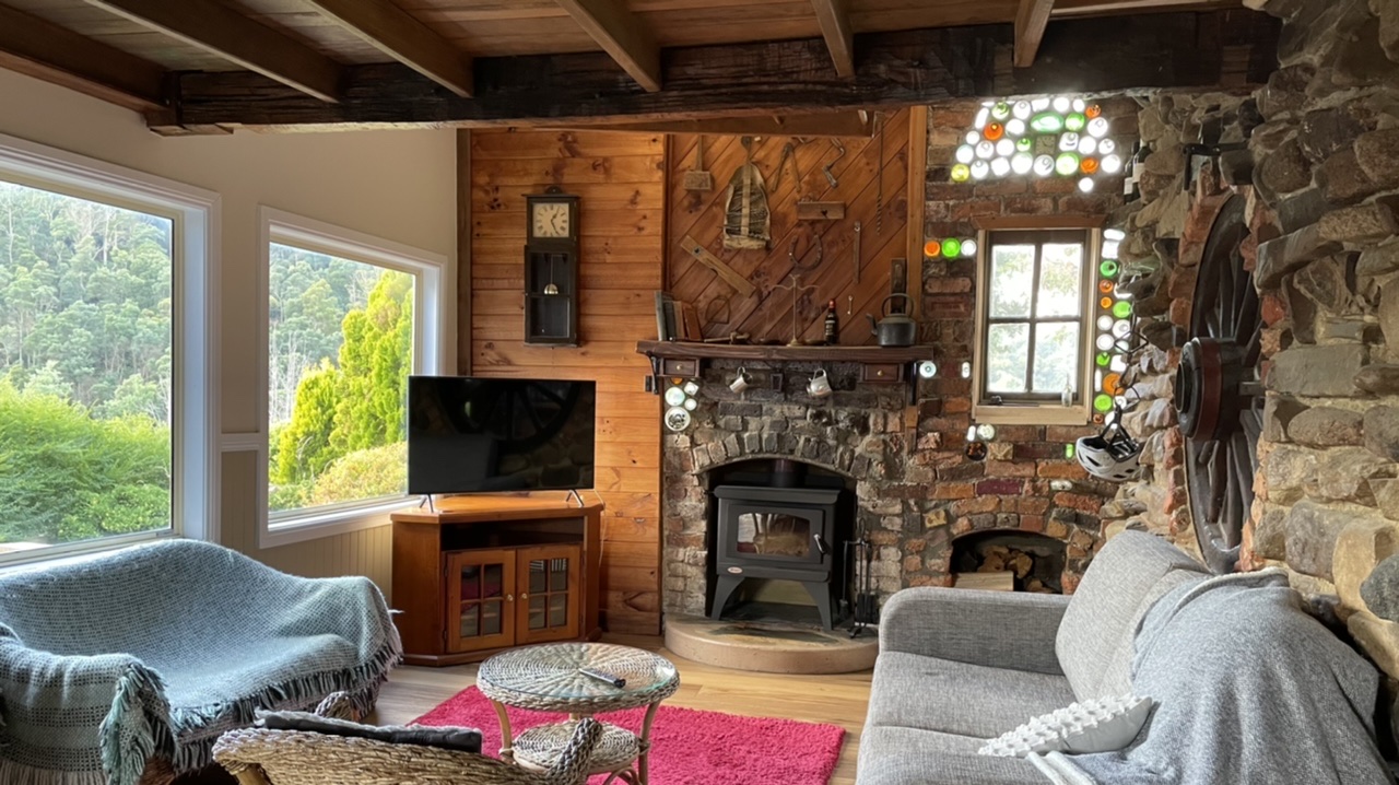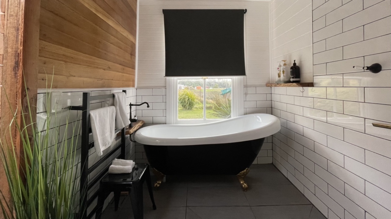 The house, called Roxanne’s (after one of the double diamond trails) is a renovated farm shack, with a quirky blend of new and old. Glass bottles built into the brick façade glow with the daylight, a wagon-wheel window provides a view into the bike room. It’s brilliantly set up for travelling with bikes, complete with tools and a wash station outside.