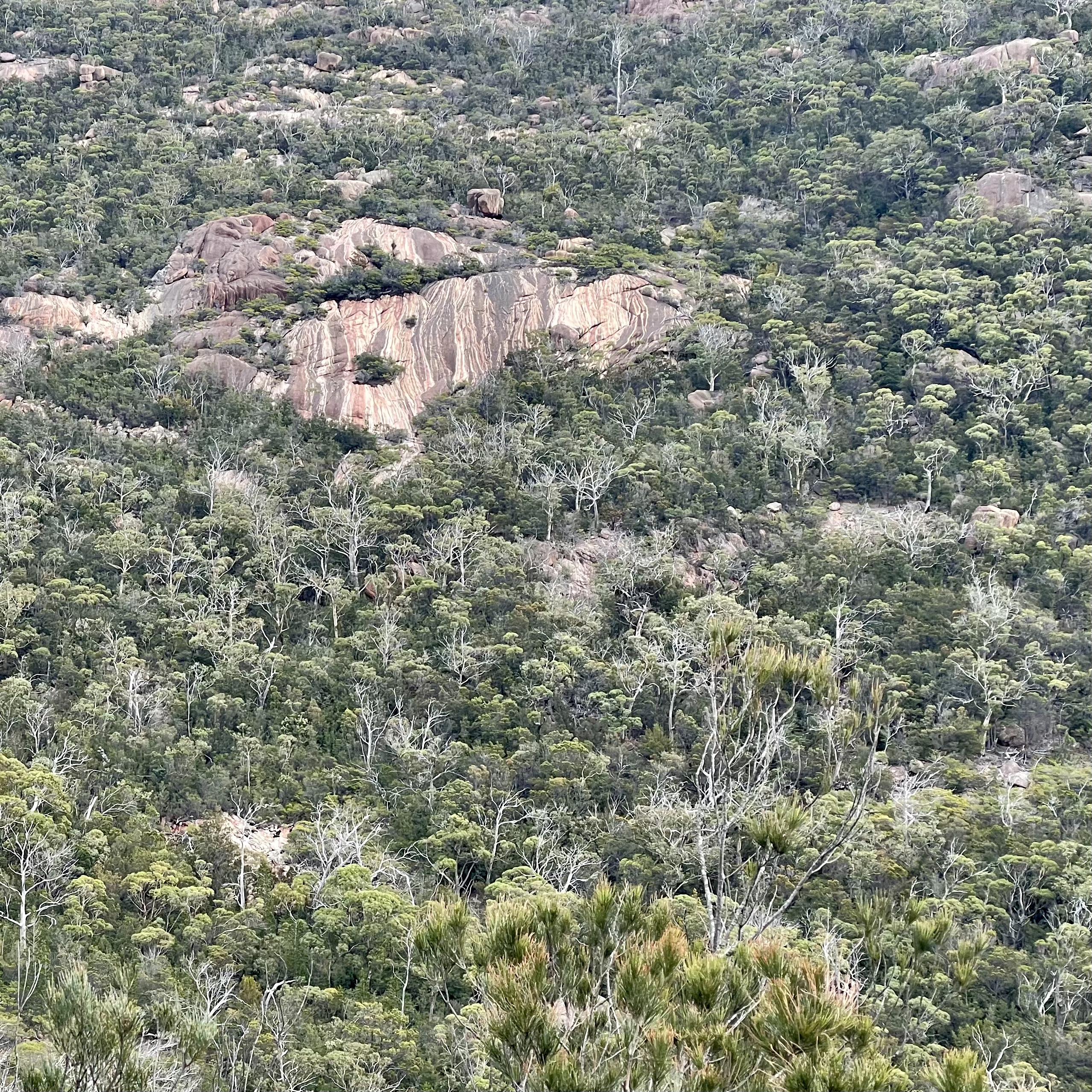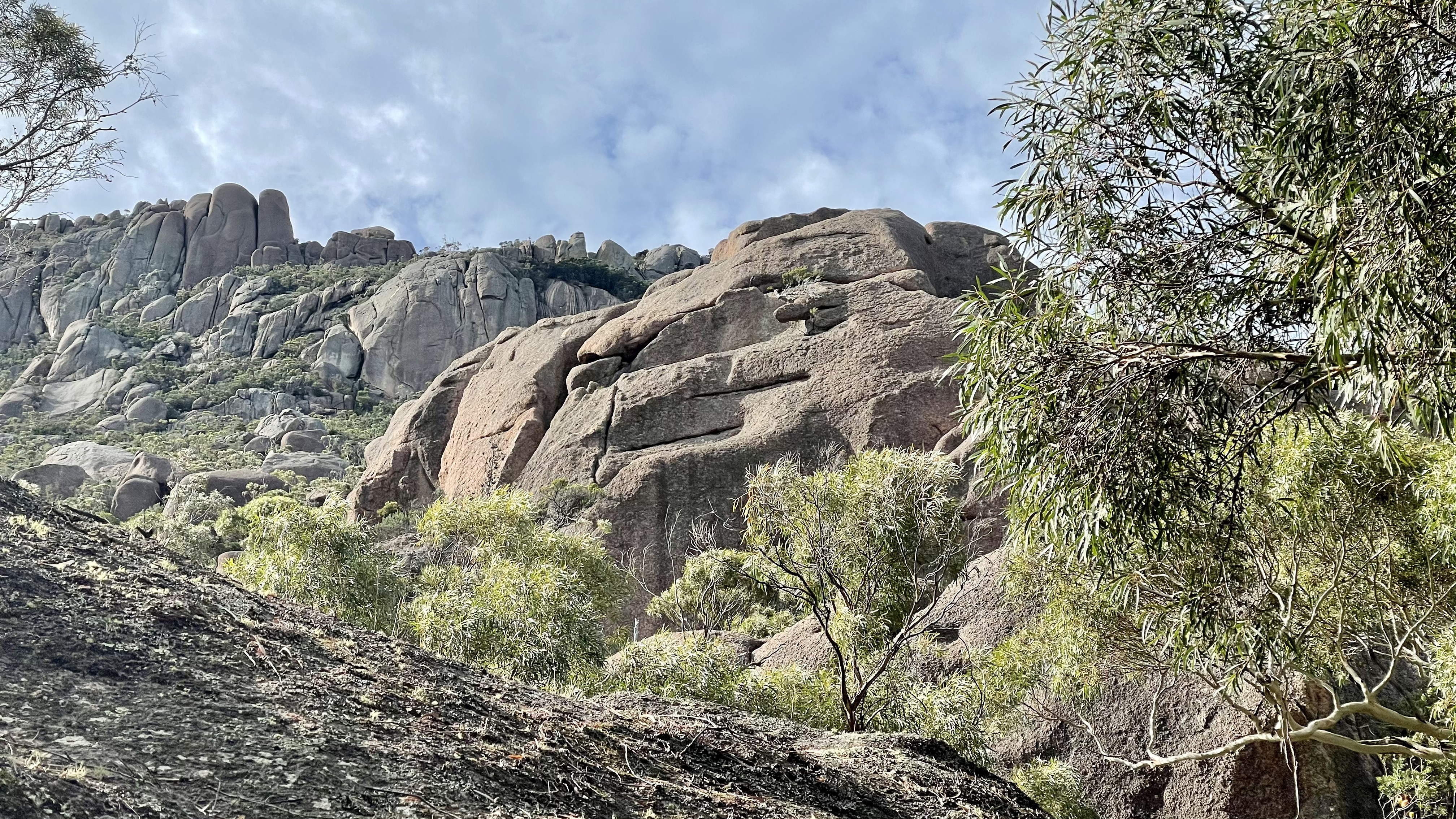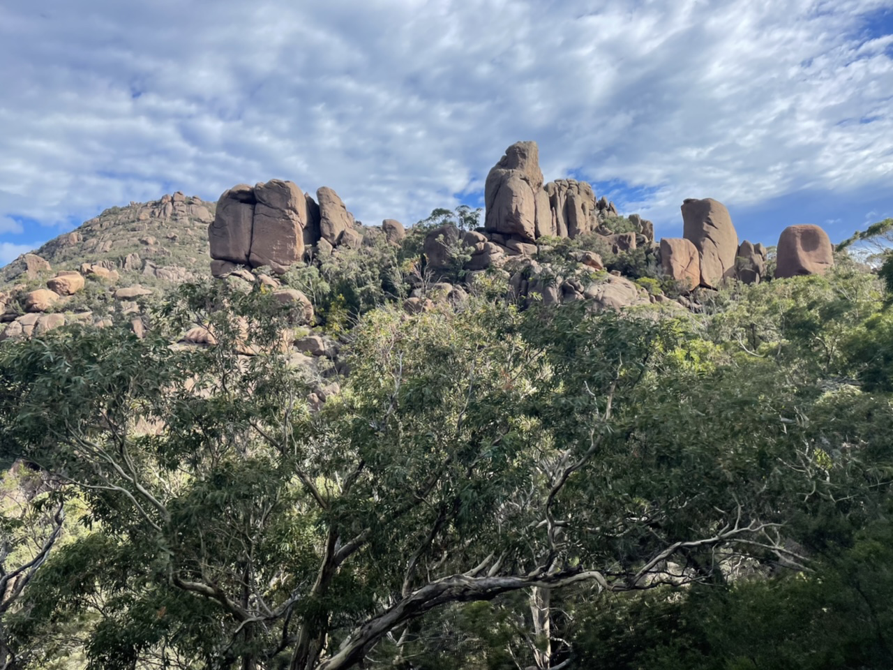 After a steady uphill climb for a kilometre or so, not bothering to stop at the interim lookouts, we neared the top of the saddle. The eucalypt forest gave way to huge granite boulders, a familiar sight along the eastern coast of Australia.
