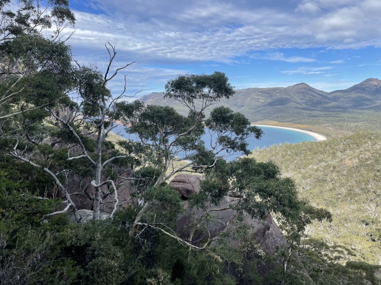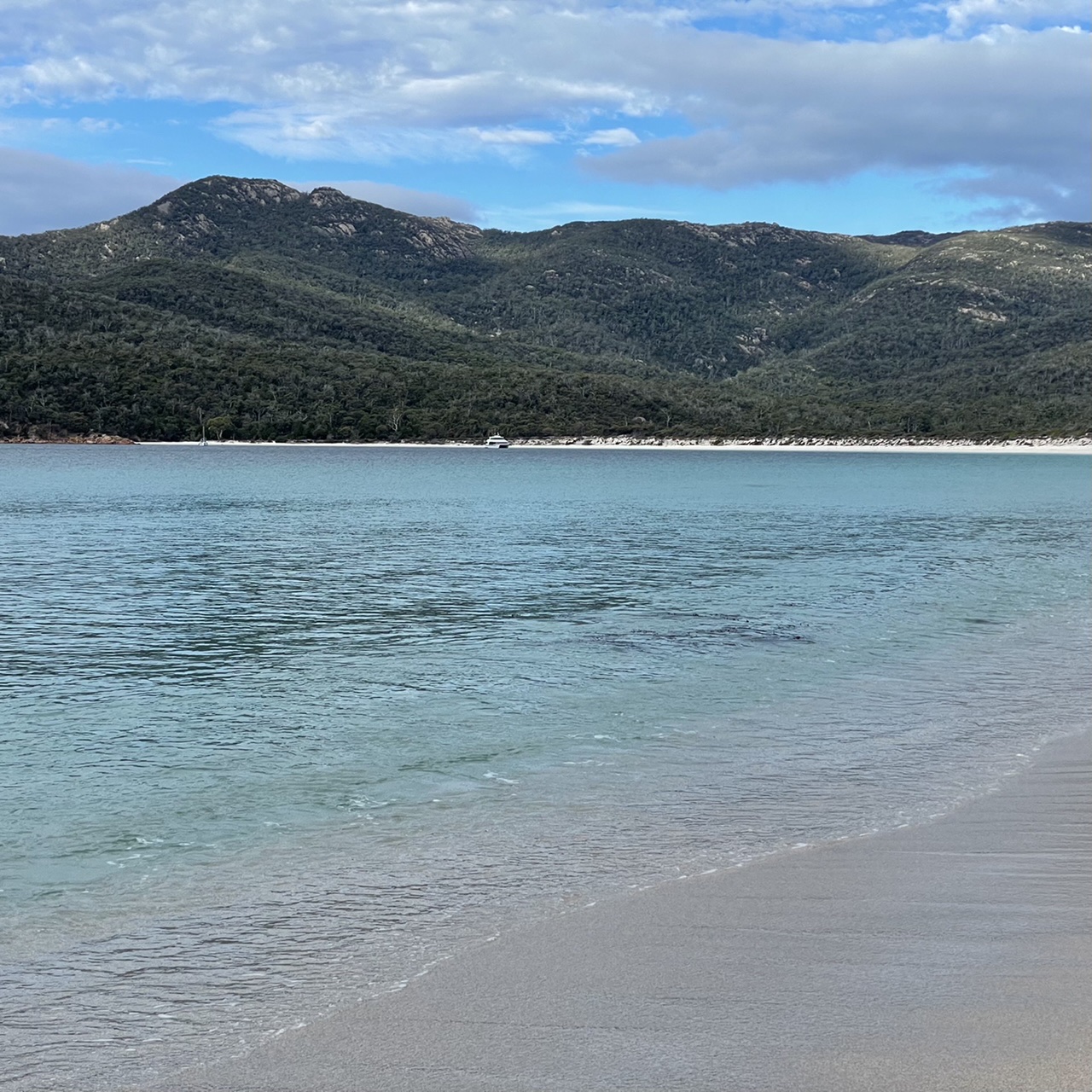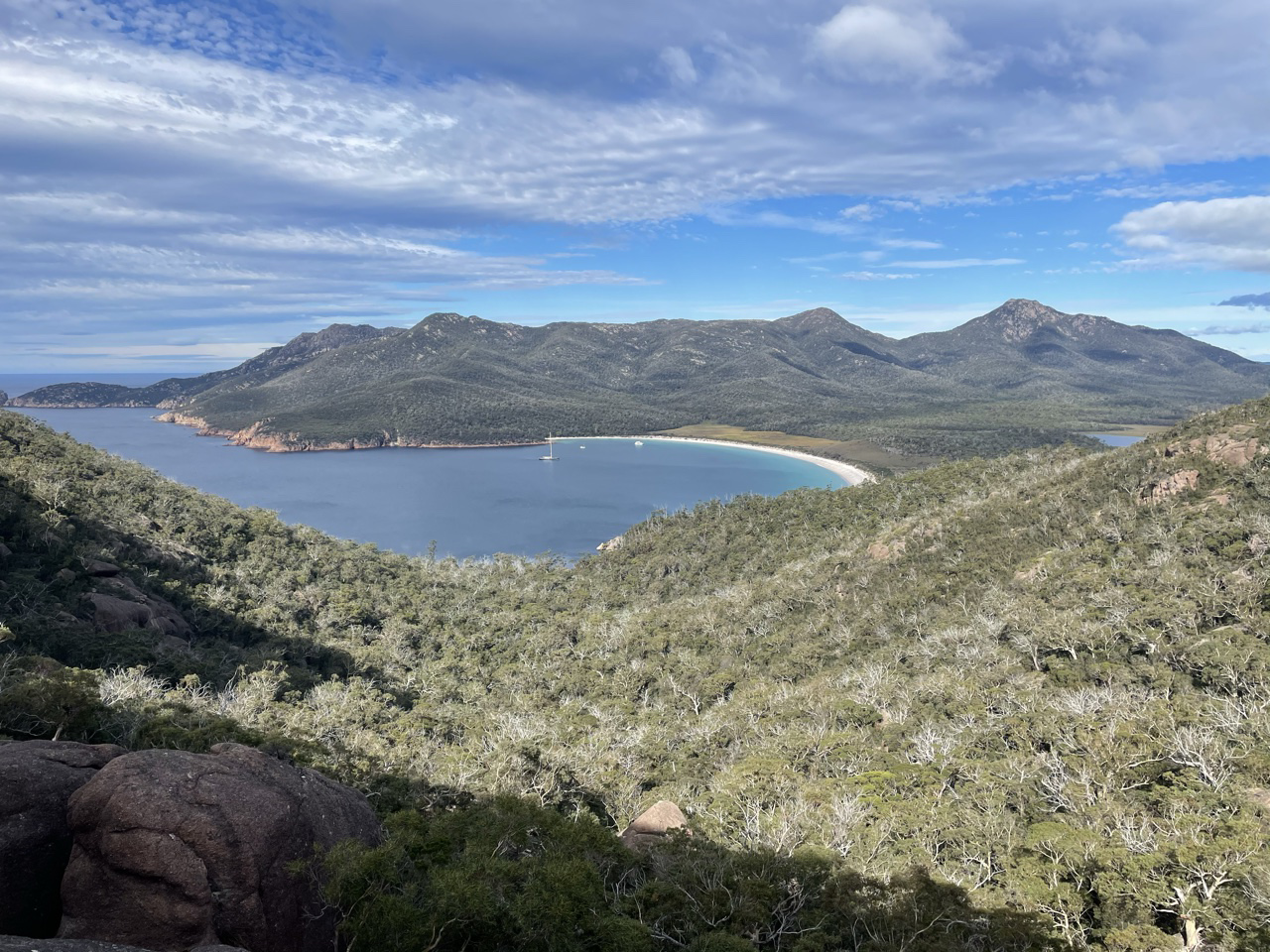 We could see the graceful white beach of Wineglass Bay, the next stop on our route.