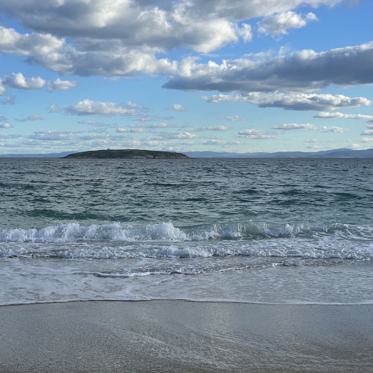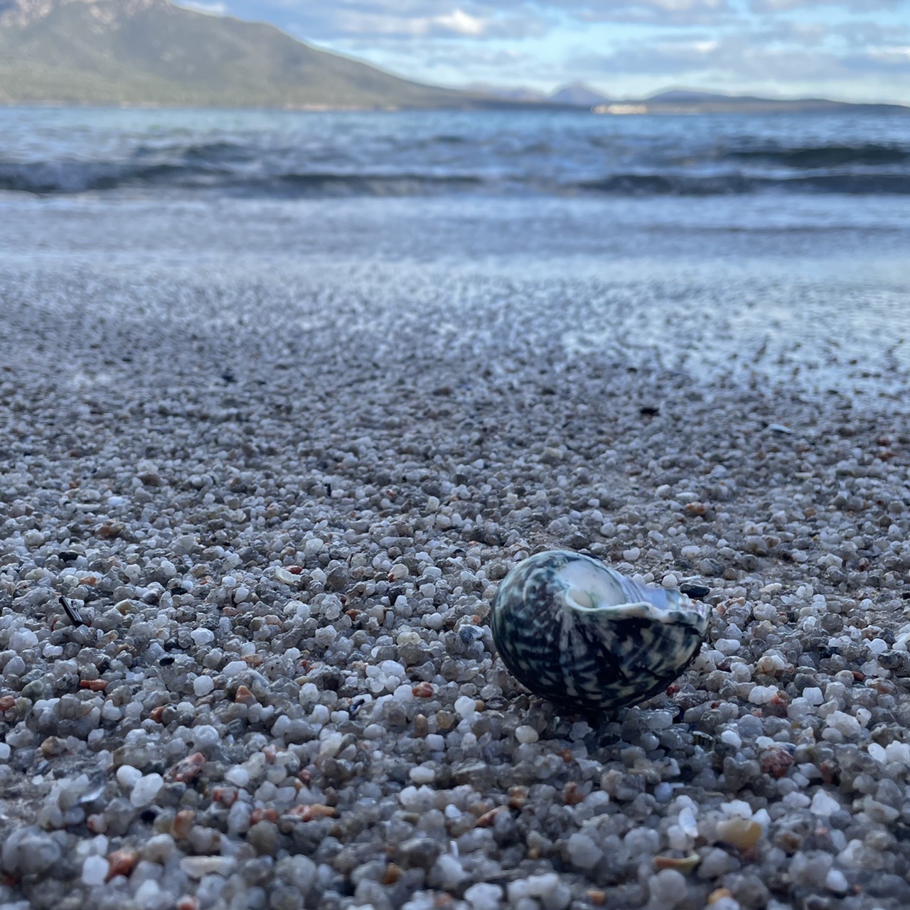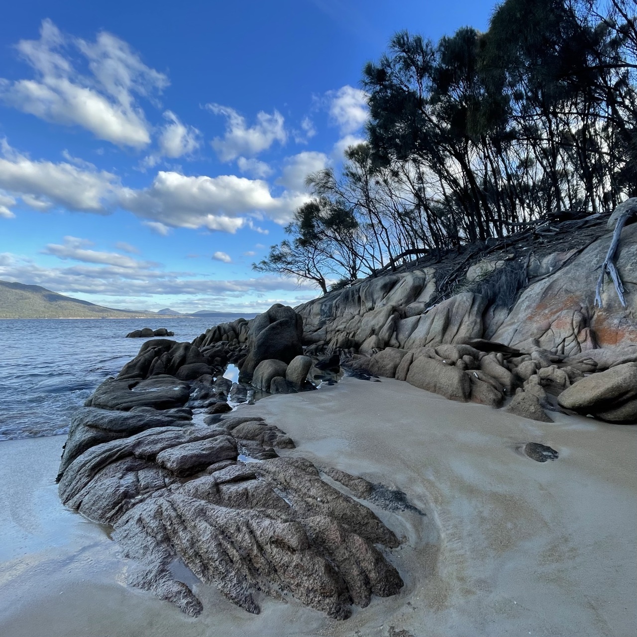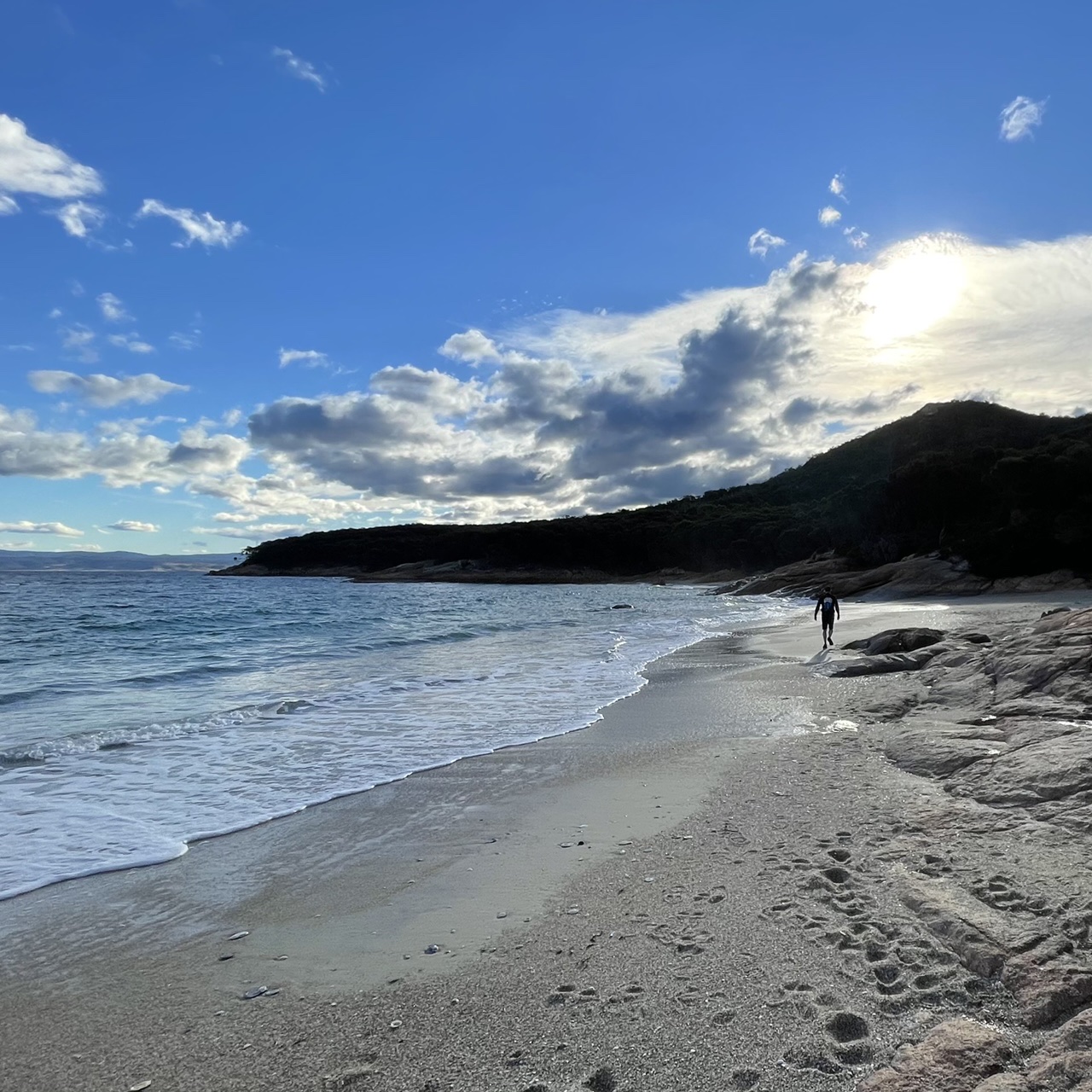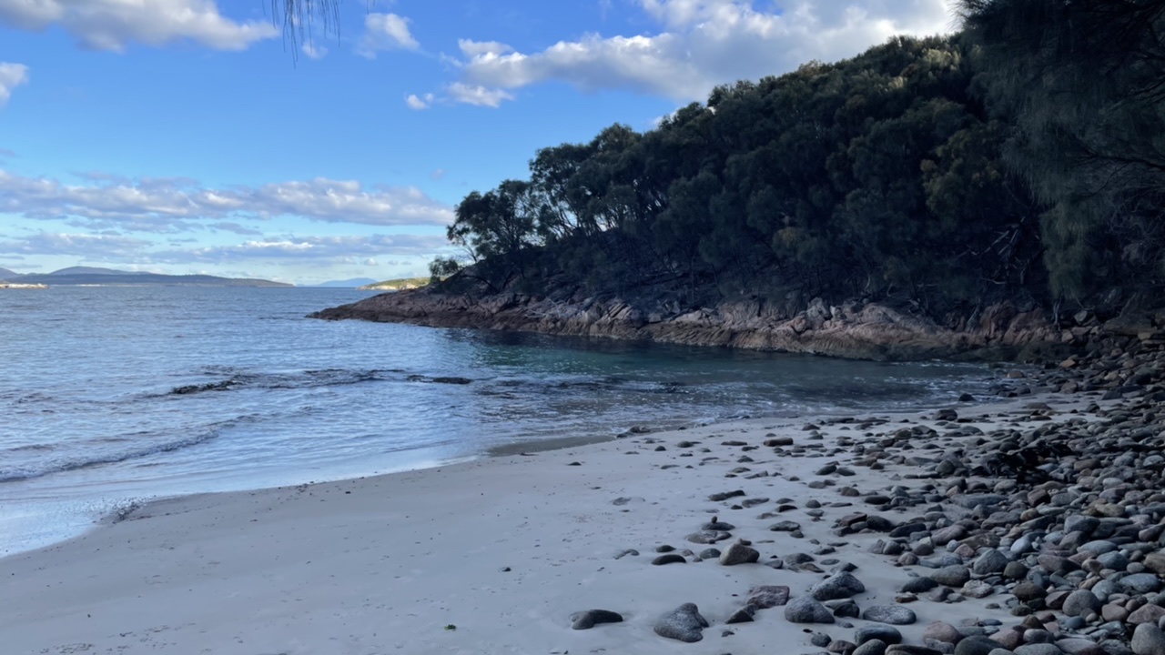 Plunging back into a pine forest, we enjoyed running on a bed of soft brown pine needles. We caught glimpses of a small cove through the wispy pine trees and followed an unofficial track down to the little beach.