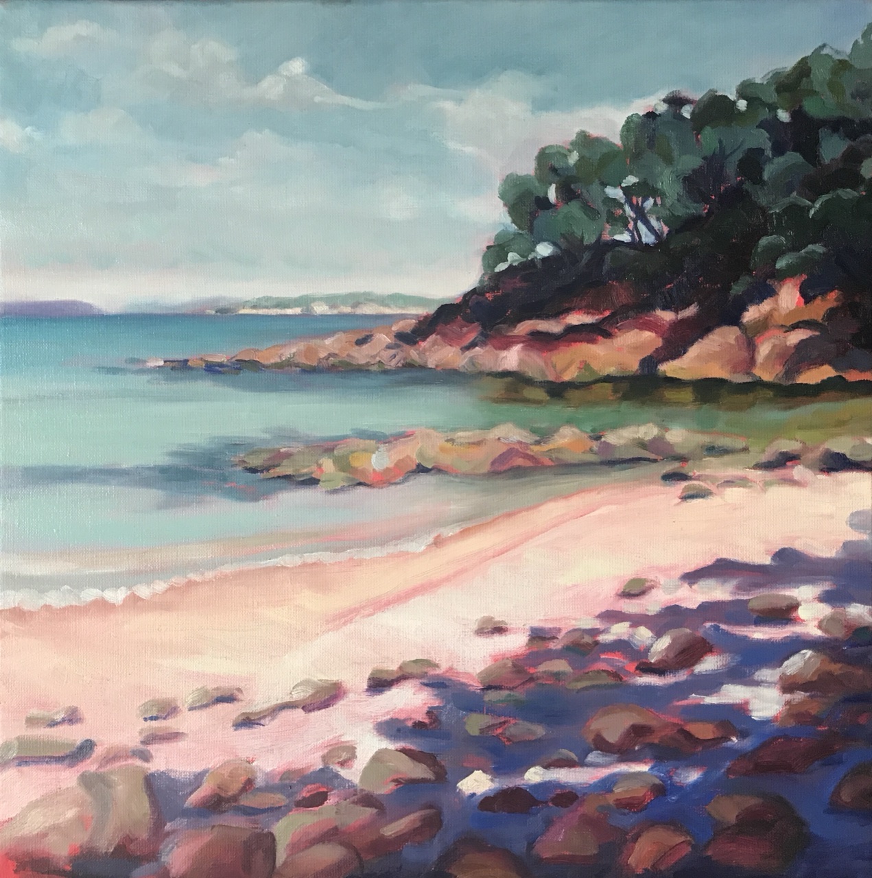 Further along we came to another little beach, that is very familiar to us. One of my paintings is of this beach. It’s an important painting for me because I feel like I found the beginning of my style. A seedling of an approach. It sits on the wall in our lounge room.