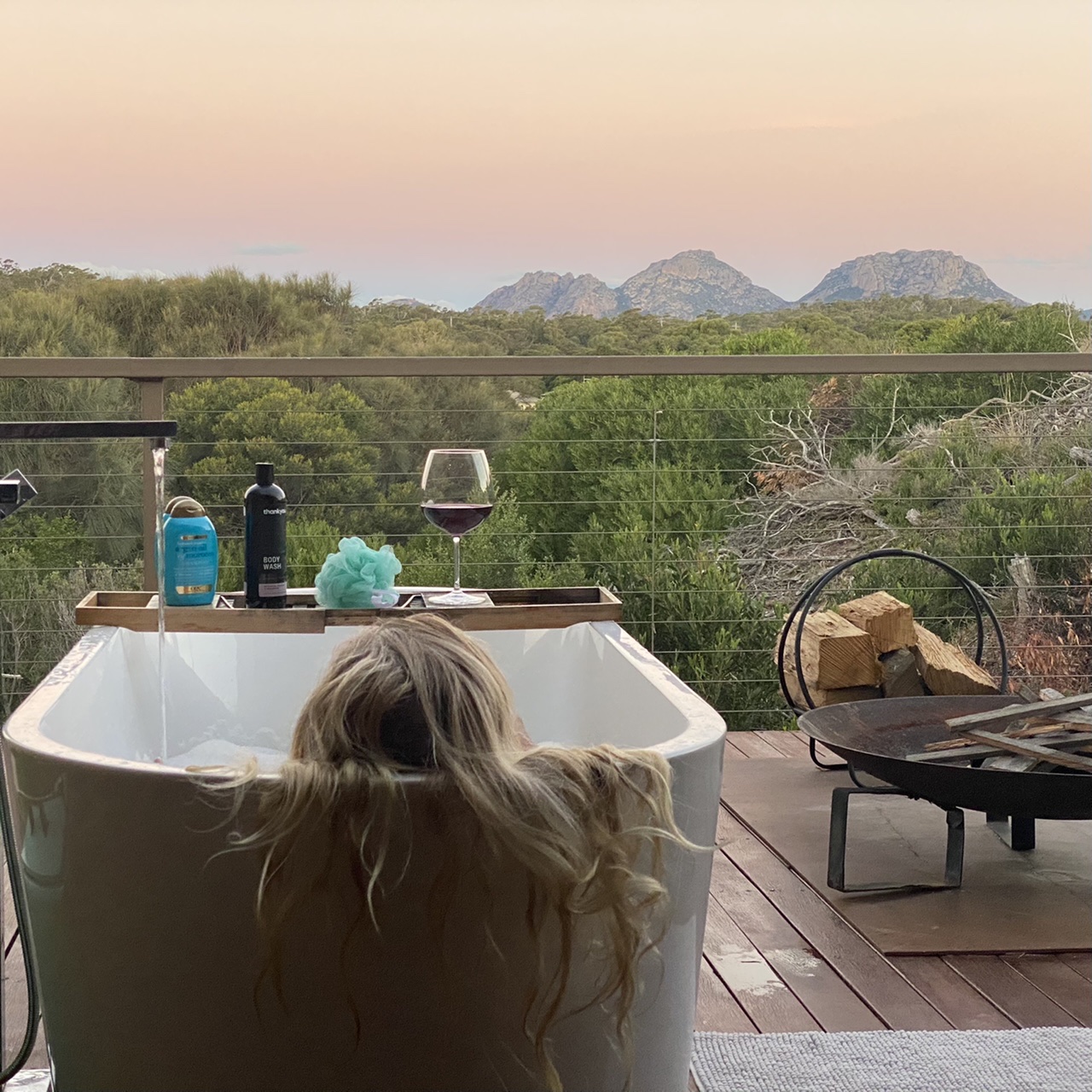 Tonight, I decided, was the perfect time to use the outside bathtub. A soak in a bubble bath watching the sunset over the Hazards, a super-moon rise, with a glass of wine.