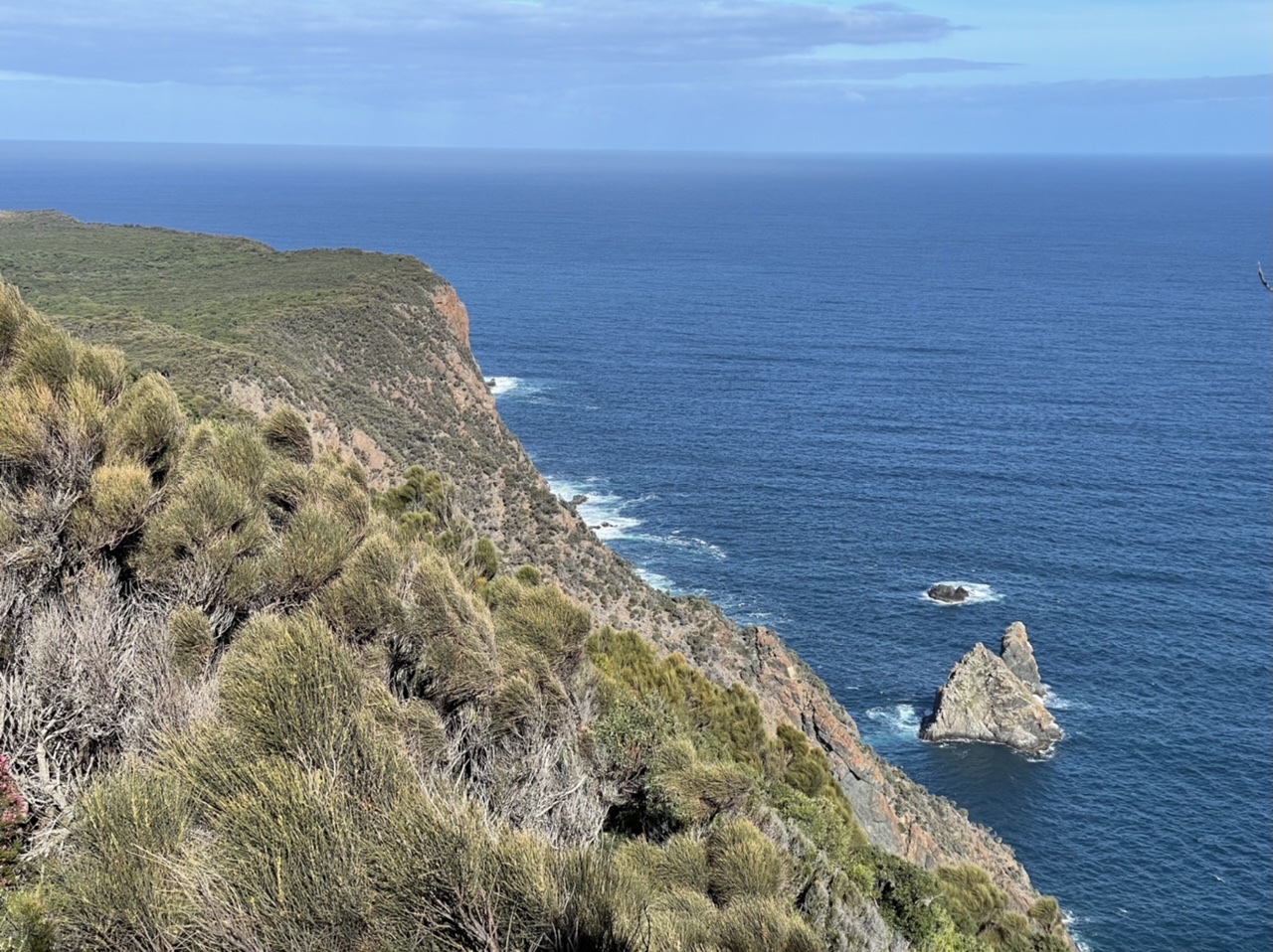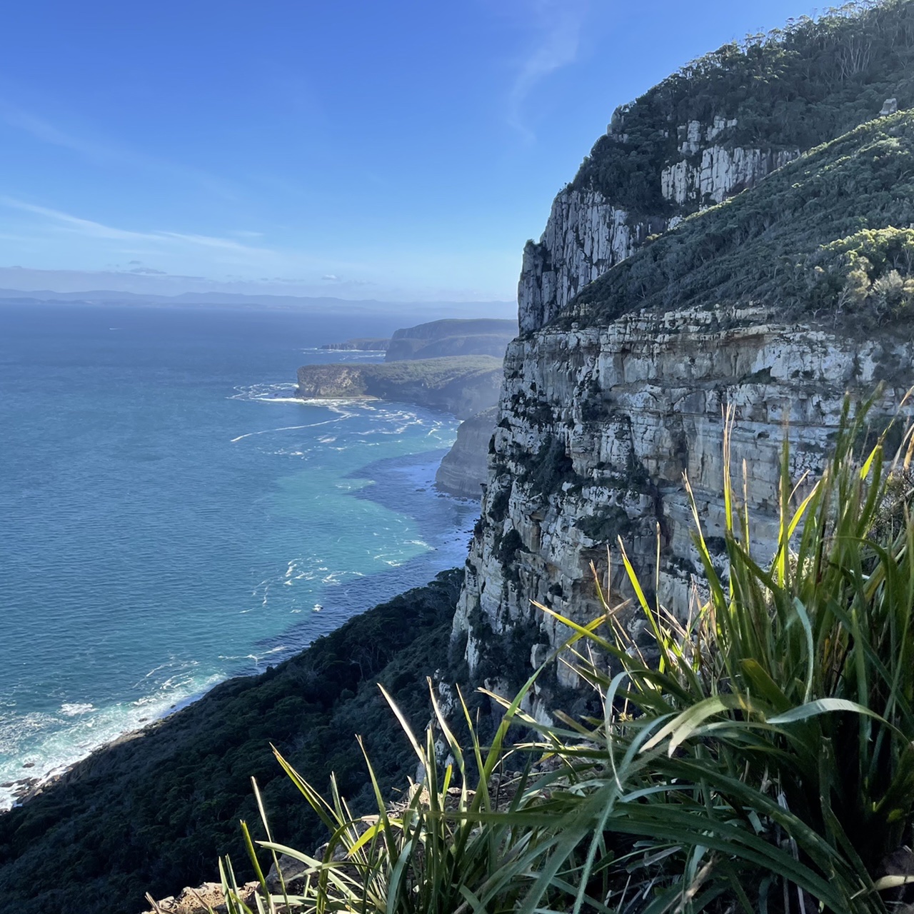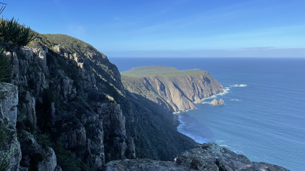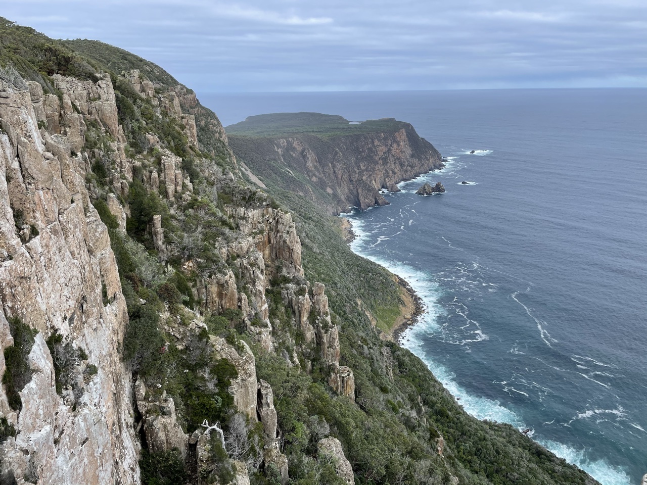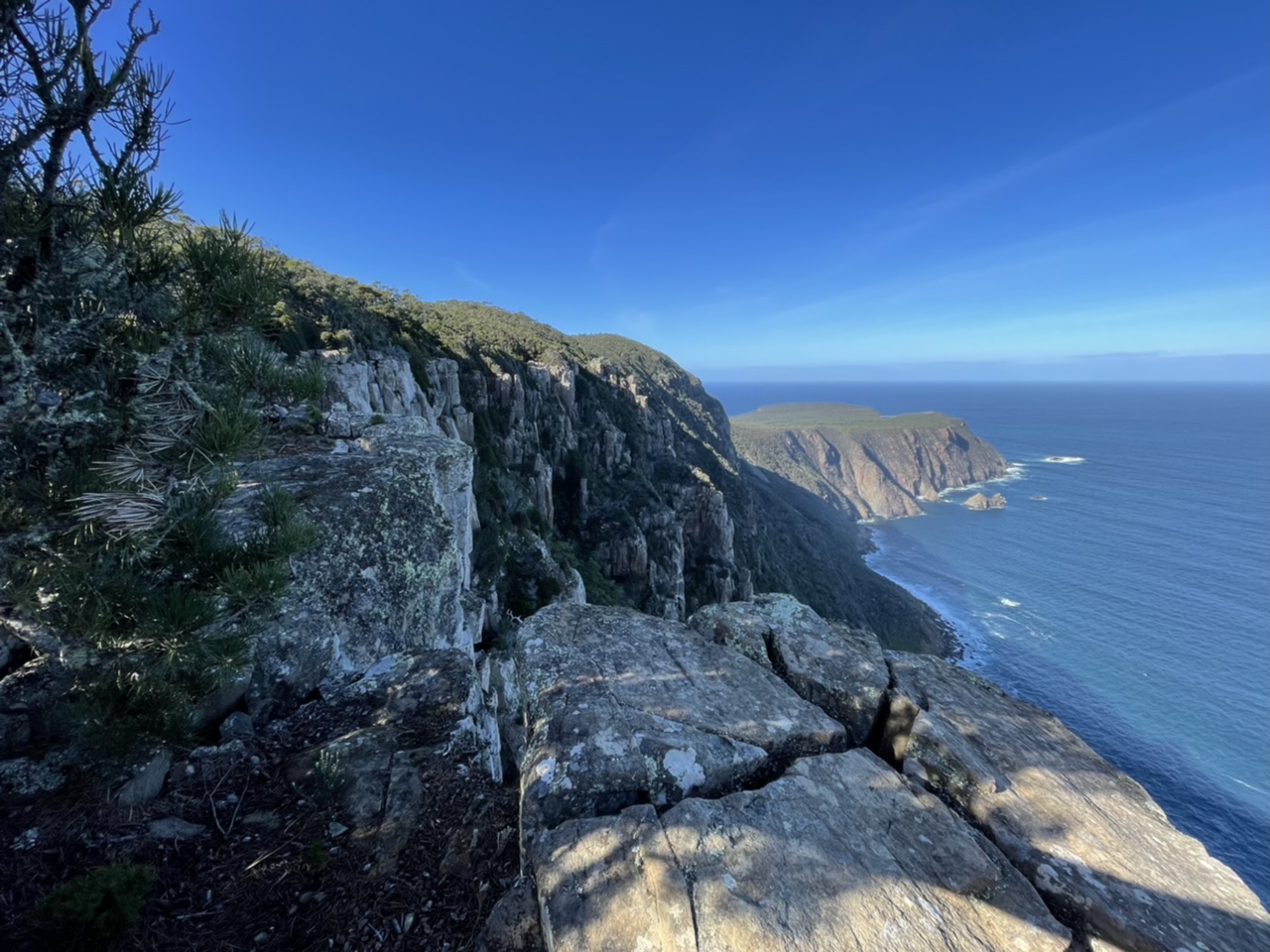 We found ourselves standing 450m above sea level on the edge of sheer sea cliffs. To the east, was Cape Raoul, the direction we were headed. To the west, are the blue cliffs of Bruny Island.