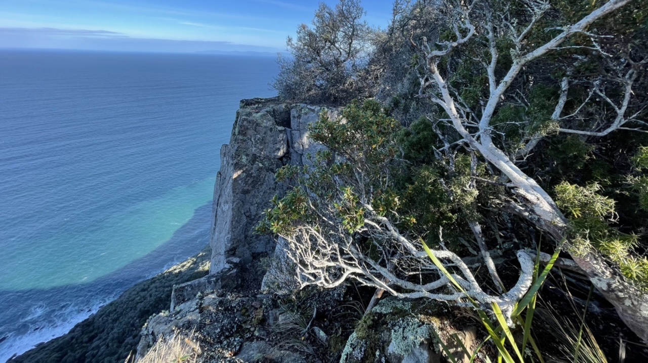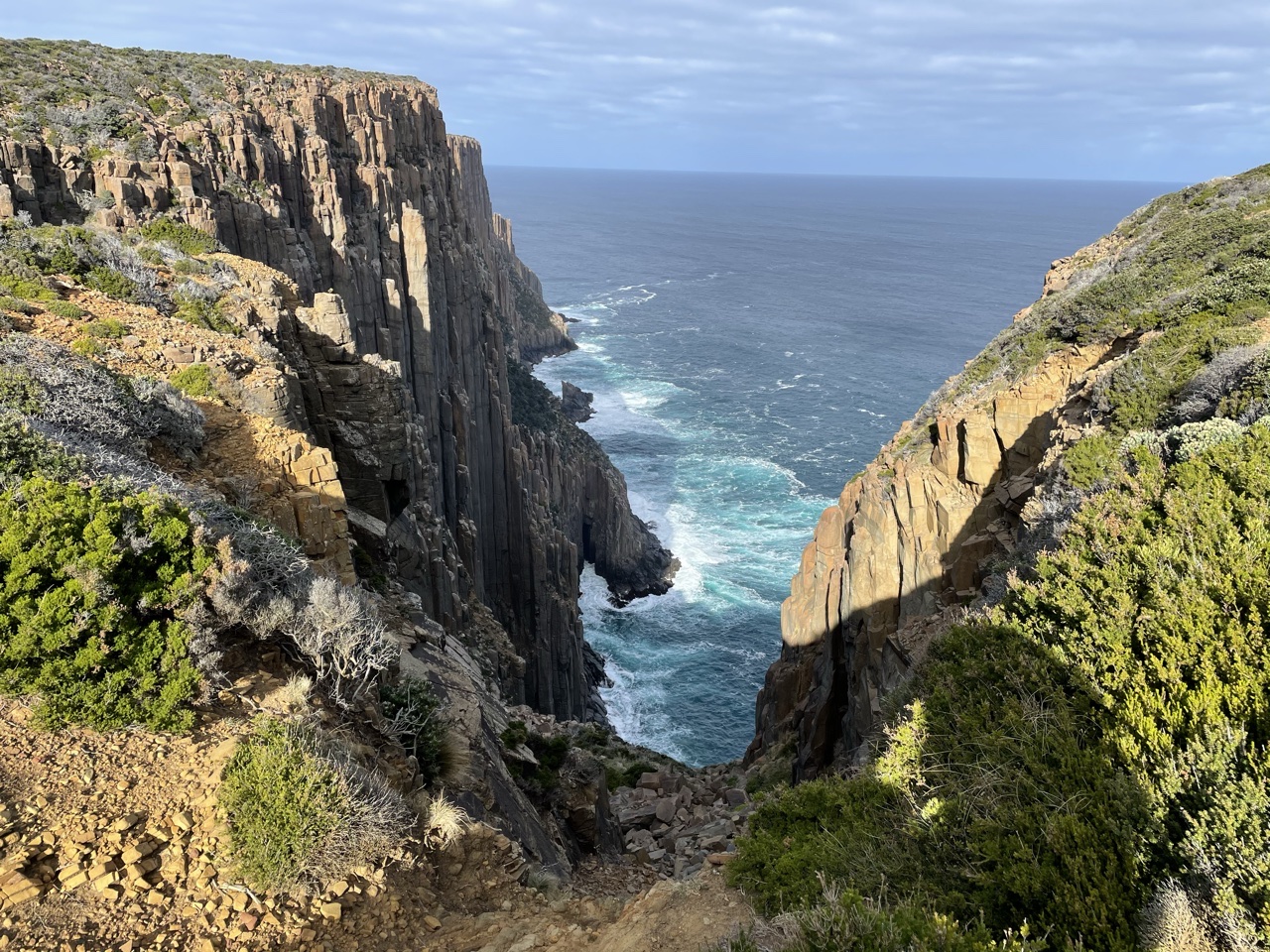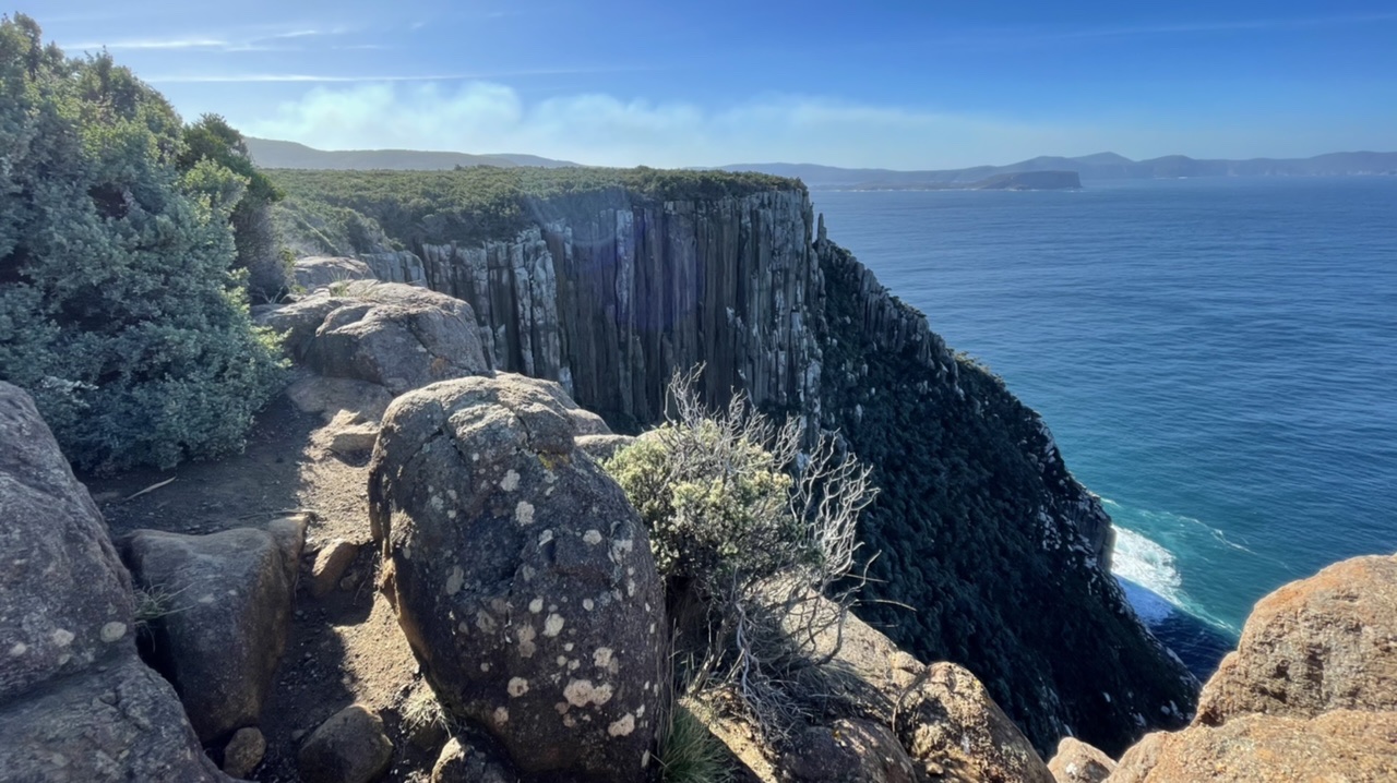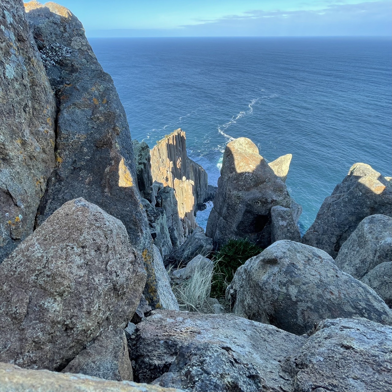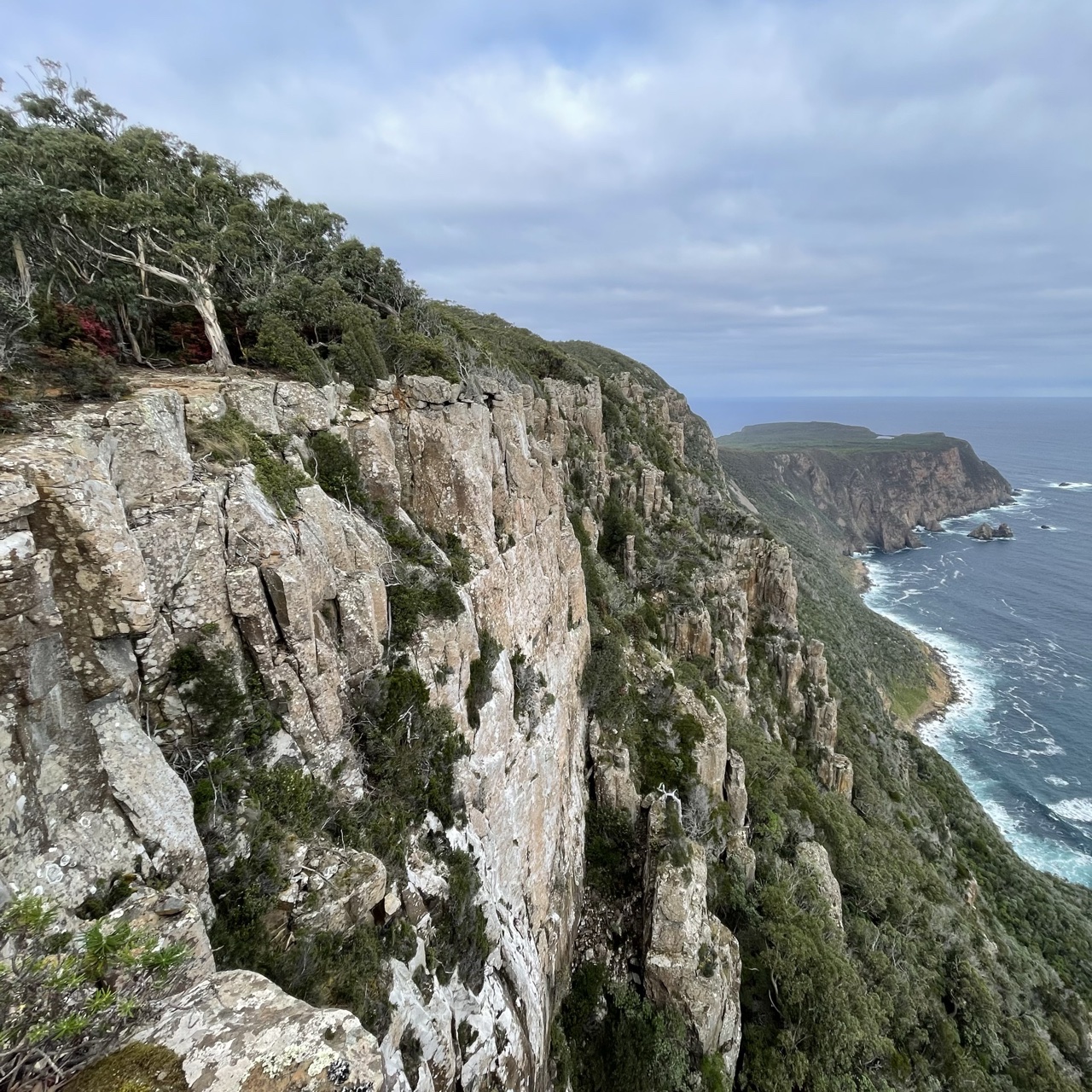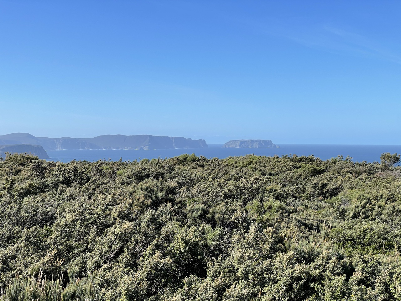 We found ourselves standing 450m above sea level on the edge of sheer sea cliffs. To the east, was Cape Raoul, the direction we were headed. To the west, are the blue cliffs of Bruny Island.