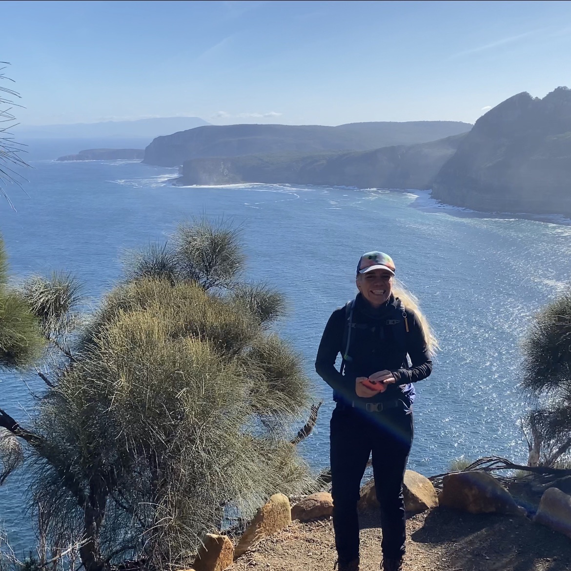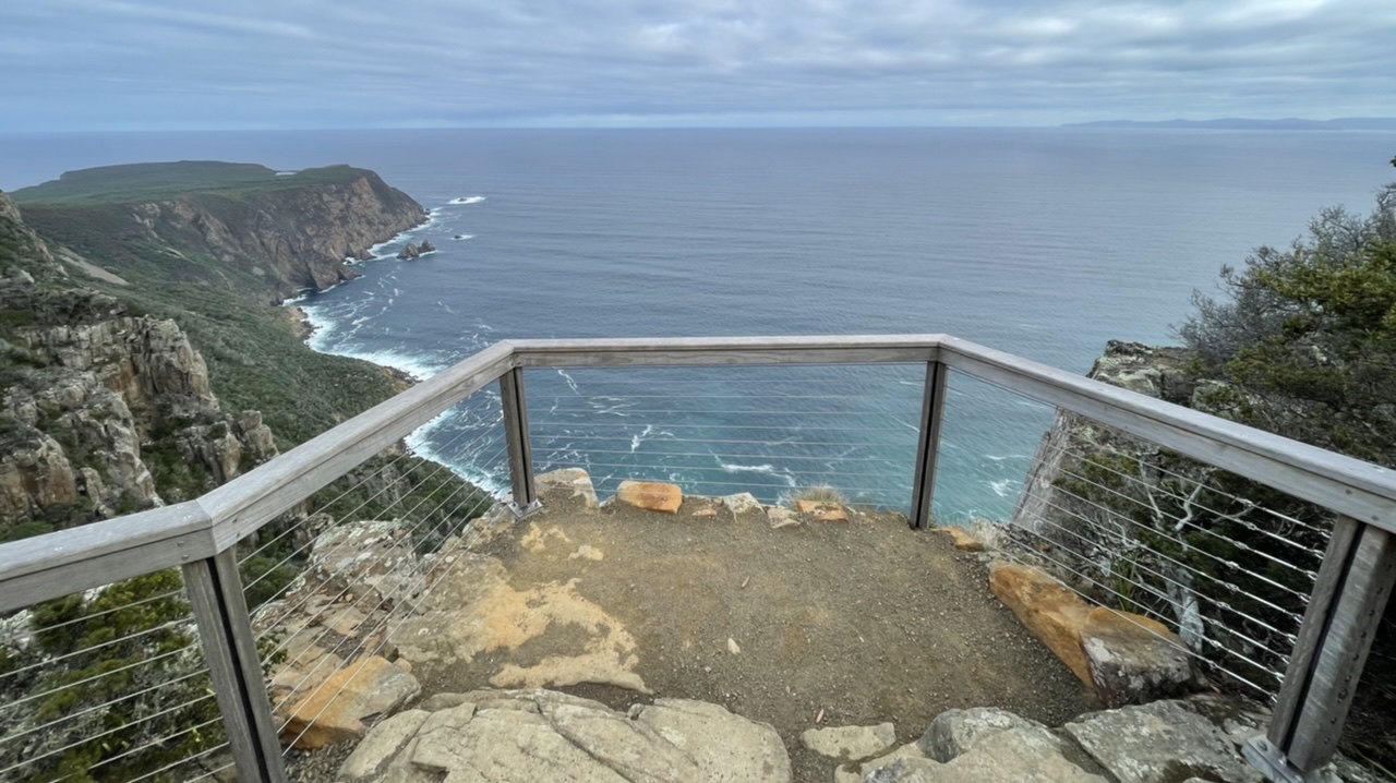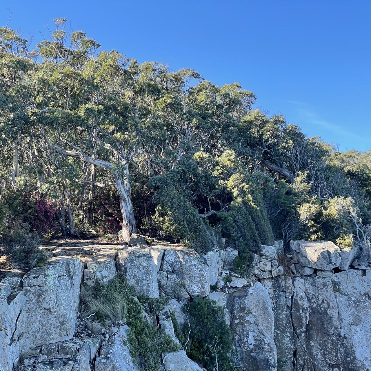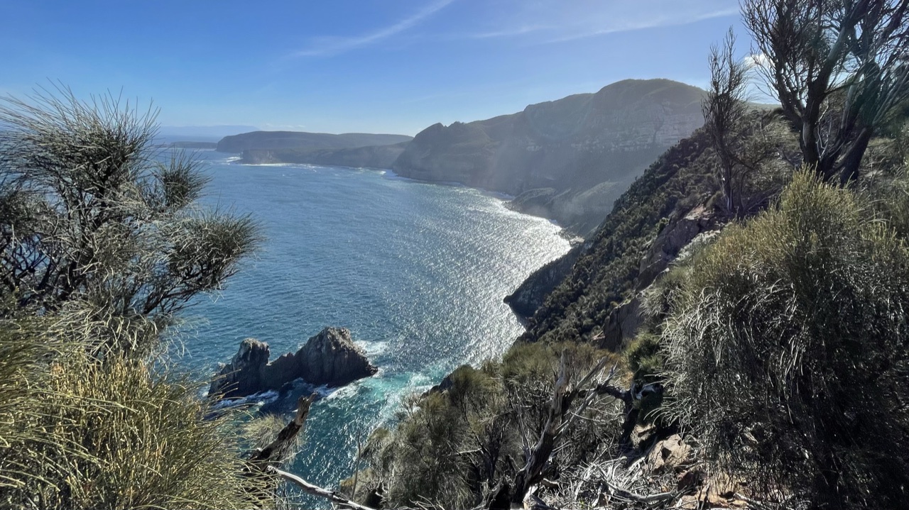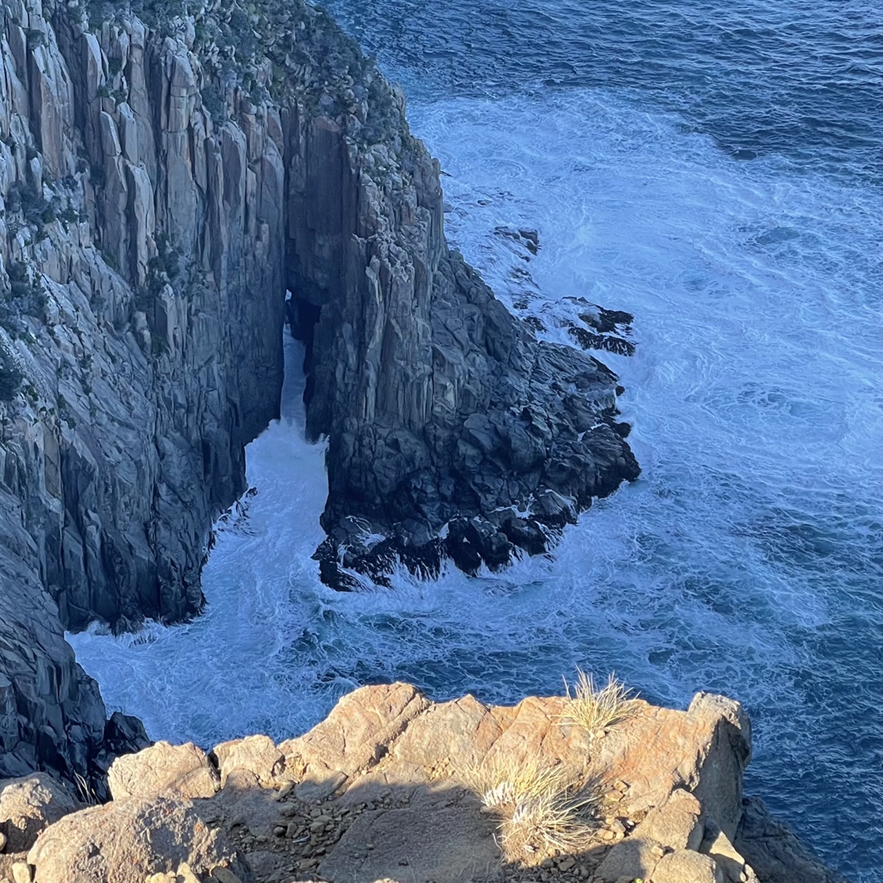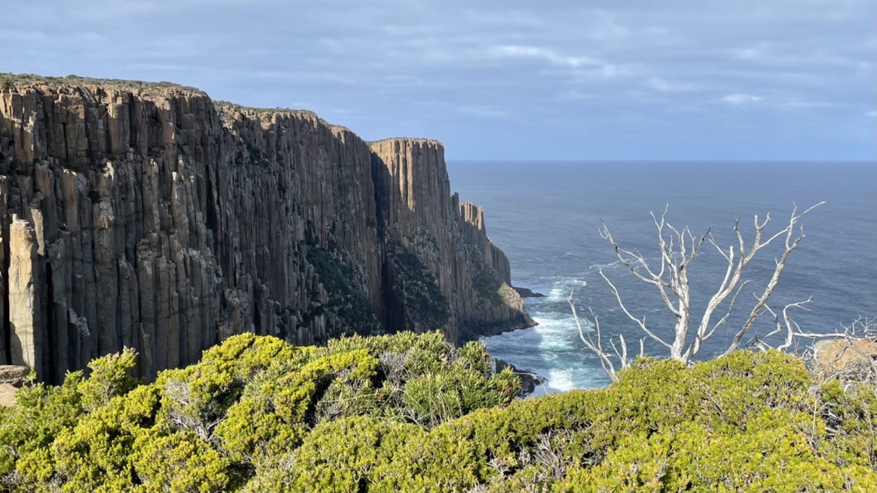 We found ourselves standing 450m above sea level on the edge of sheer sea cliffs. To the east, was Cape Raoul, the direction we were headed. To the west, are the blue cliffs of Bruny Island.
