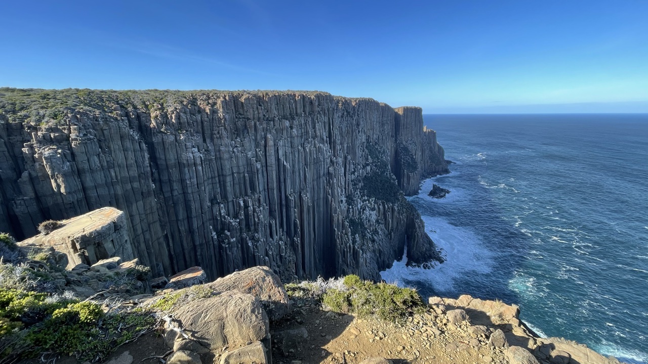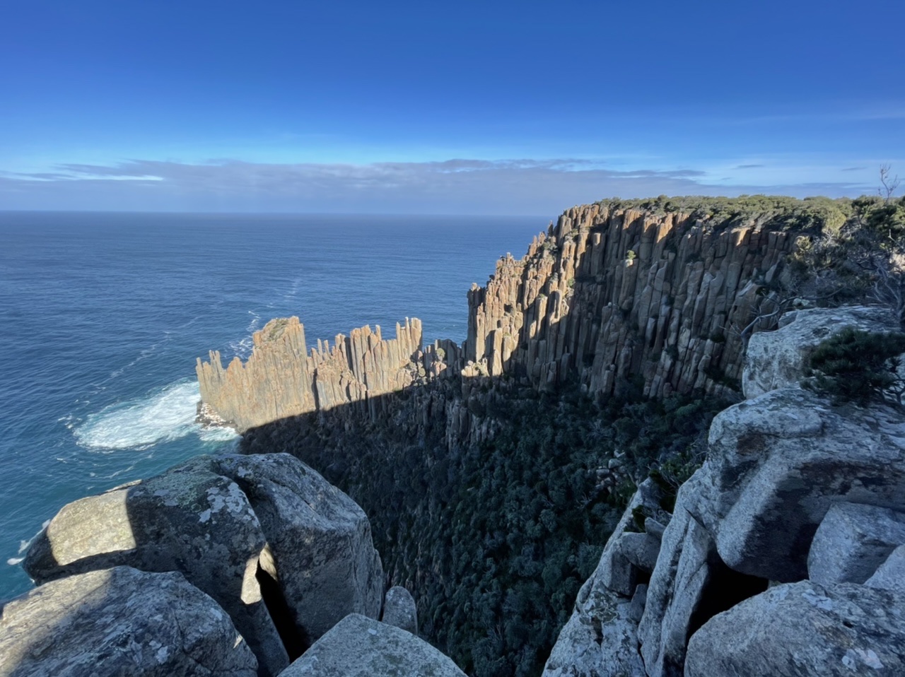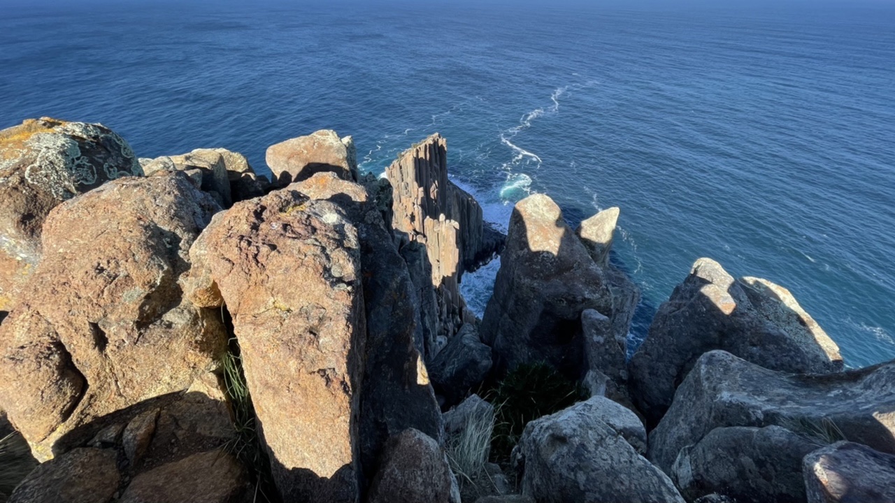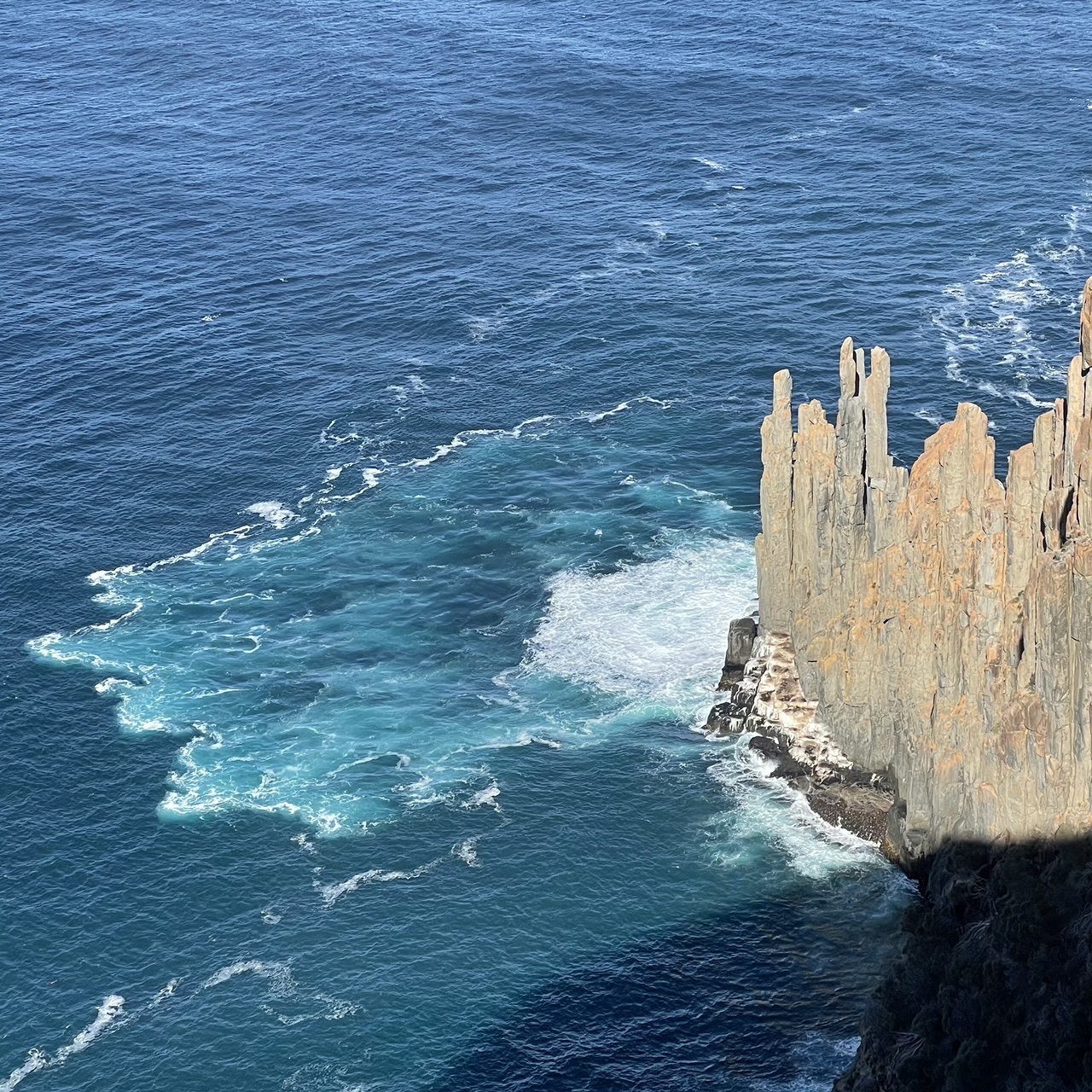 We stopped at the lookout points along the edge, trying to come to grips with this staggering sight. A sheer wall of towering dolerite columns. Around 200 meters high, plunging straight down, in places. The sea below seem to move in slow motion, washing against the columns.