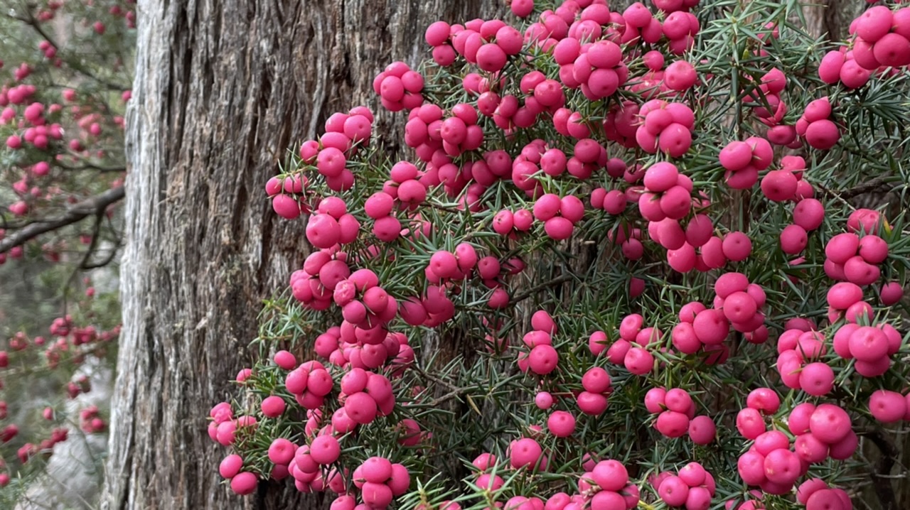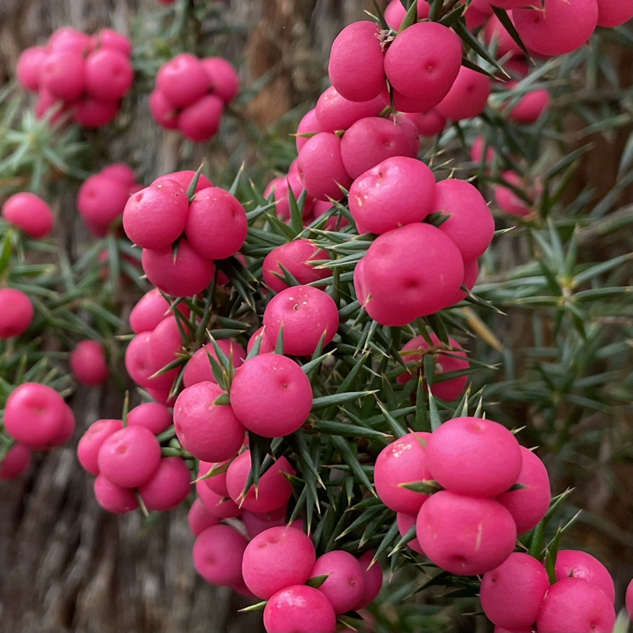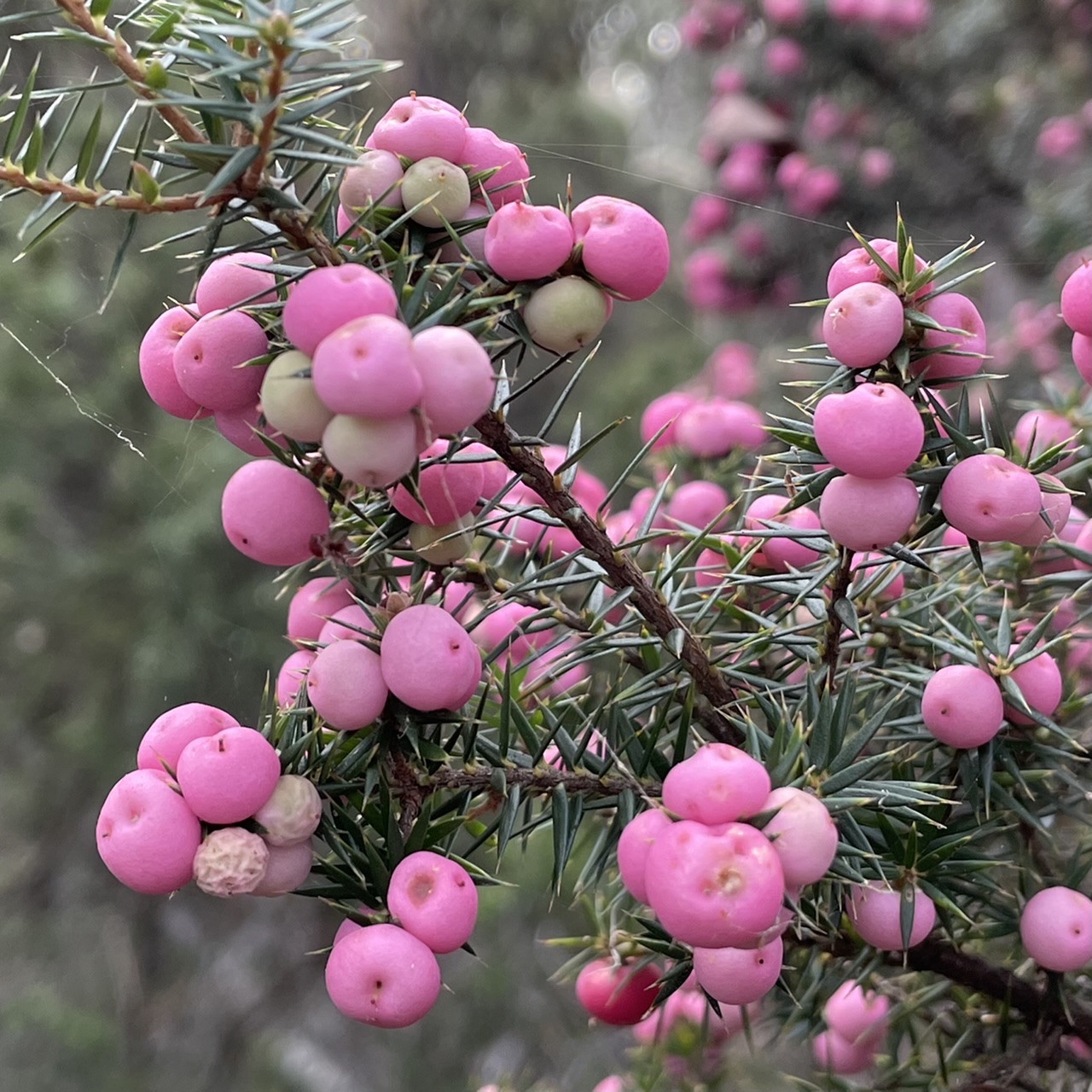 We fired off a quick text to the family to let them know where to look for us if we go missing and set off on the trail. Meandering uphill through dry eucalypt forest, we came across spiky bushes laden with pink berries.