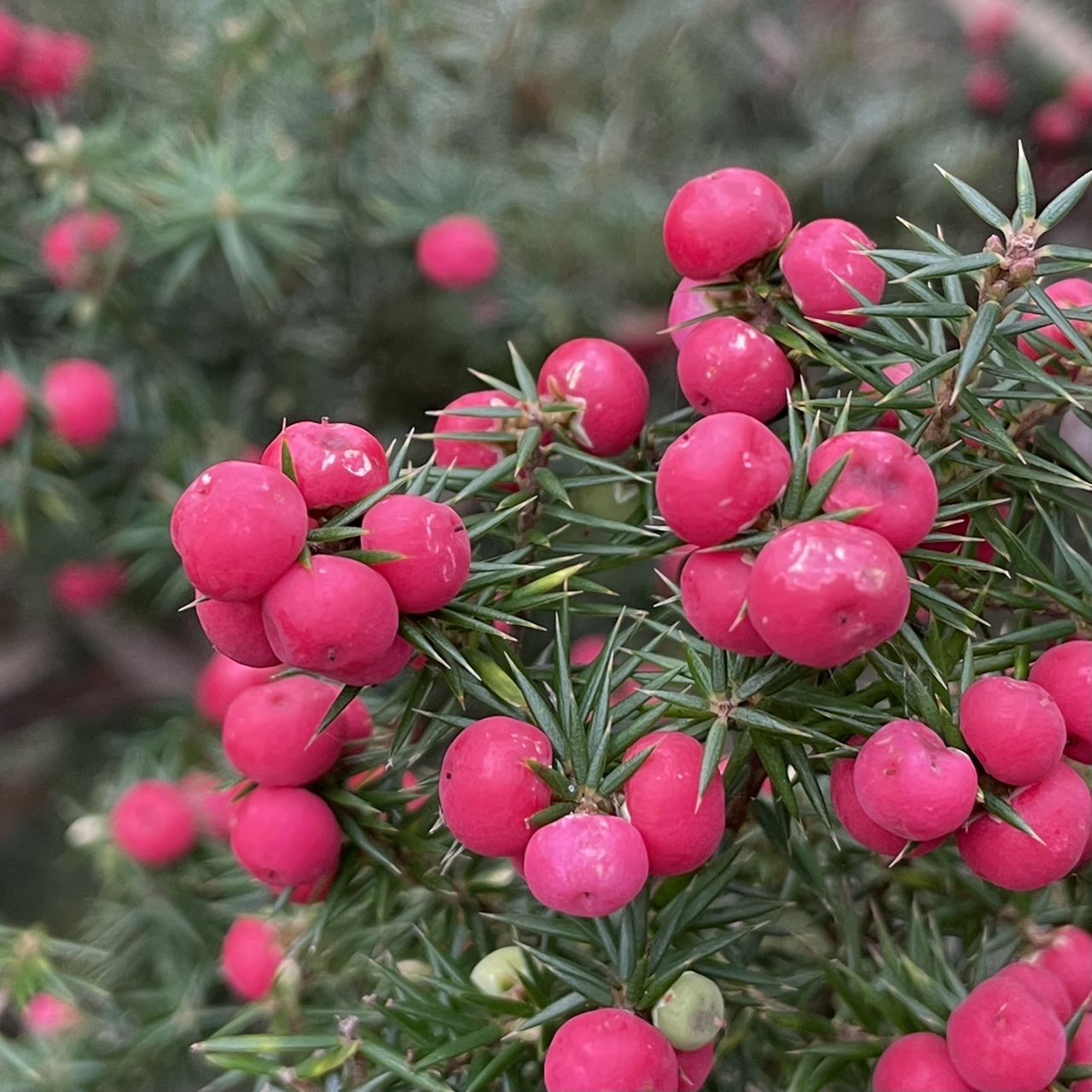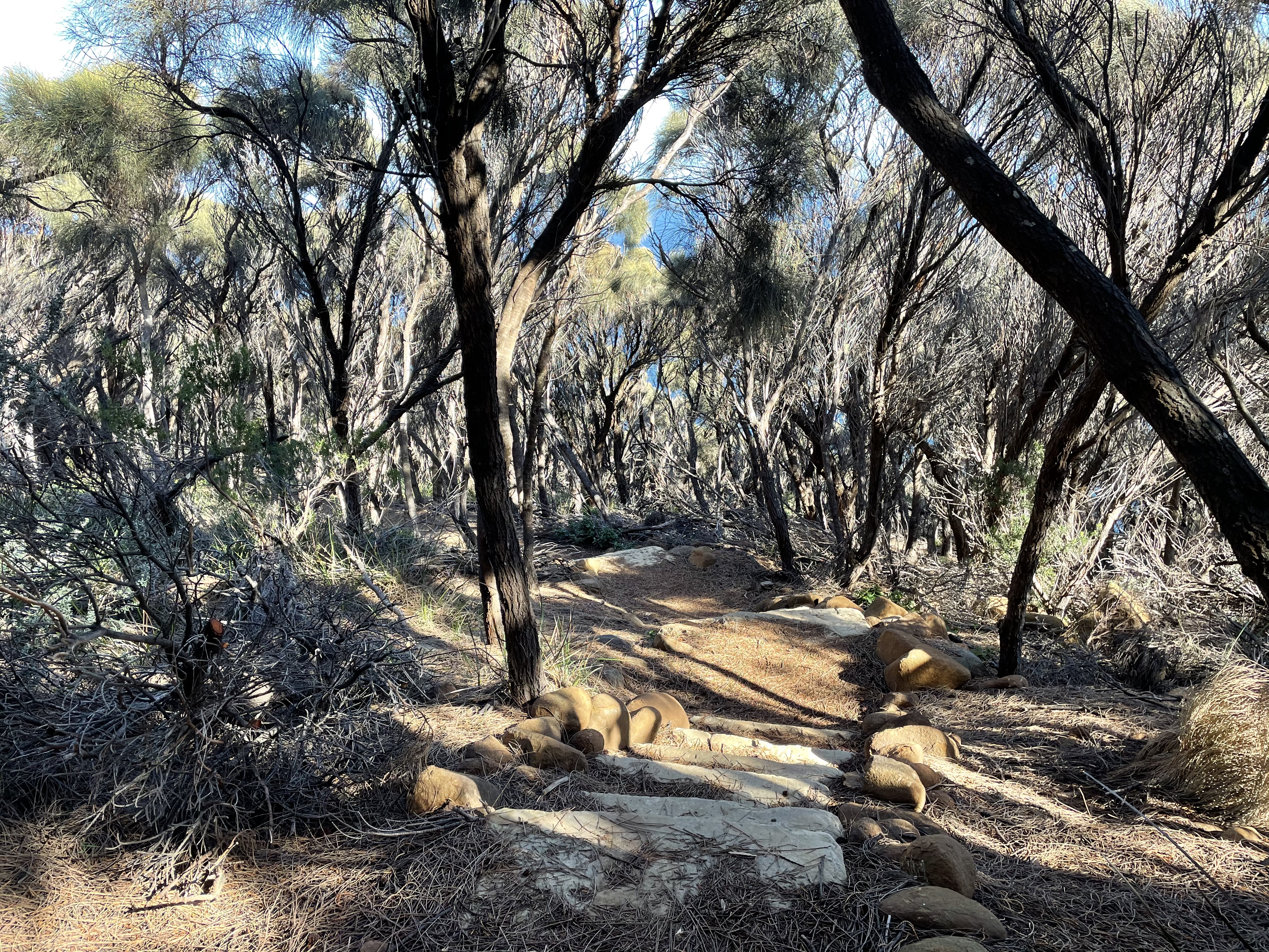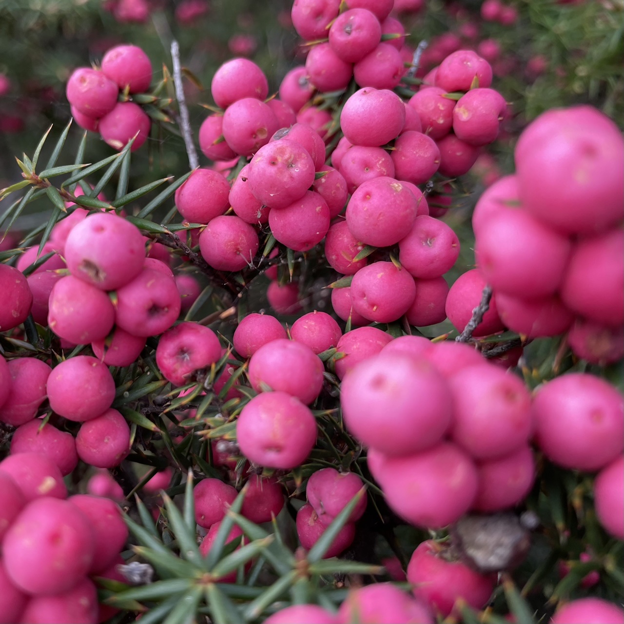 We fired off a quick text to the family to let them know where to look for us if we go missing and set off on the trail. Meandering uphill through dry eucalypt forest, we came across spiky bushes laden with pink berries.