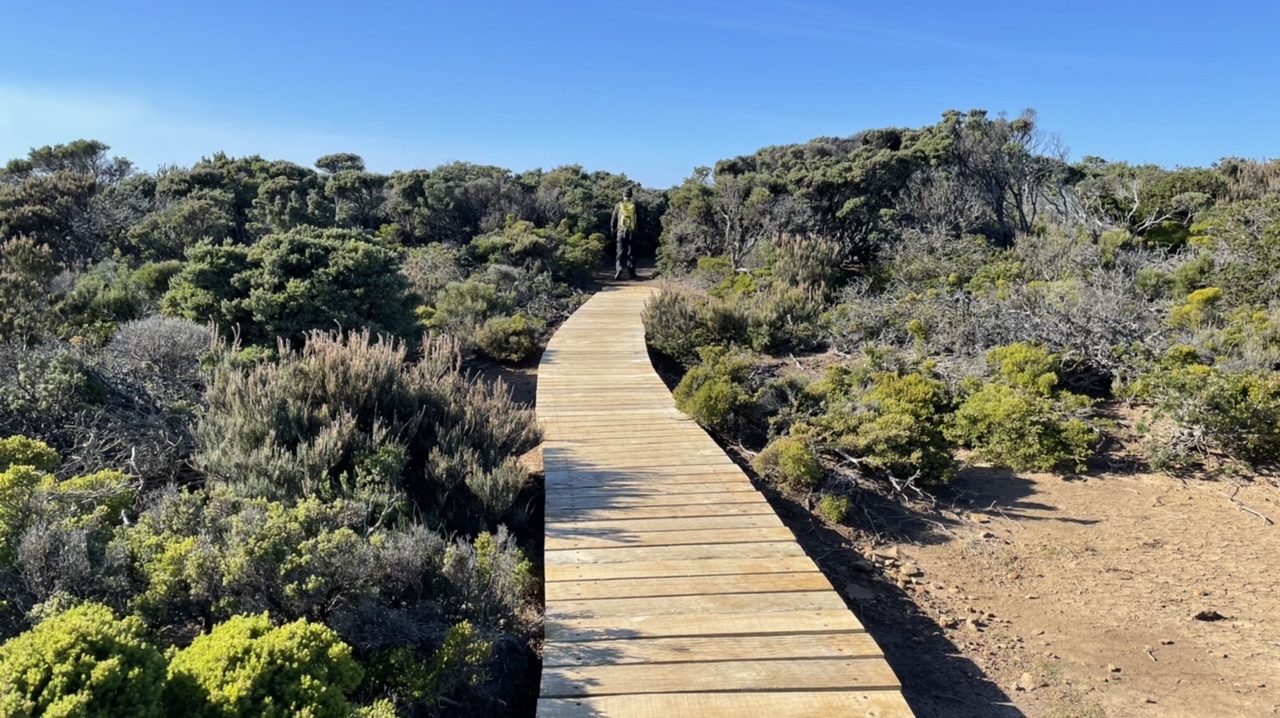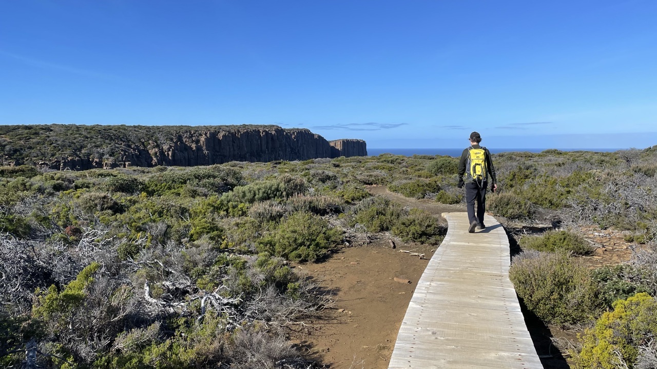 A section of boardwalk curved gracefully through the last of the plateau. Turning a bend, suddenly we stepped onto the windswept escarpment of the cape. A spectacular wall of dolerite columns dominated the horizon.