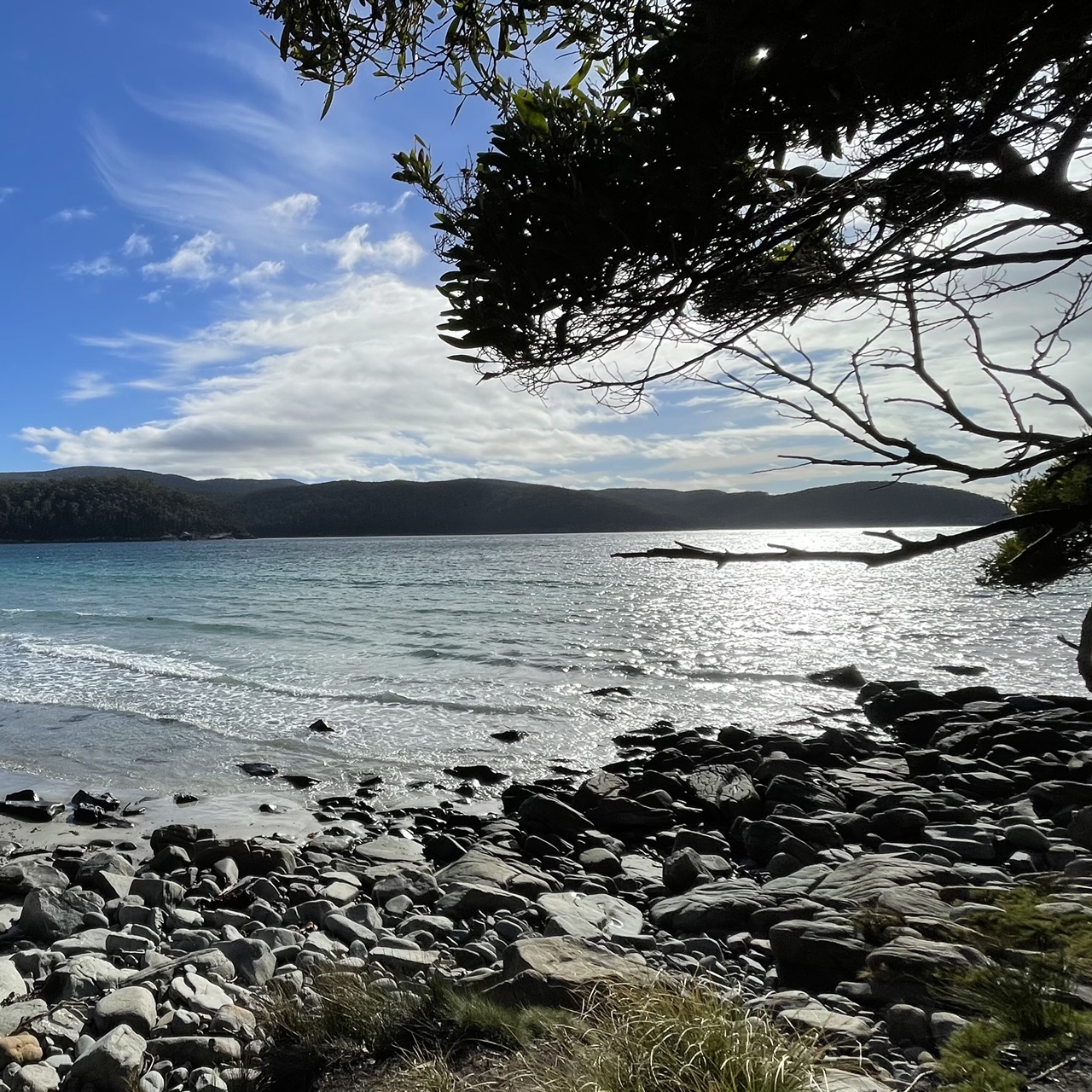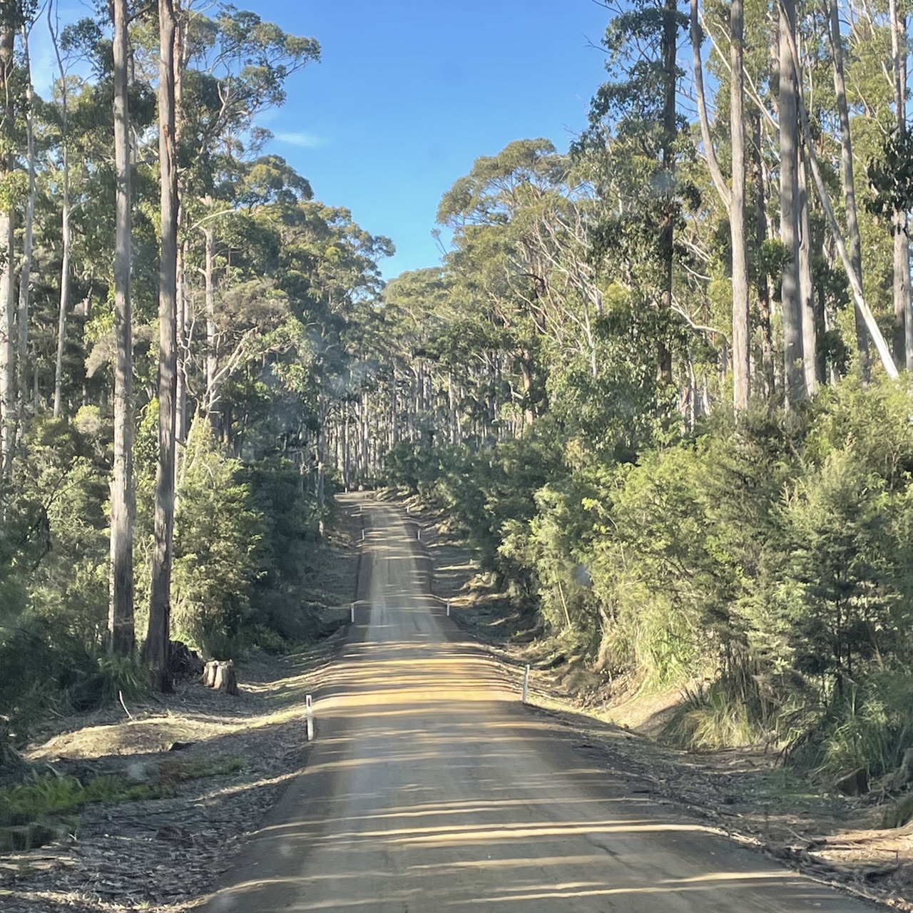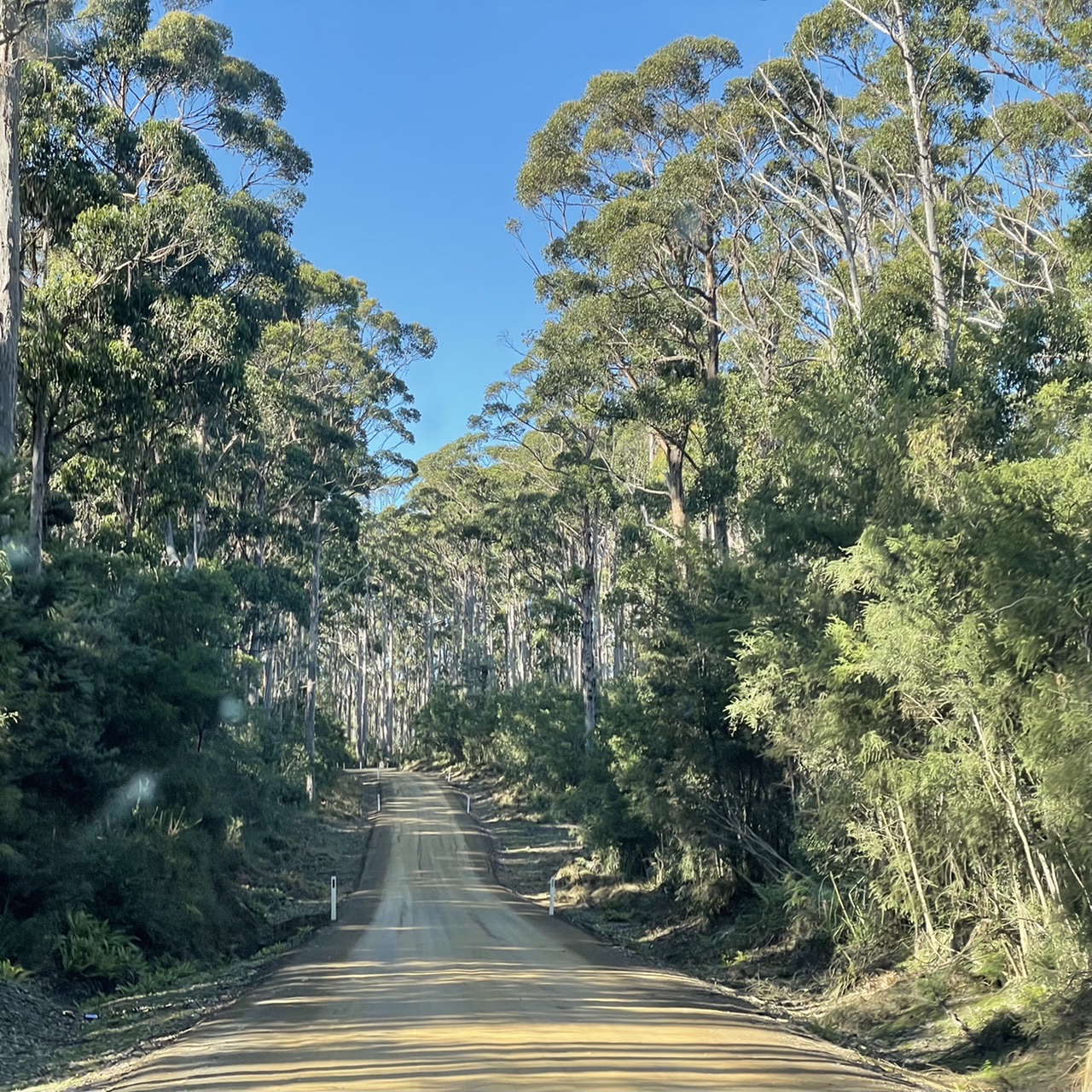 The drive into Fortescue Bay took us through a forest reserve of towering gums. Sunlight flickered through the leaves.