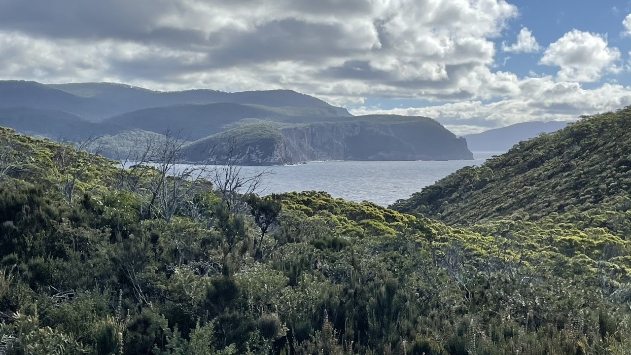 A few kilometres later and the track flattened to a boardwalk that lead us to the edge of the eucalypt forest. The view suddenly revealed the Cape ahead, and cliffs into the distance further north.