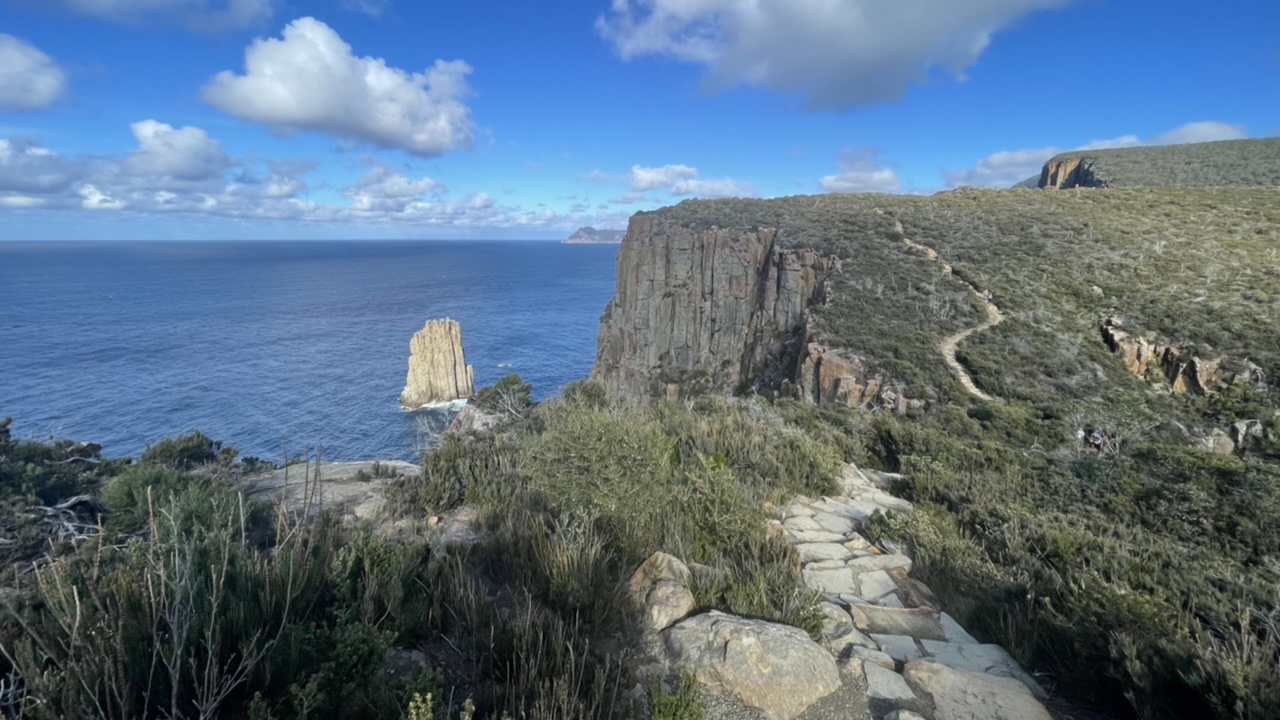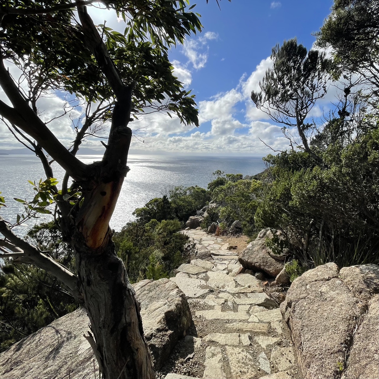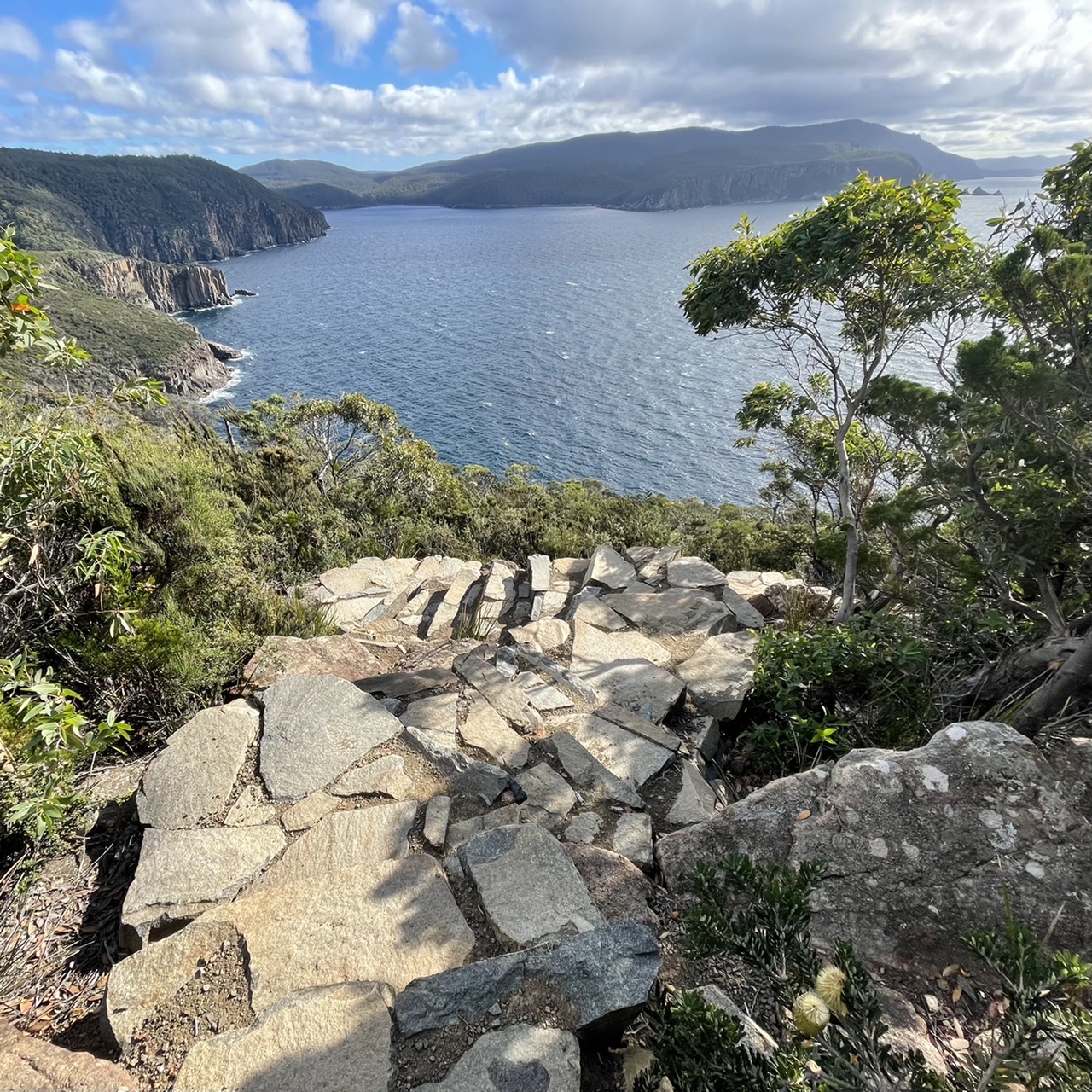 “Wow!” Steep cliffs plunged to the sea and we could see the track etched into the headland. And oh look, more stairs.
