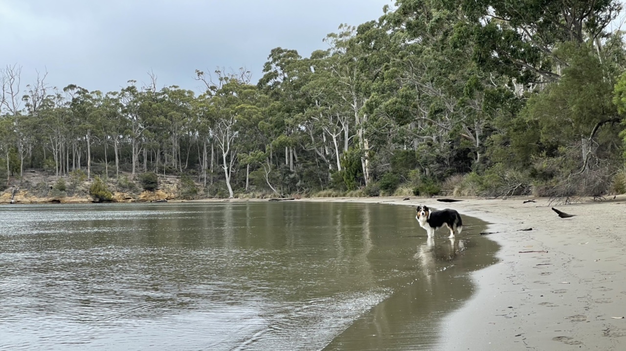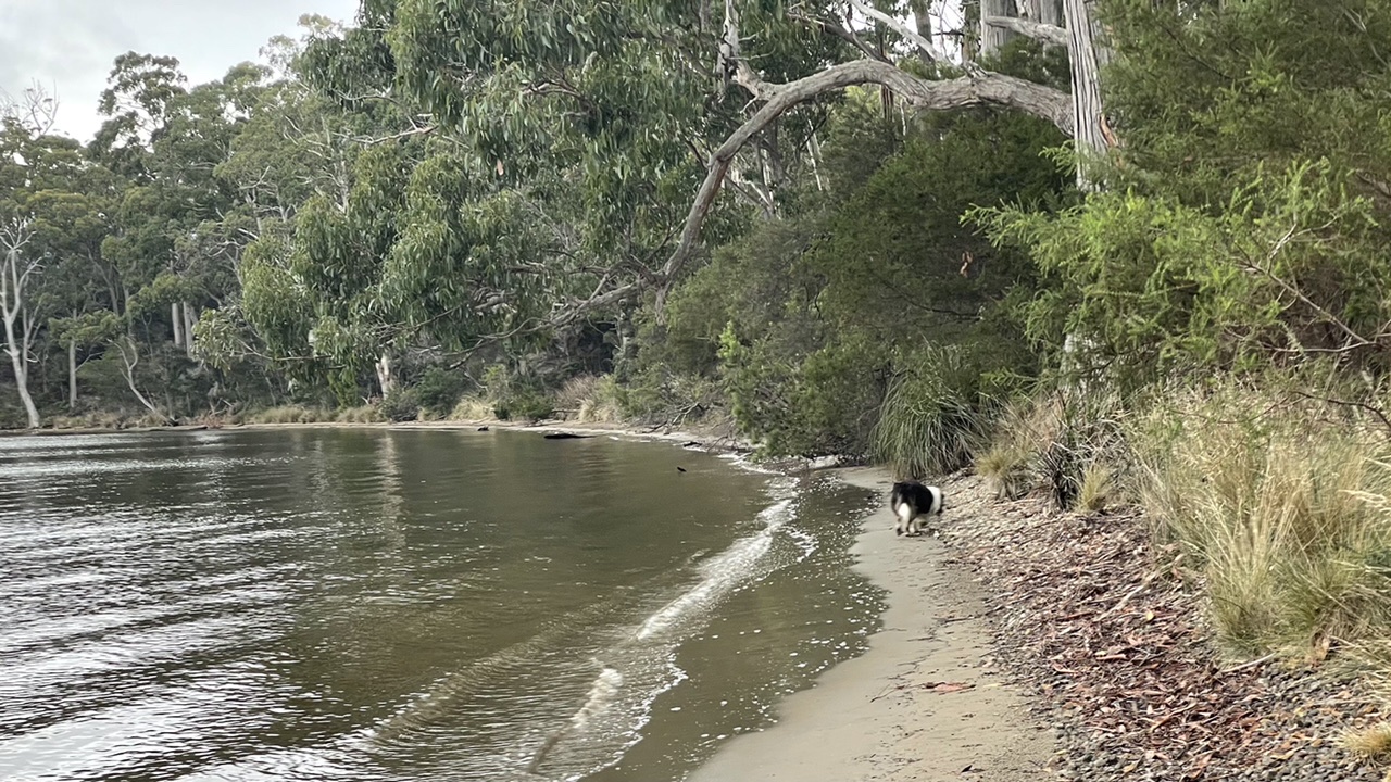 Beau, keen to get on with it, was waiting by the next gate at the bottom of the field. This lead us down onto the banks of the Huon River and to a timber picnic table.