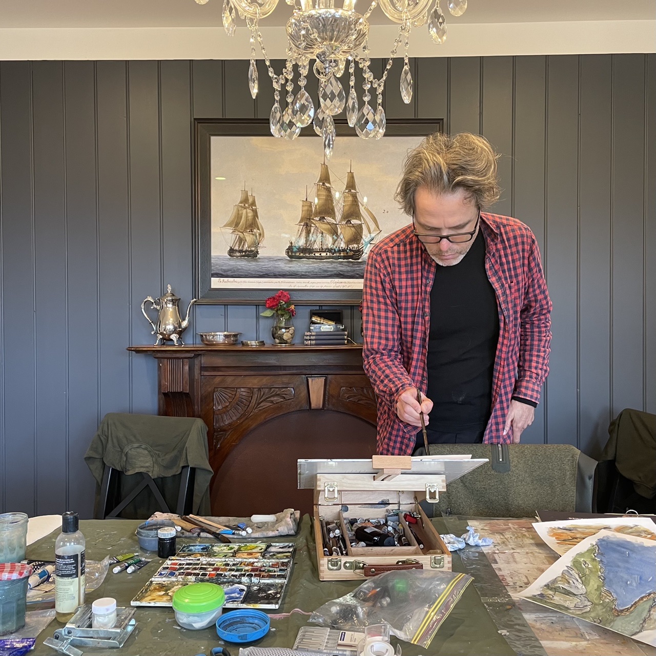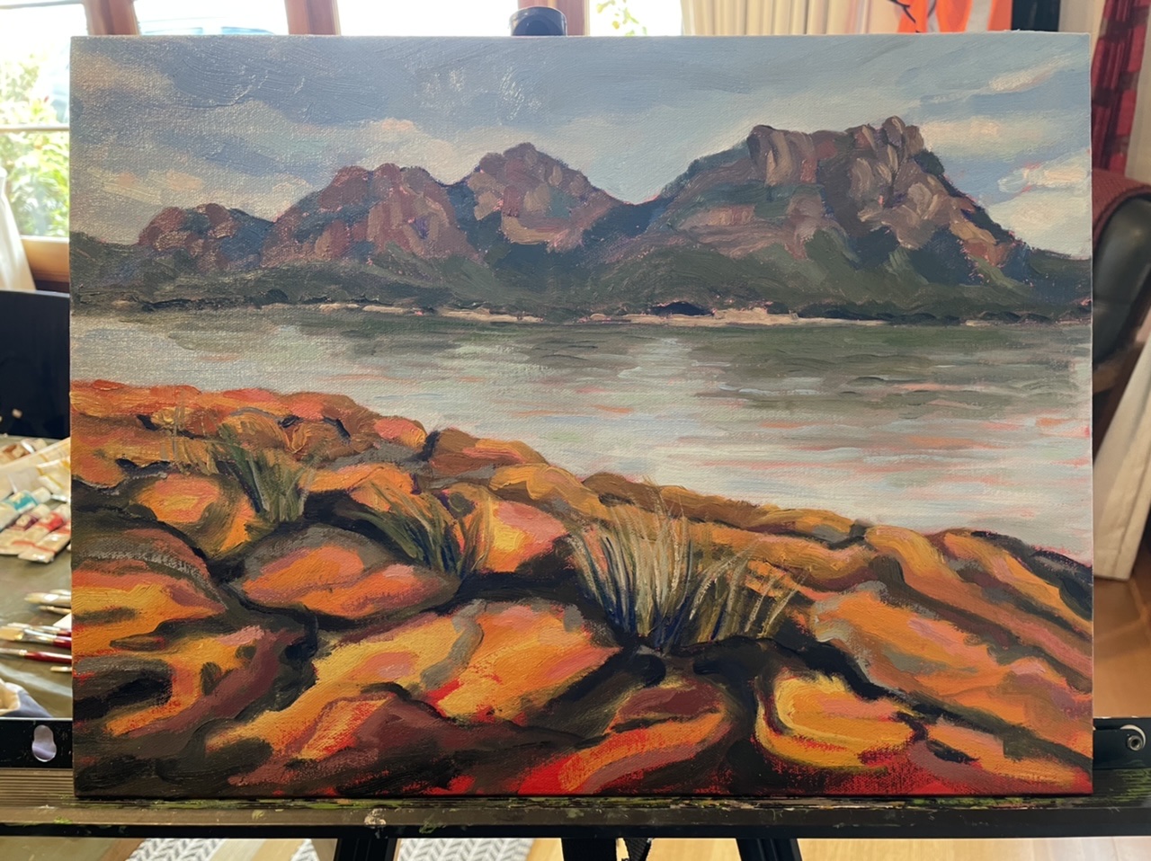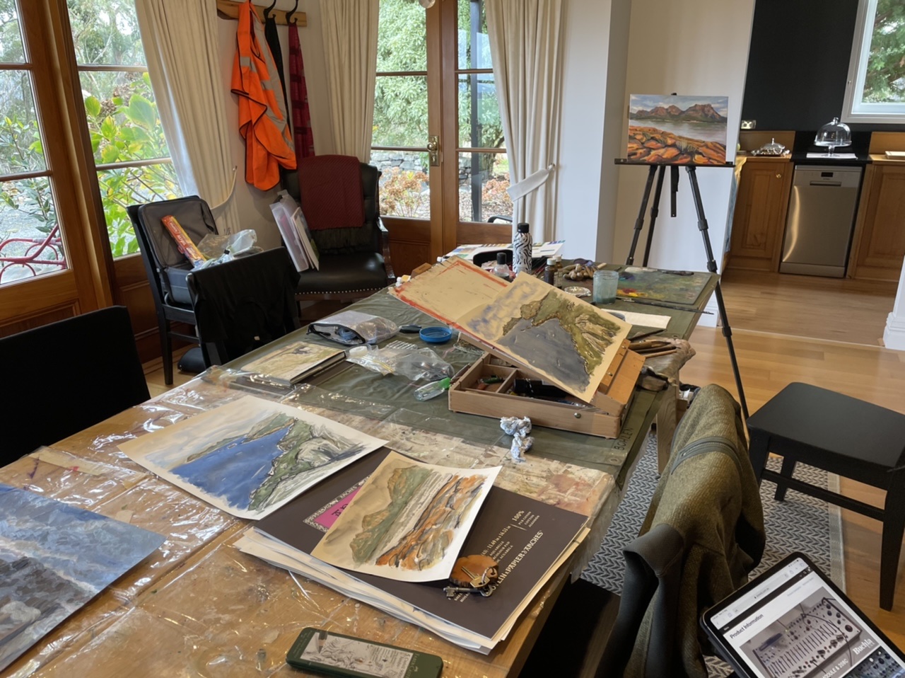 We made good use of the huge dining table, it was such a relief to leave the studio set up each night and come down in the morning. I was busy working on an oil painting of the Hazards in Coles Bay, and Dave had fun experimenting with watercolour, practising being “fast and loose” as Debbie Mackinnon would say.