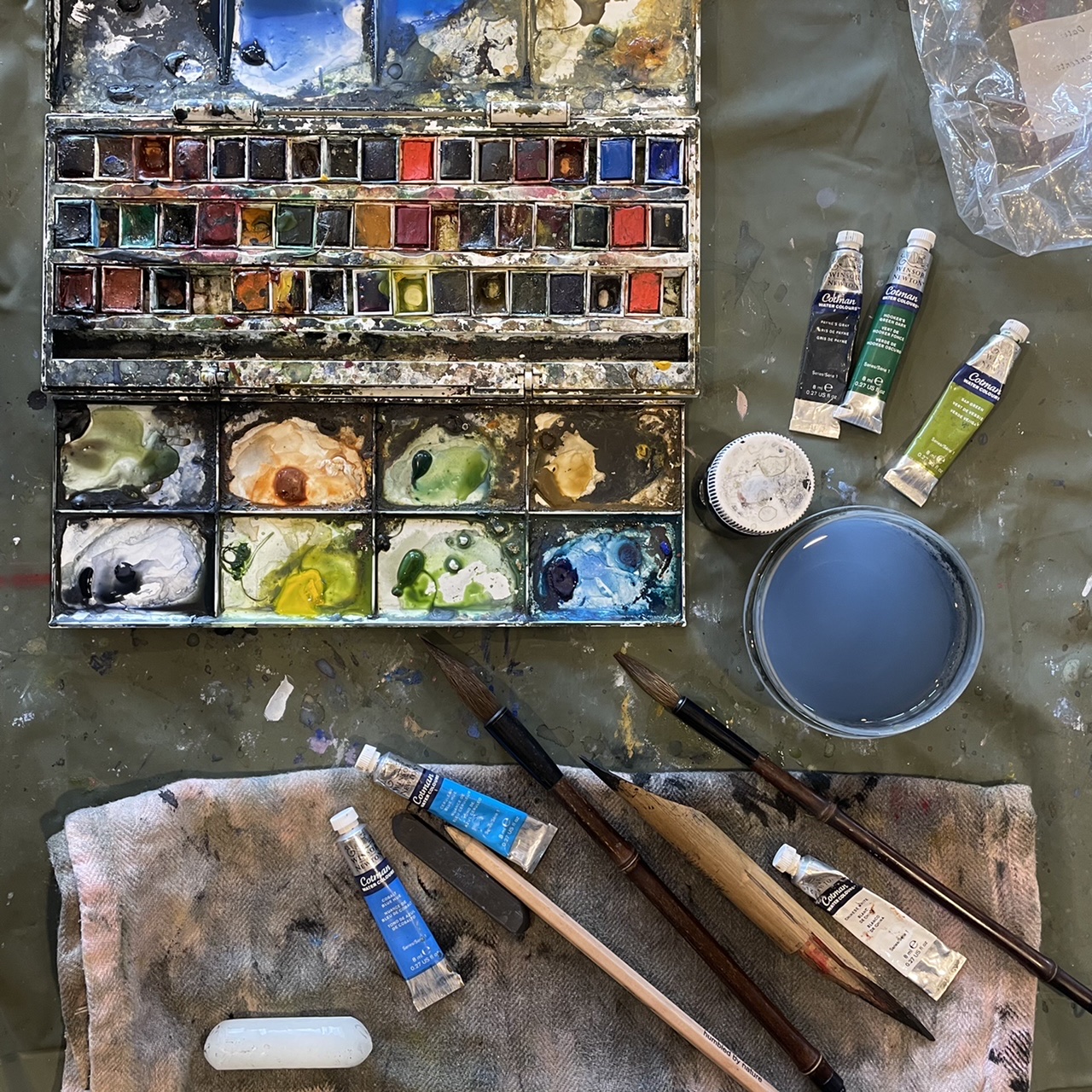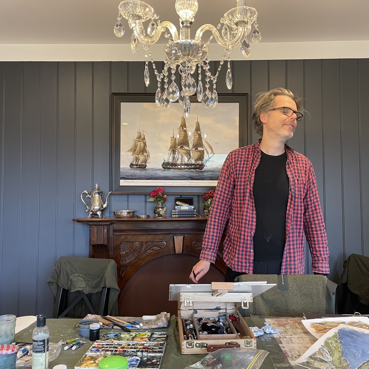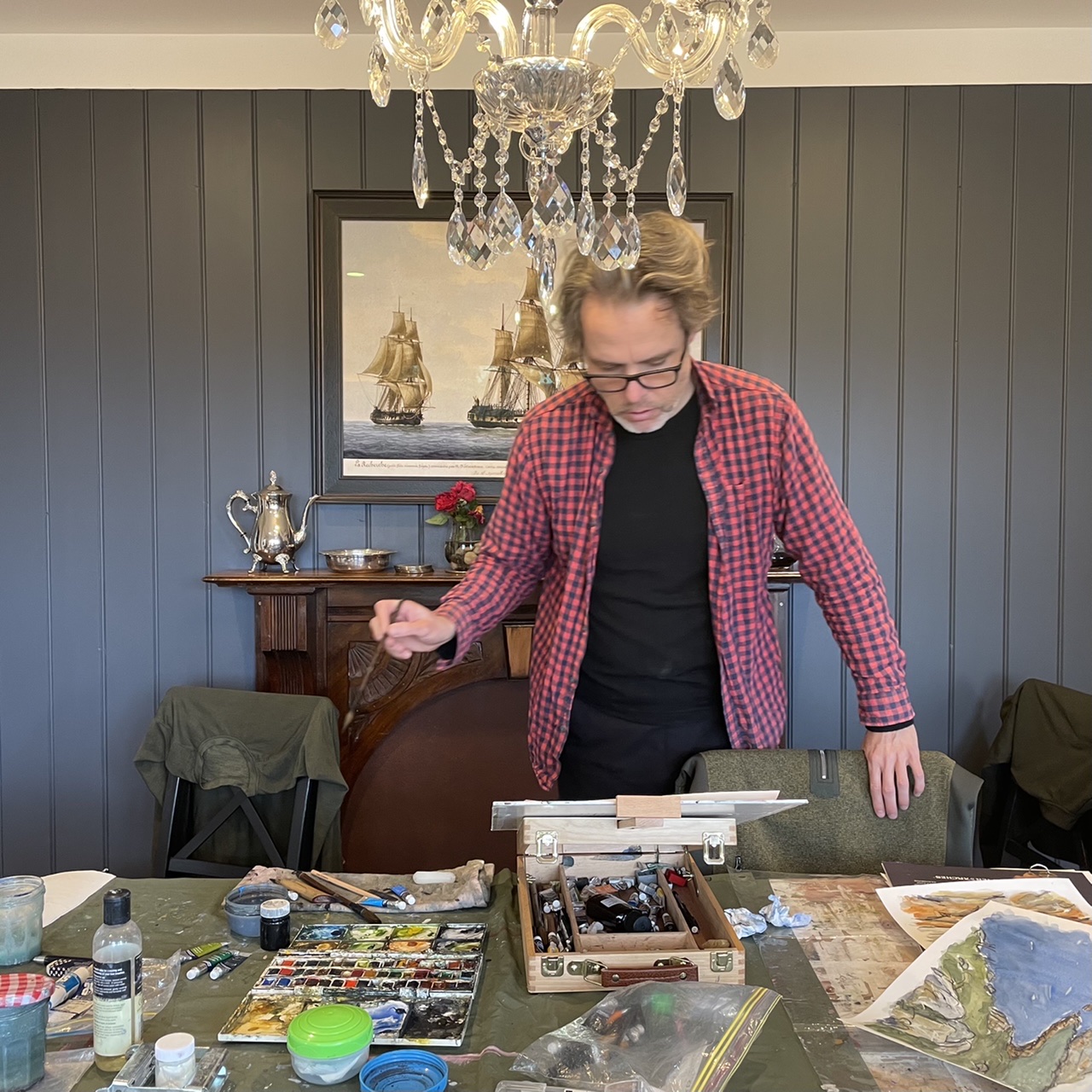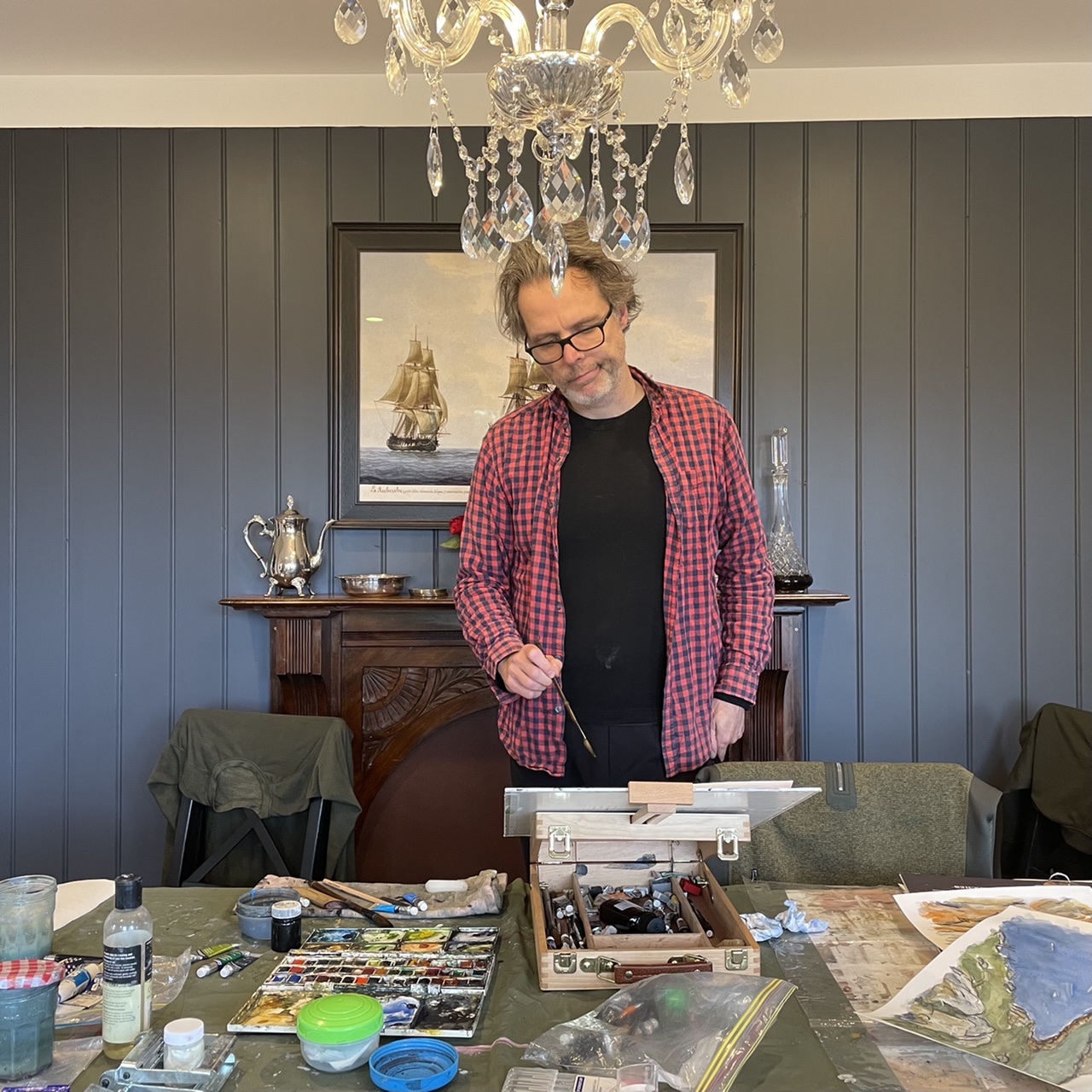 We made good use of the huge dining table, it was such a relief to leave the studio set up each night and come down in the morning. I was busy working on an oil painting of the Hazards in Coles Bay, and Dave had fun experimenting with watercolour, practising being “fast and loose” as Debbie Mackinnon would say.