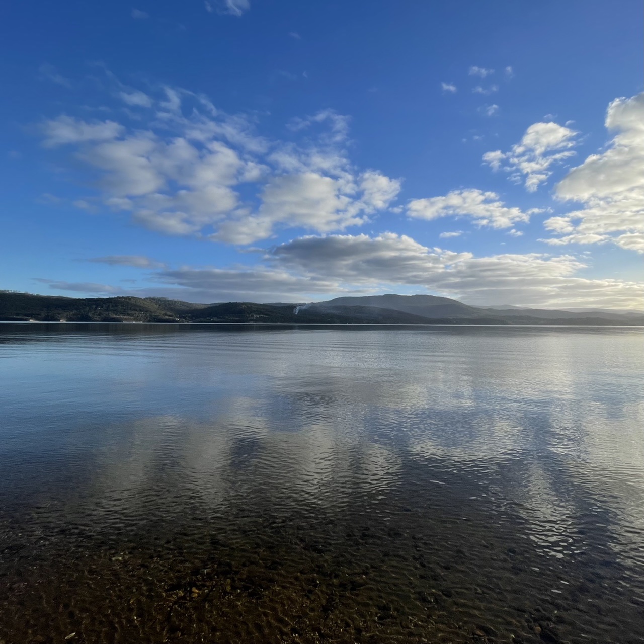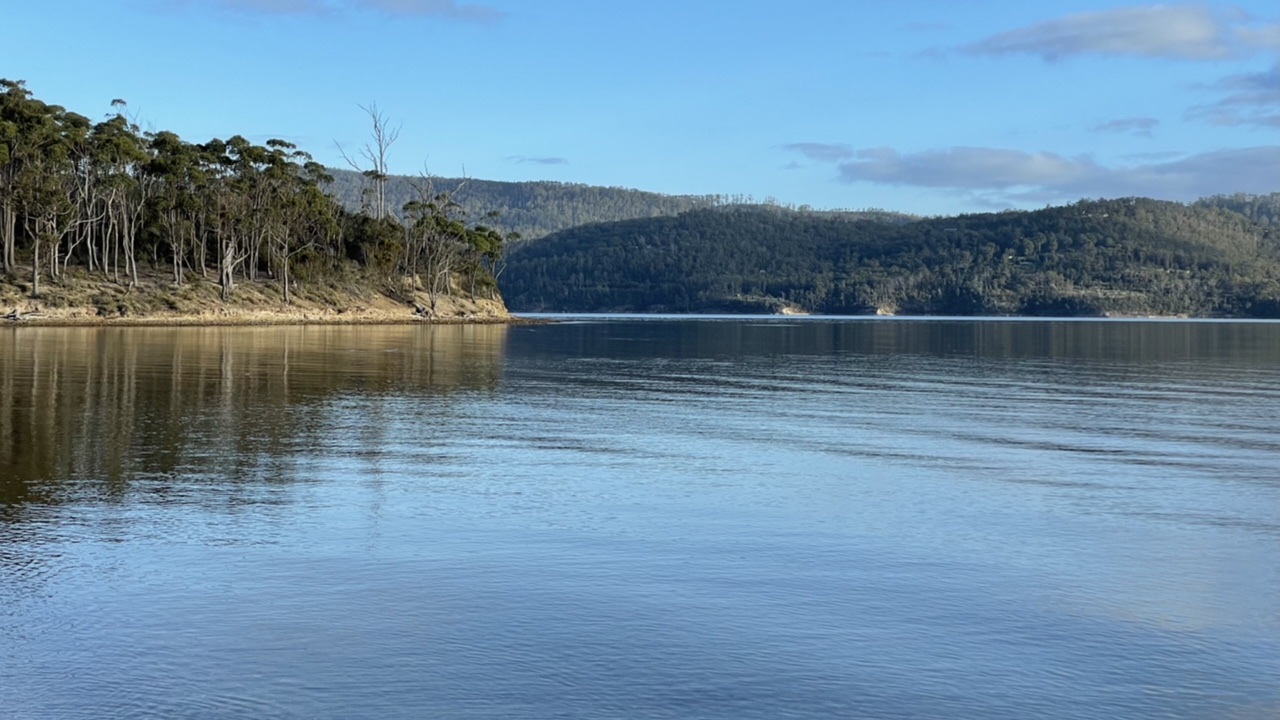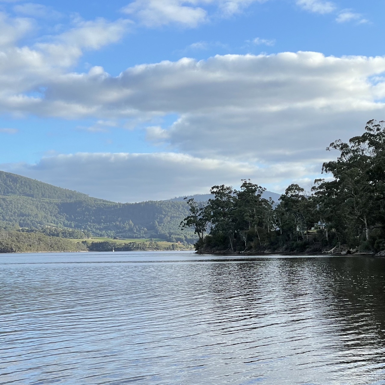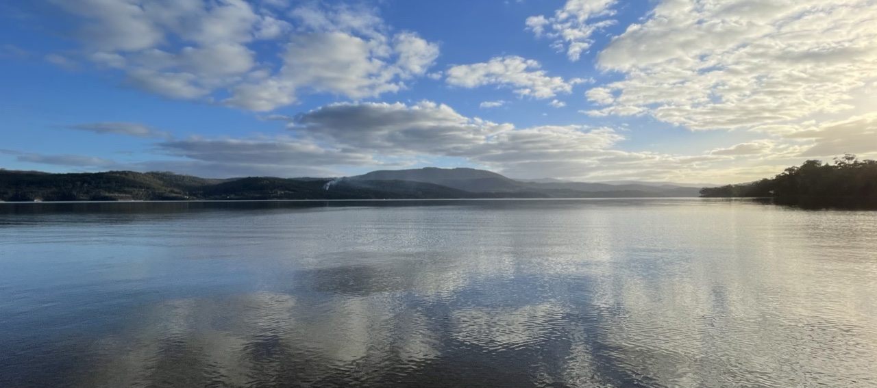 The Huon is a broad, crystal clear, fast flowing river. Some days it looks blue, others it reflects the surrounding hills, dark and inky.