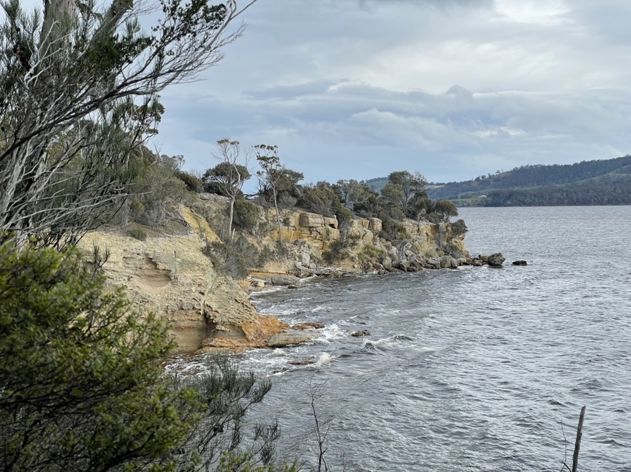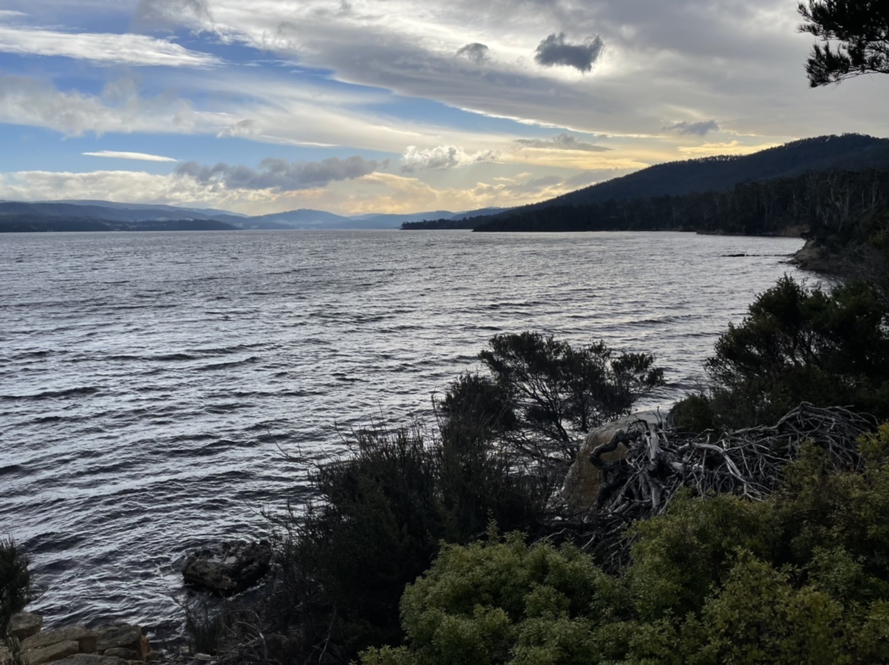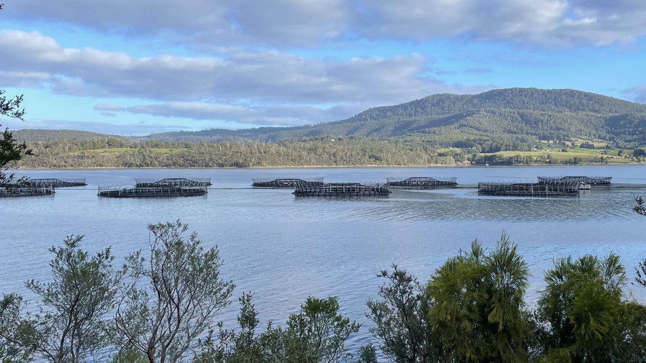 Further along, and we passed a section of Tassell’s salmon cages out in the river. I have mixed feelings about seeing this. On the one hand, we love hot smoked salmon and have been eating it for years. On the other hand, there appears to be damning evidence for the ecological damage done by farming Atlantic salmon in Tasmanian waters. I resolved to research the most sustainable salmon farmers.
