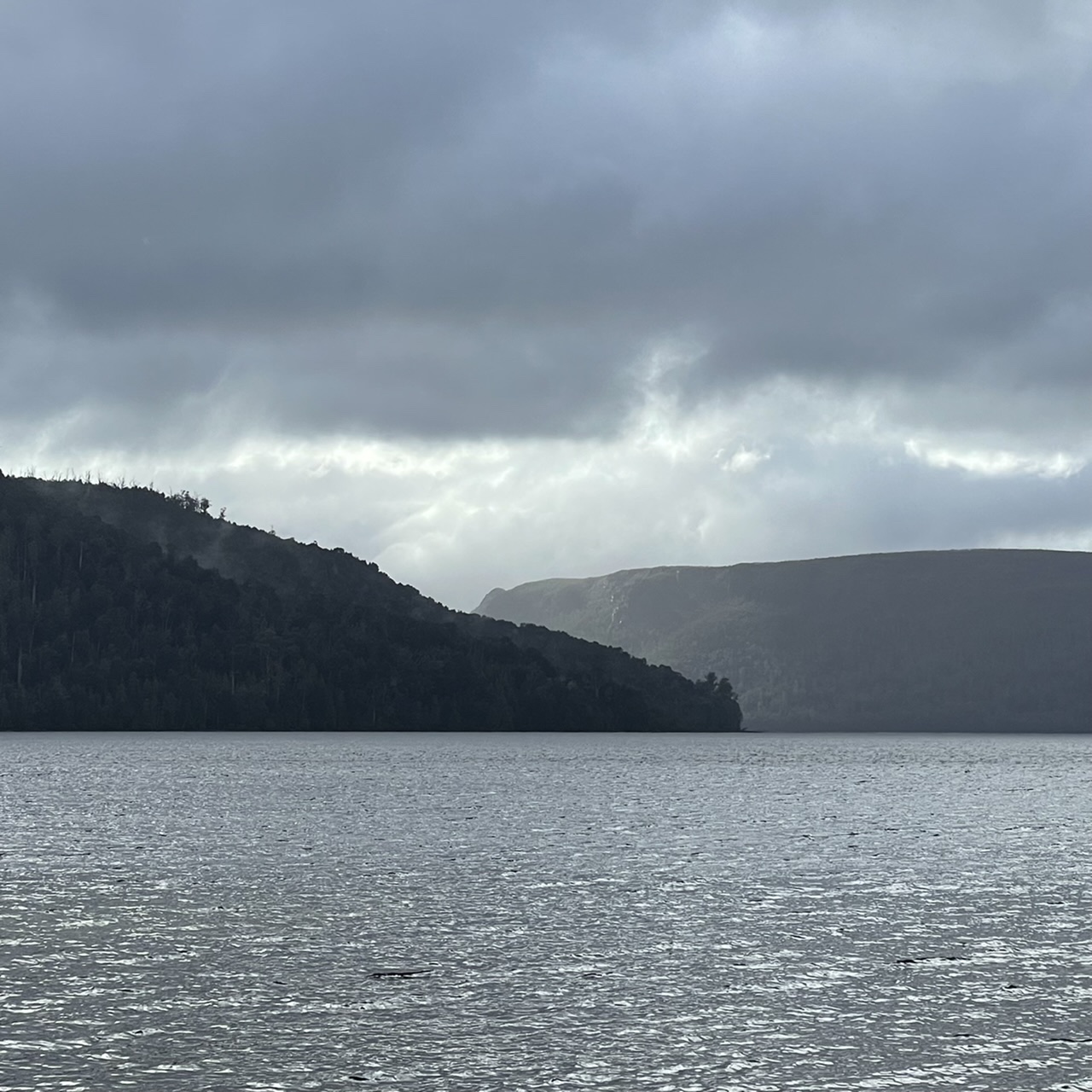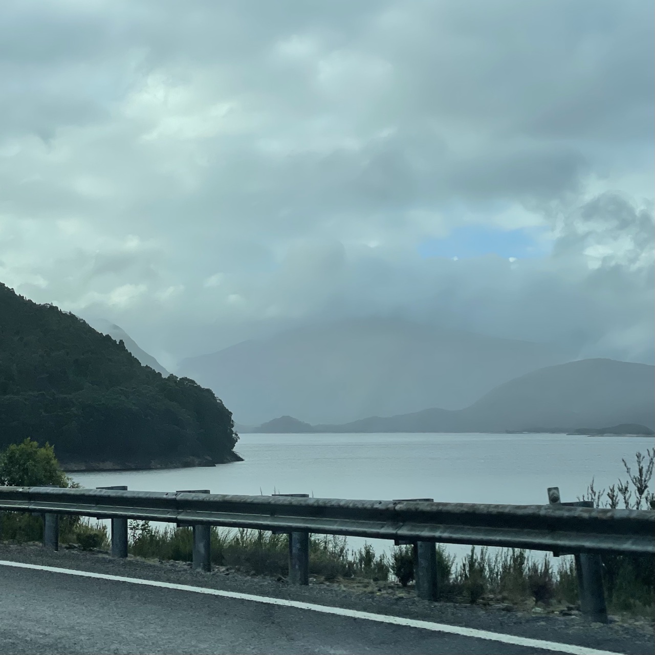 Approaching Lake Burbury was particularly dramatic. The road ran between the base of mountains and the lakeshore. I wanted to pull over, but there were no lookouts on route.