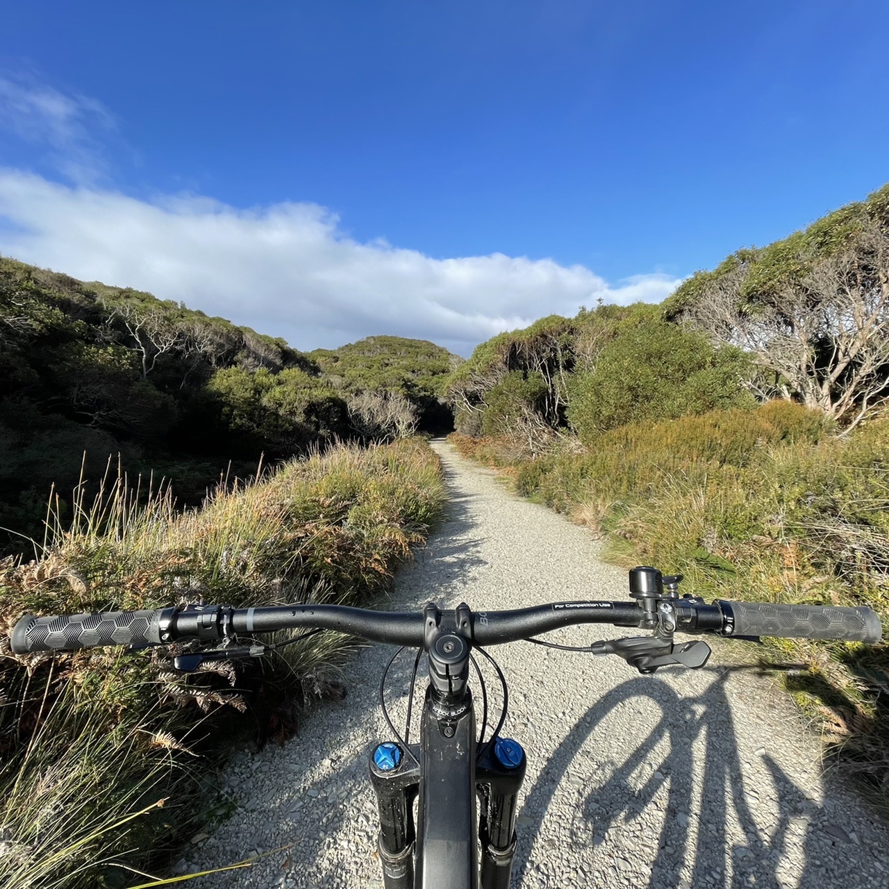 Yesterday, we’d popped into the visitor centre for info on local walks and the ranger mentioned the trail to ocean beach was also a MTB trail. Excellent!