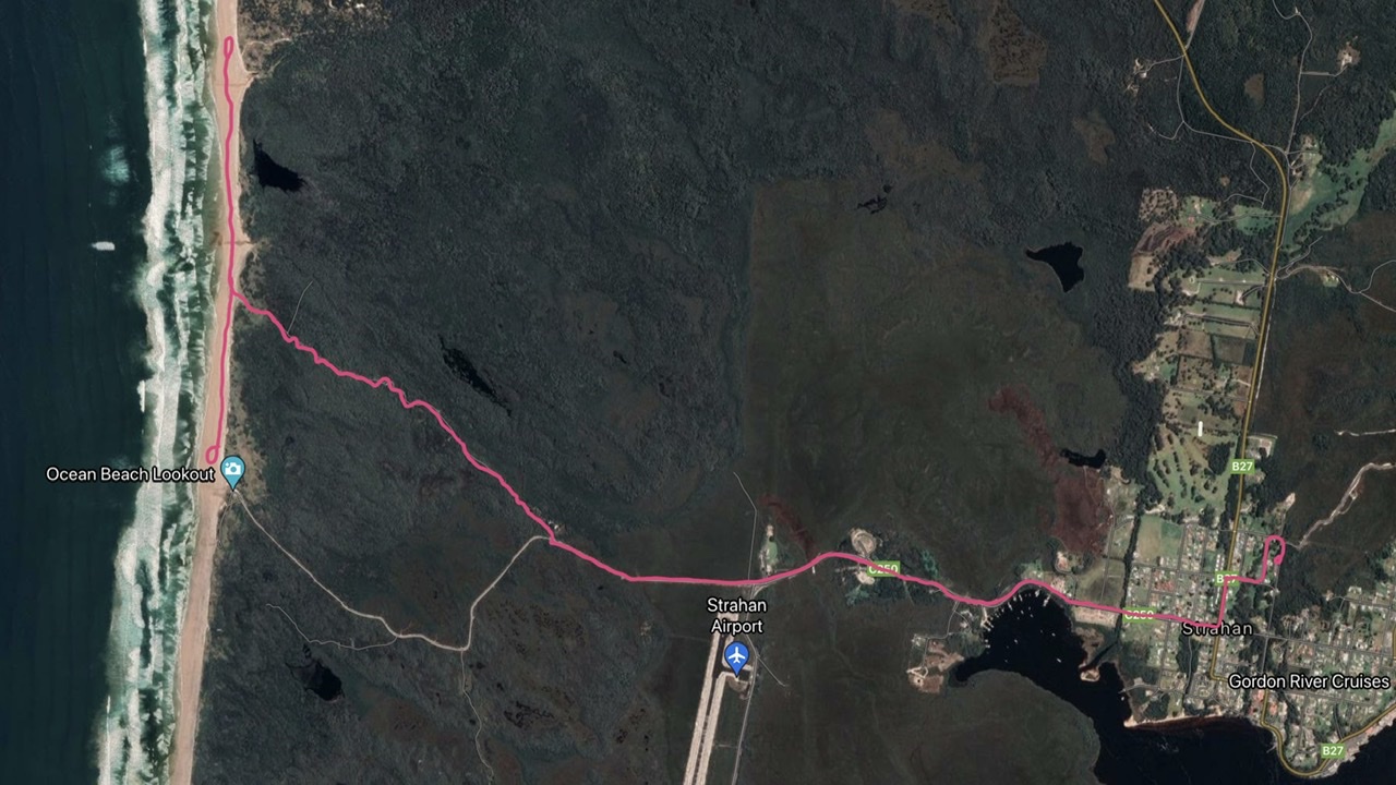 The road headed steeply out of town before turning onto a dirt road at the top of the hill, where Dave was waiting for me. Passing an airstrip set into low coastal heath, the dirt track continued for a few kilometres.