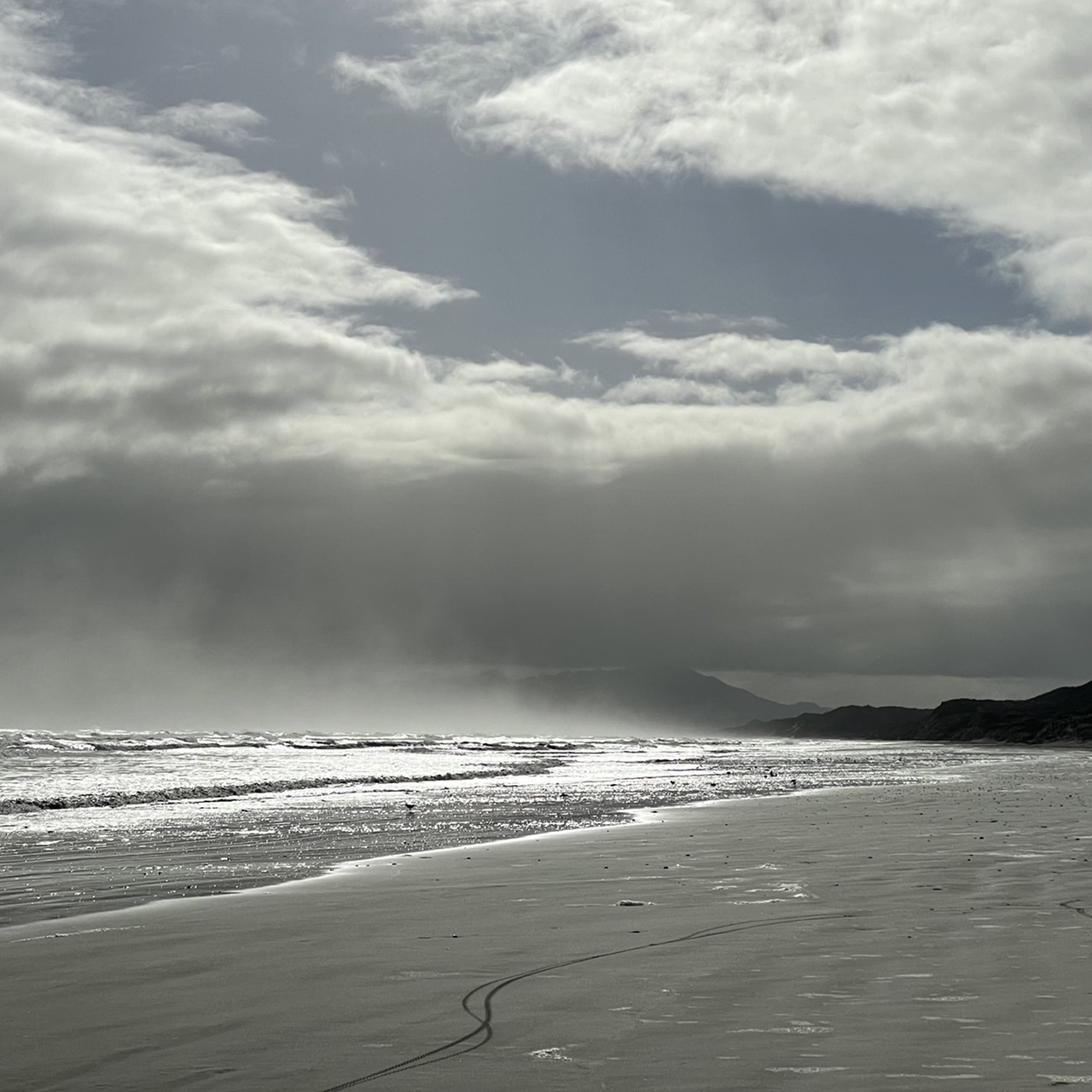 Riding out onto the broad and deserted beach (Tasmania’s longest) was exhilarating. Looking north, the sea shimmered silver in the winter sun and the dunes stretched out to the horizon beneath pale distant mountains.