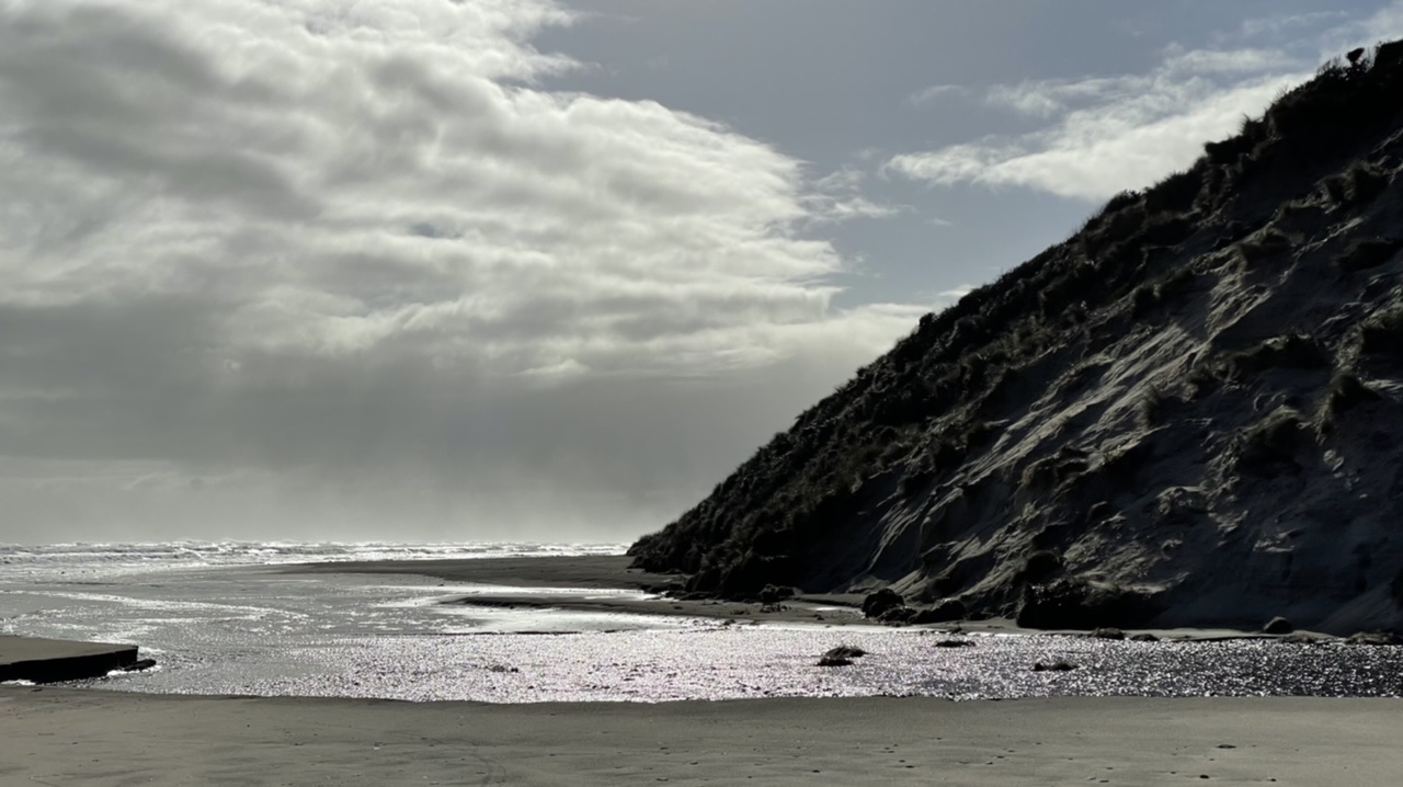 Riding with one hand and filming with the other, I wanted to remember this feeling. I approached a toffee coloured creek flowing into the ocean and kept filming while riding one handed. I had a bit too much speed, and ended up riding through a fairly deep section. Freezing cold water sprayed everywhere. Up into the crank shaft and drive chain, up my legs; into my shoes. And I squealed like a girl. Chuckle.