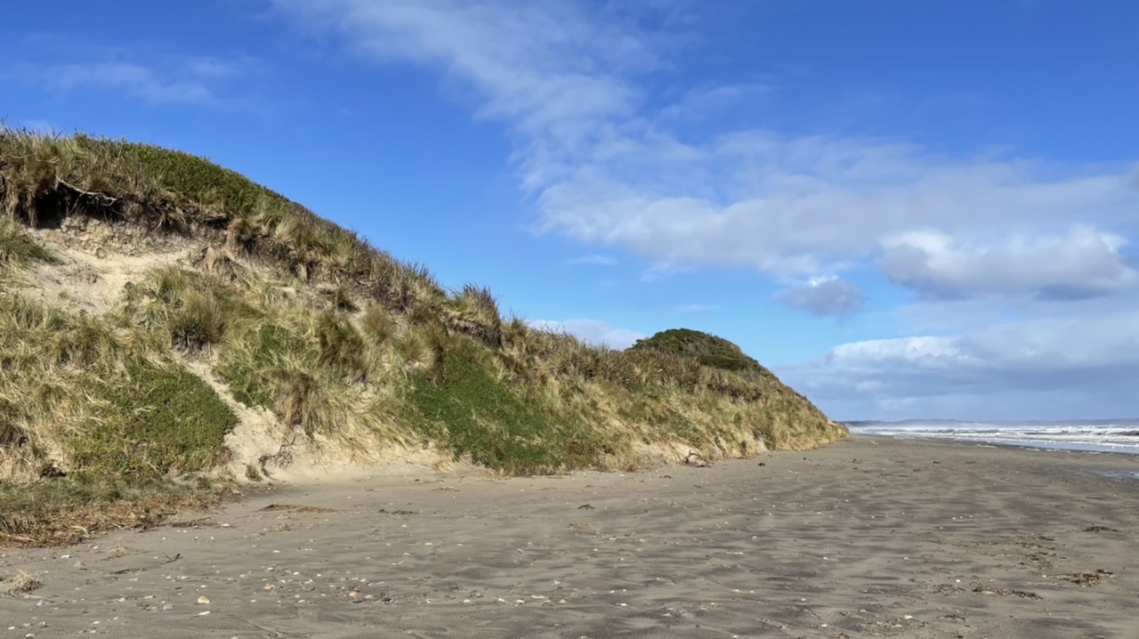 The sound of the sea crept through the forest and abruptly revealed itself at the top of a rise in the trail. We dropped down a final hill and rolled to the end of the trail on the grassy dunes.