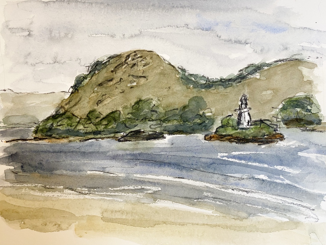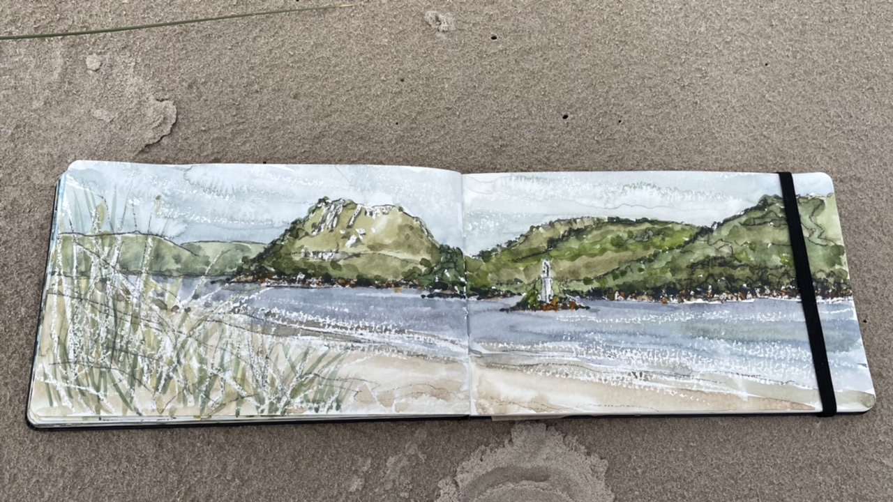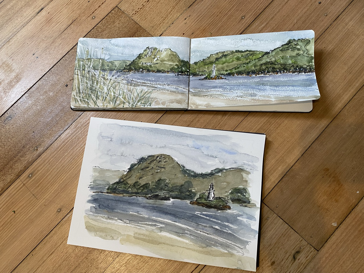 In the mood for a creative day, we packed our watercolour sketching kit, jumped aboard Kenny and drove out to Macquarie Heads, where the Gordon River meets the Ocean.