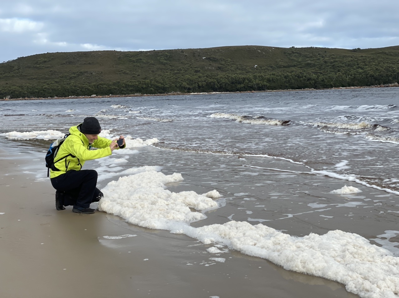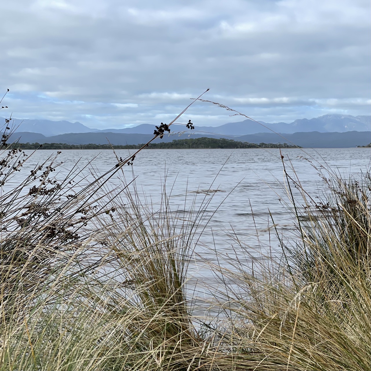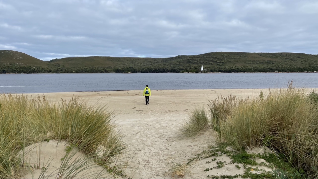 Emerging through the dunes, we found ourselves on the banks of the tea coloured Gordon River. The Bonnet Island Lighthouse stood out in bright white against the dark water and headland.