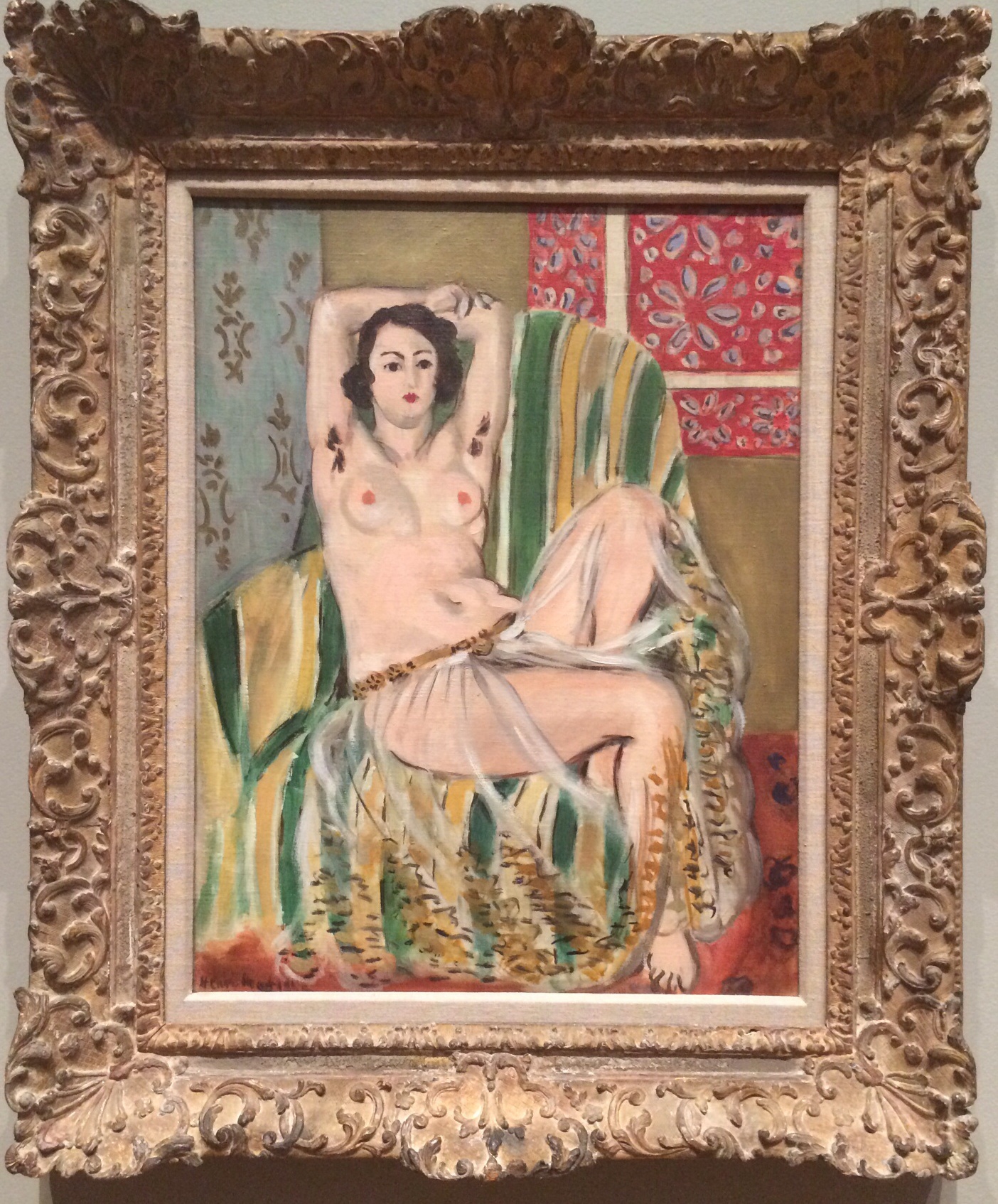 Odalisque Seated with Arms Raised Published October 8, 2014 at 1404 × 1694 Henri Matisse, 1869-1954. Oxalis qui, Seated with Arms Raised, Green Striped Chair, 1923.